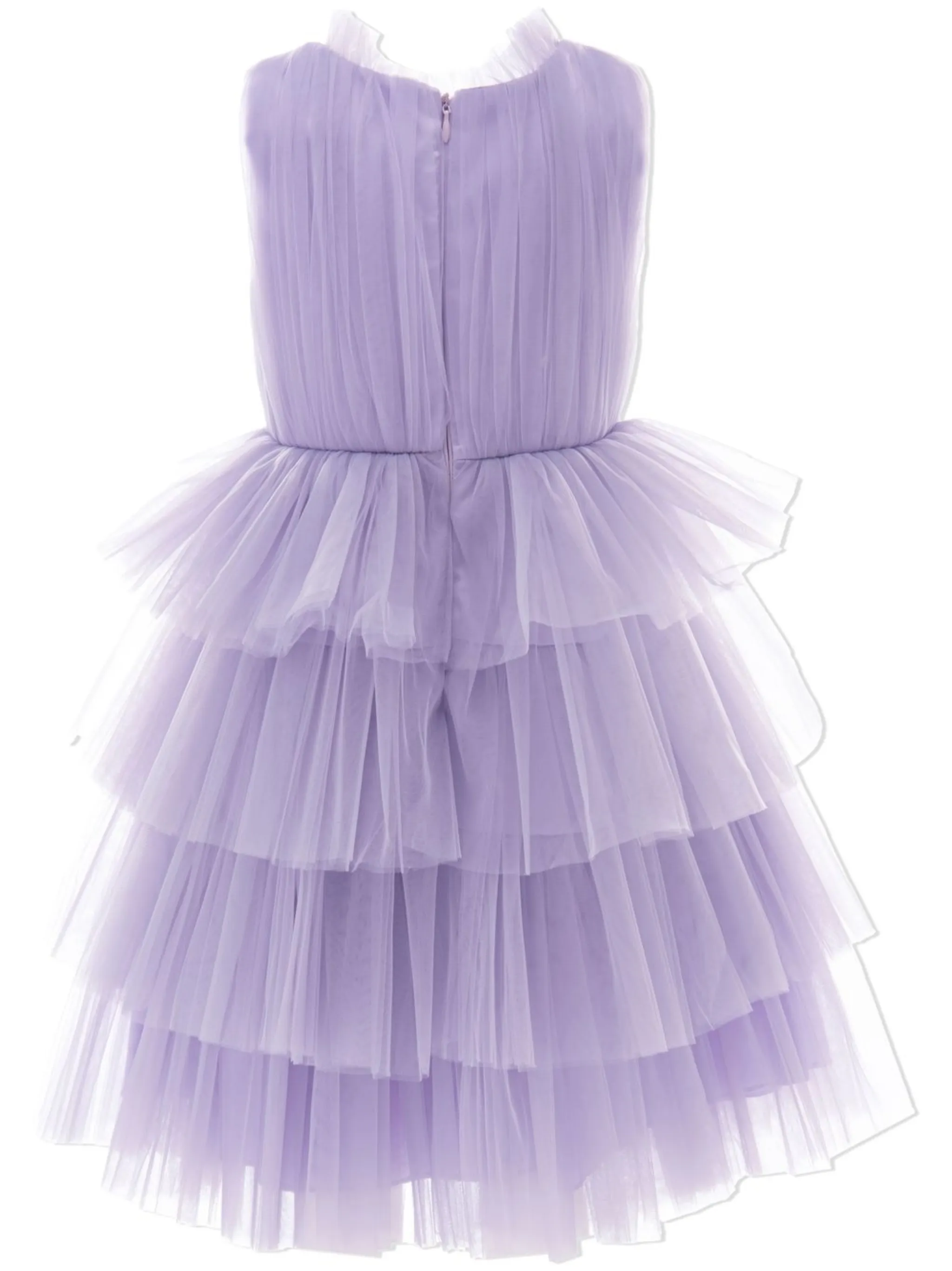 Лавандовый, хлопок, верхний слой из тюля, высокий присборенный воротник, без рукавов и ярусная юбка.
