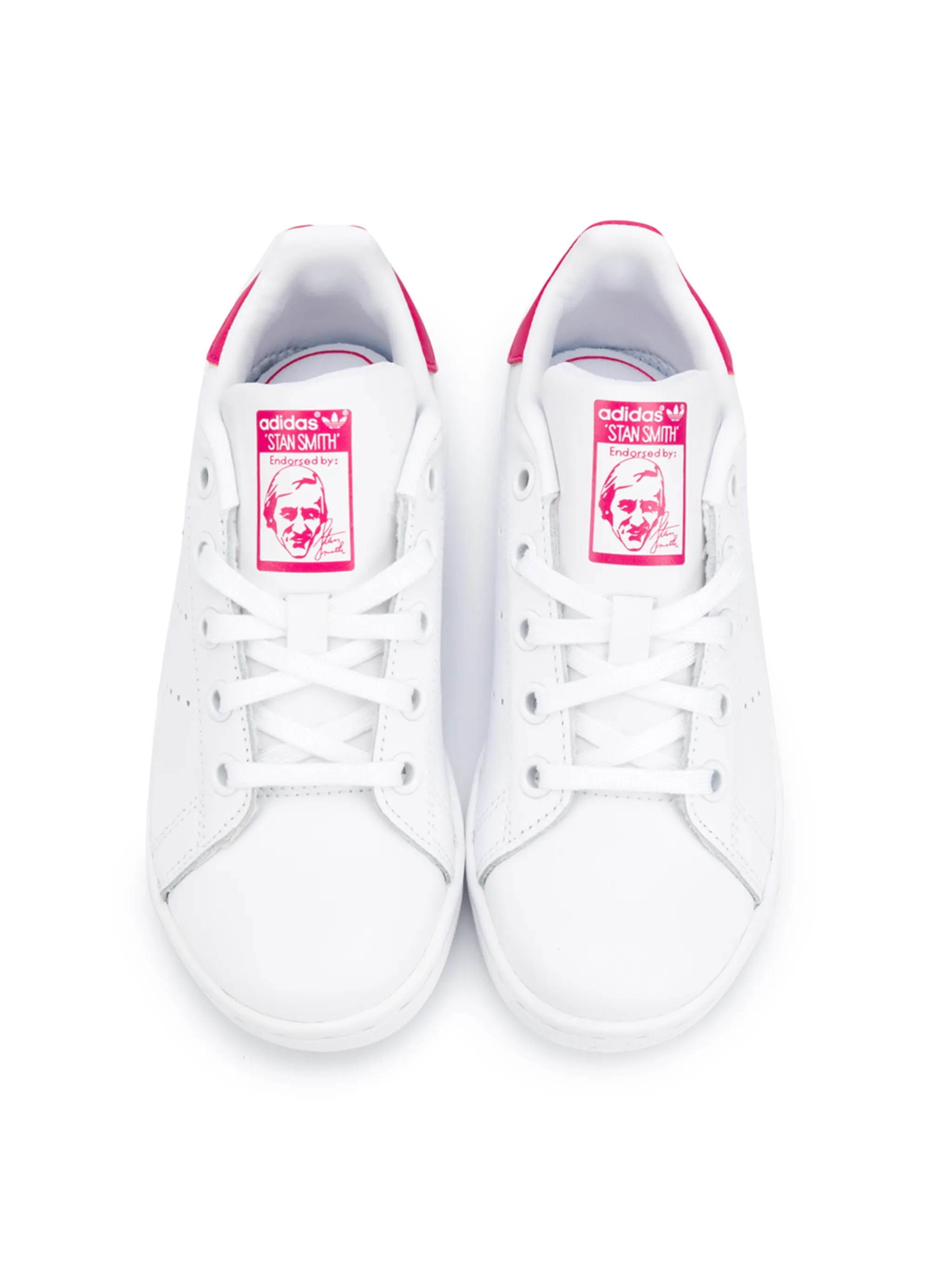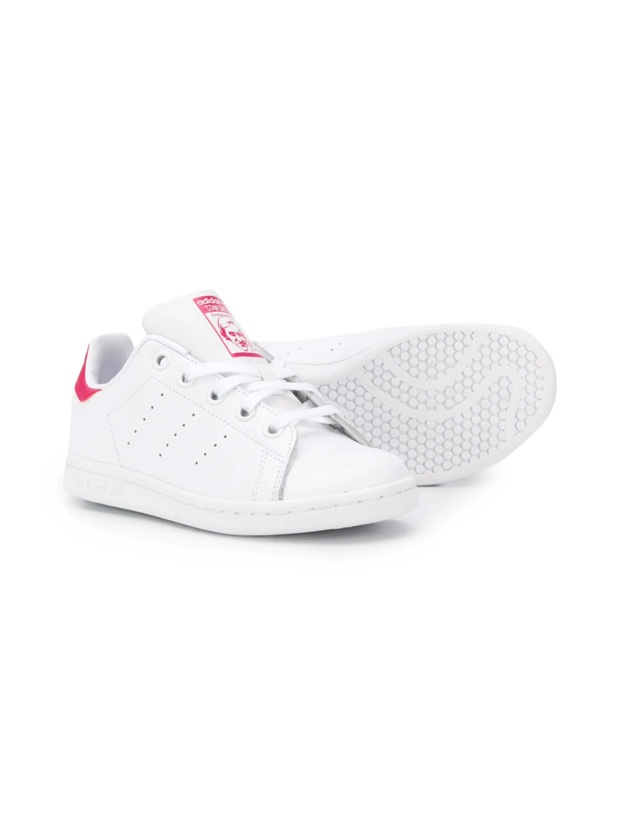Кроссовки Stan Smith от Adidas Originals Kids. Закругленный носок, шнуровка спереди, контрастная стойка на каблуке, язычок с логотипом, фирменная стелька и плоская резиновая подошва. Цвет: белый, розовый.