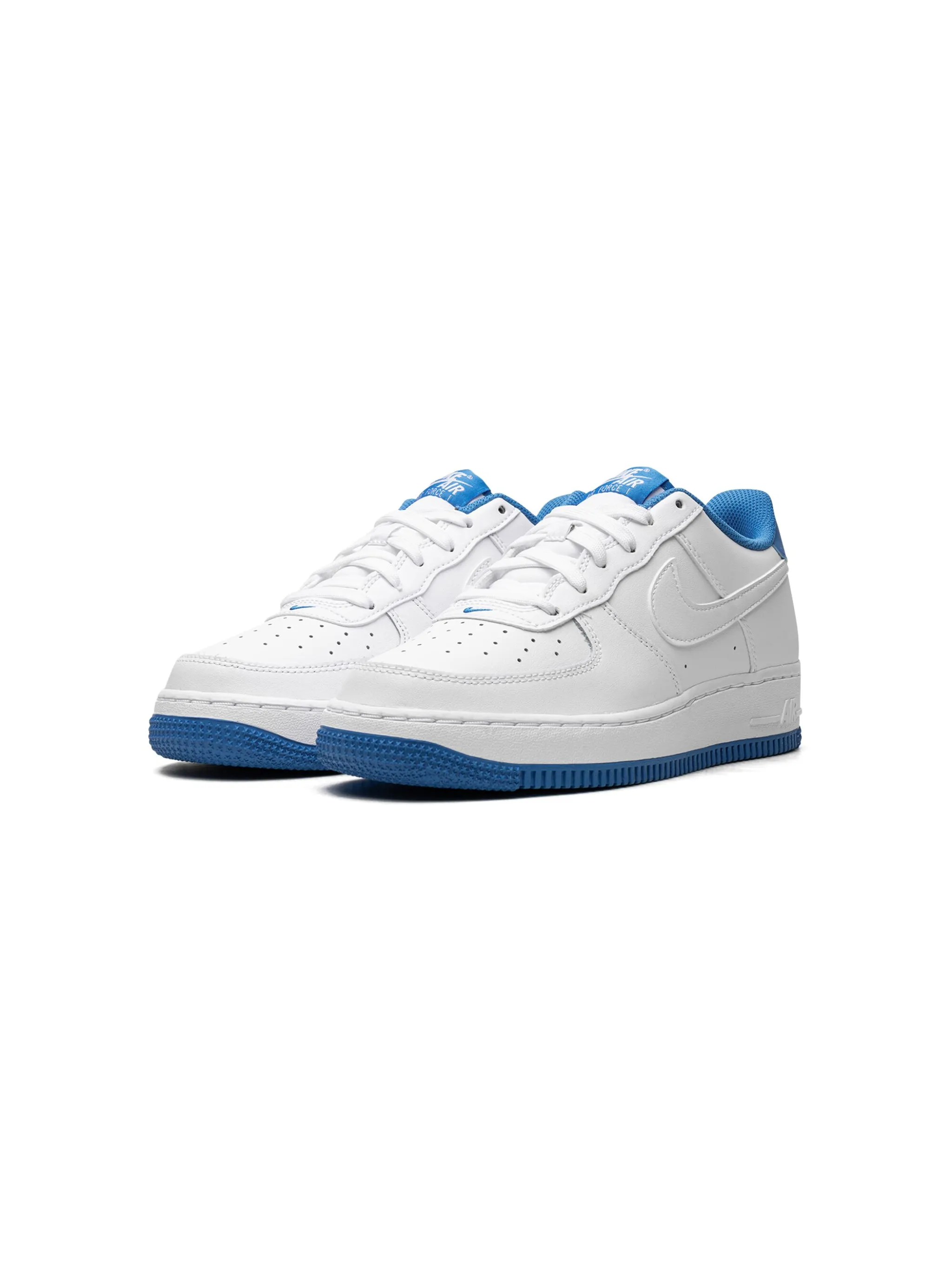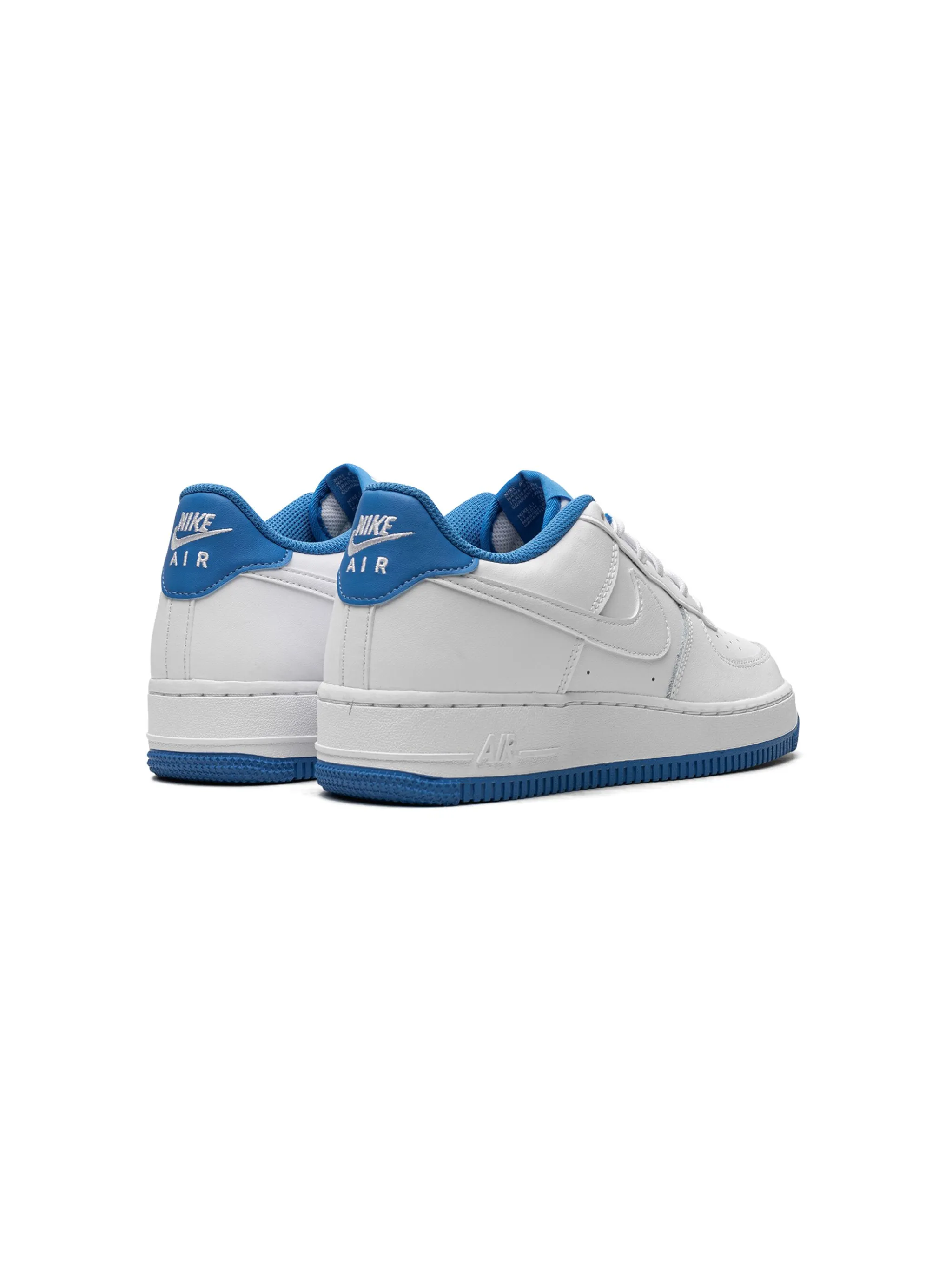 Белый, синий, кожа, логотип Nike Swoosh, вышитый логотип сзади, закругленный носок, шнуровка спереди, нашивка с логотипом на язычке, стелька с логотипом и резиновая подошва.