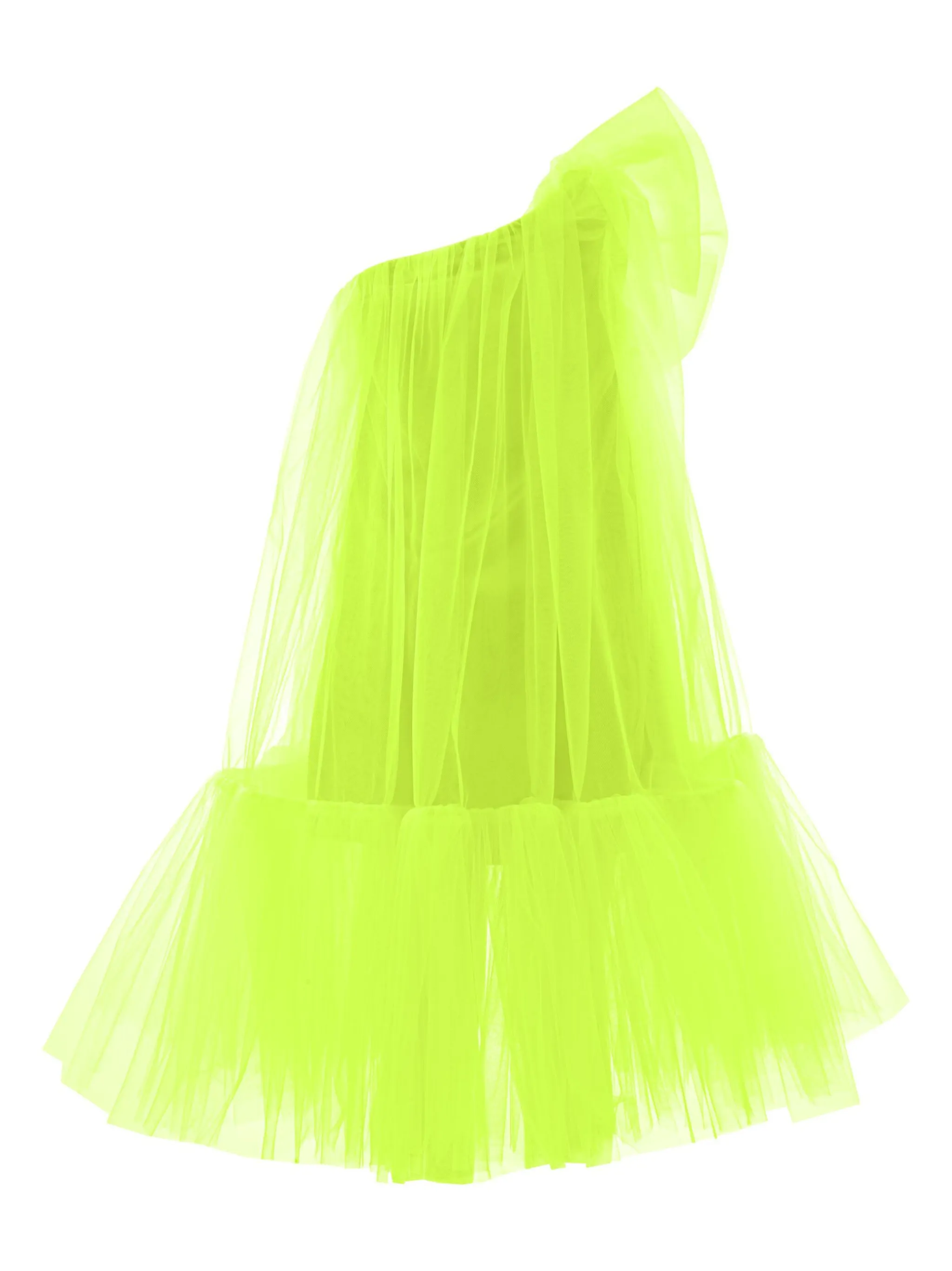 Неоново-зеленый, крупный бант, верхний слой из тюля, внутреннее платье-комбинация, открытые плечи, без рукавов, ярусная юбка и подол с оборками.