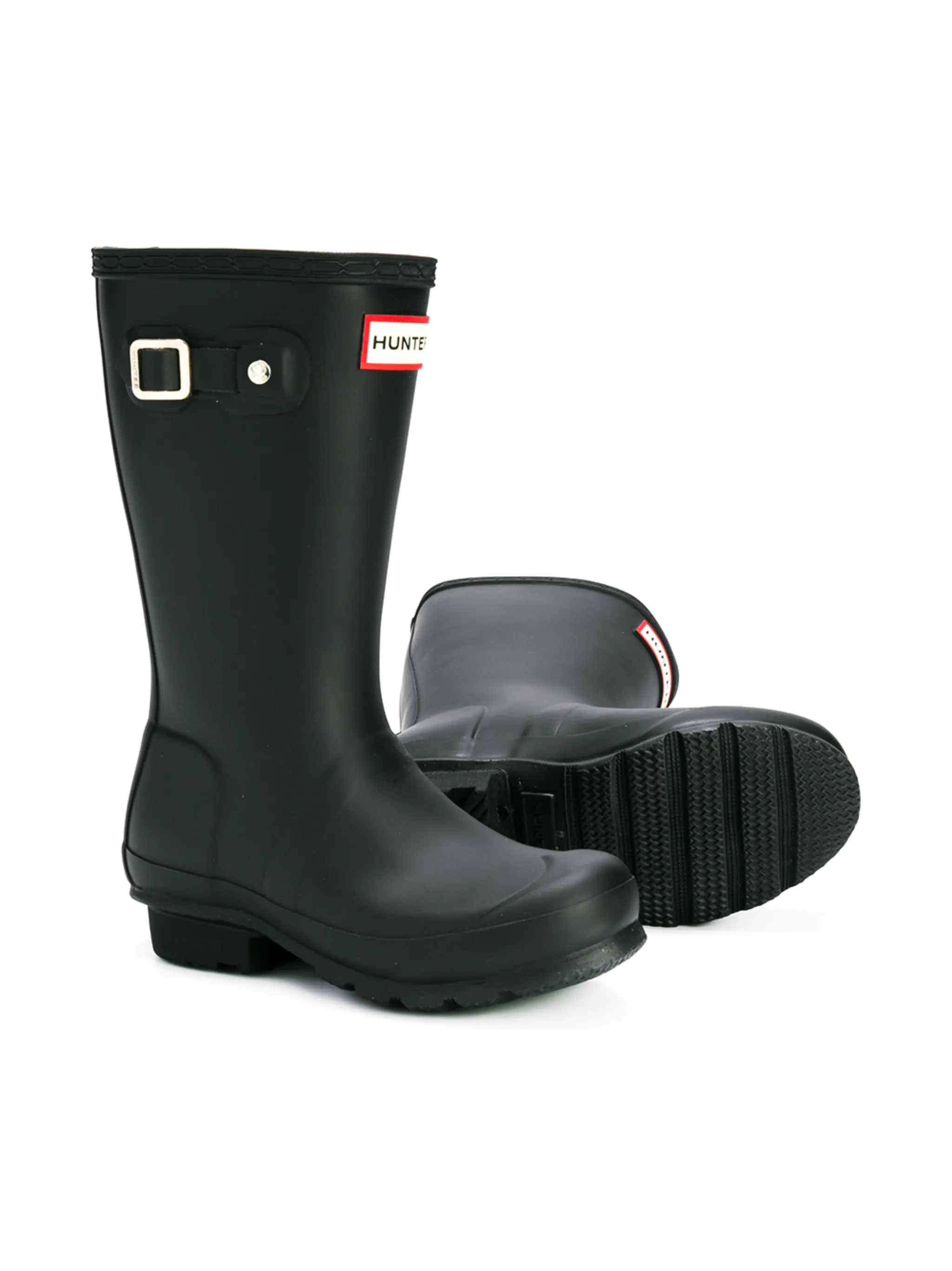 Черные резиновые сапоги от Hunter Kids. Длина до середины голени , модель слип-он, без застежки, детали с пряжкой, заплатка с логотипом спереди, закругленный носок, толстая резиновая подошва.