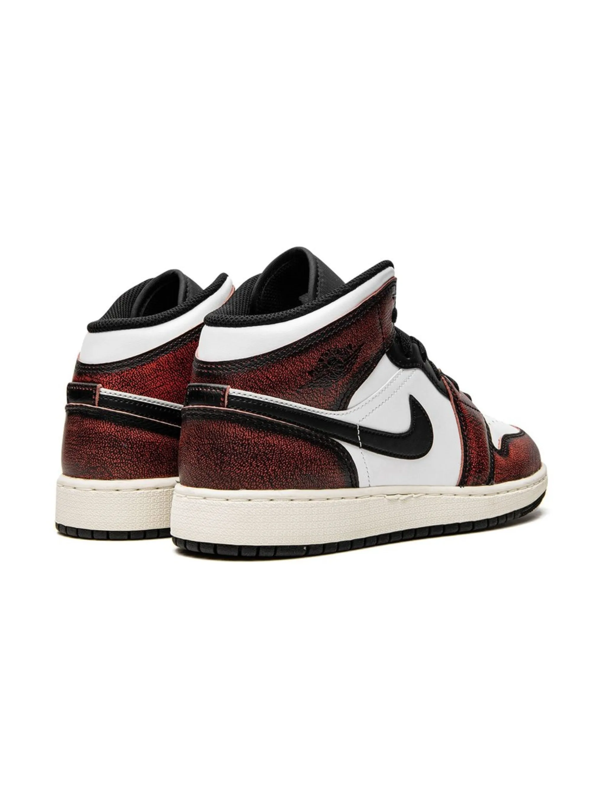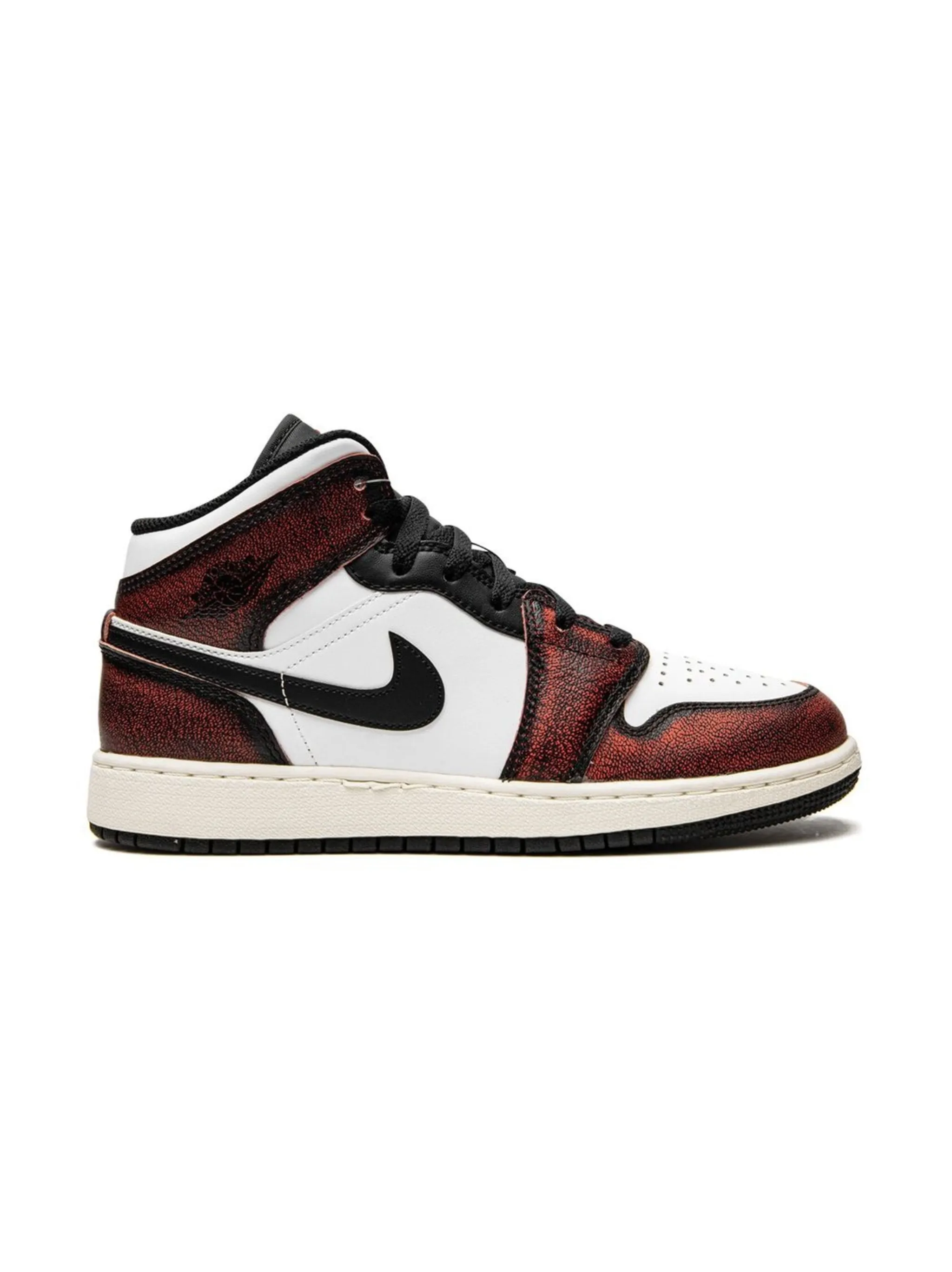 Белый, черный, красный, кожа, логотип Nike Swoosh, логотип Air Jordan Wings, закругленный носок, шнуровка спереди, нашивка с логотипом на язычке, высота по щиколотку, стелька с логотипом и резиновая подошва.