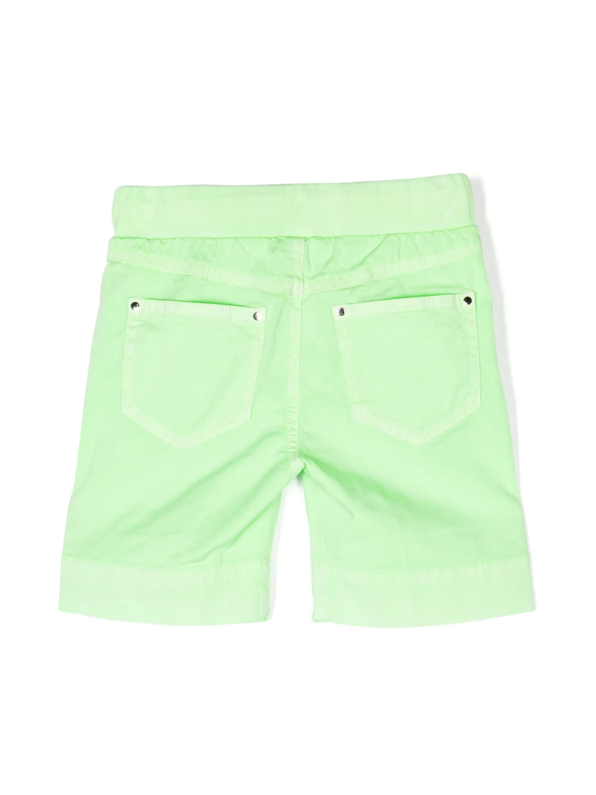 Флуоресцентный зеленый, эластичный хлопок, деним, маленькая подвеска с логотипом, кулиска на талии, два кармана по бокам и два накладных кармана сзади.