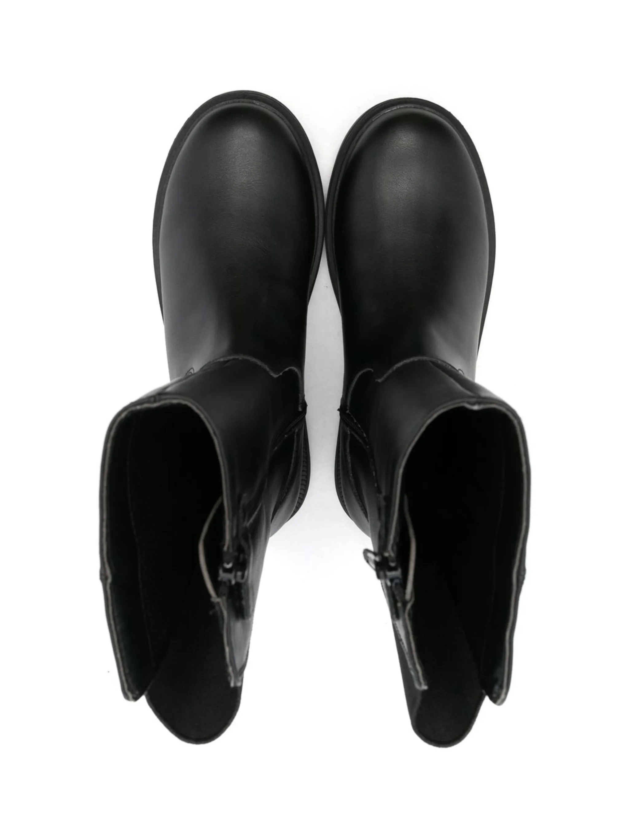 Черный, искусственная кожа, закругленный носок, застежки на молнии сбоку, съемная стелька, цельная подкладка, длина до середины икры и резиновая подошва.