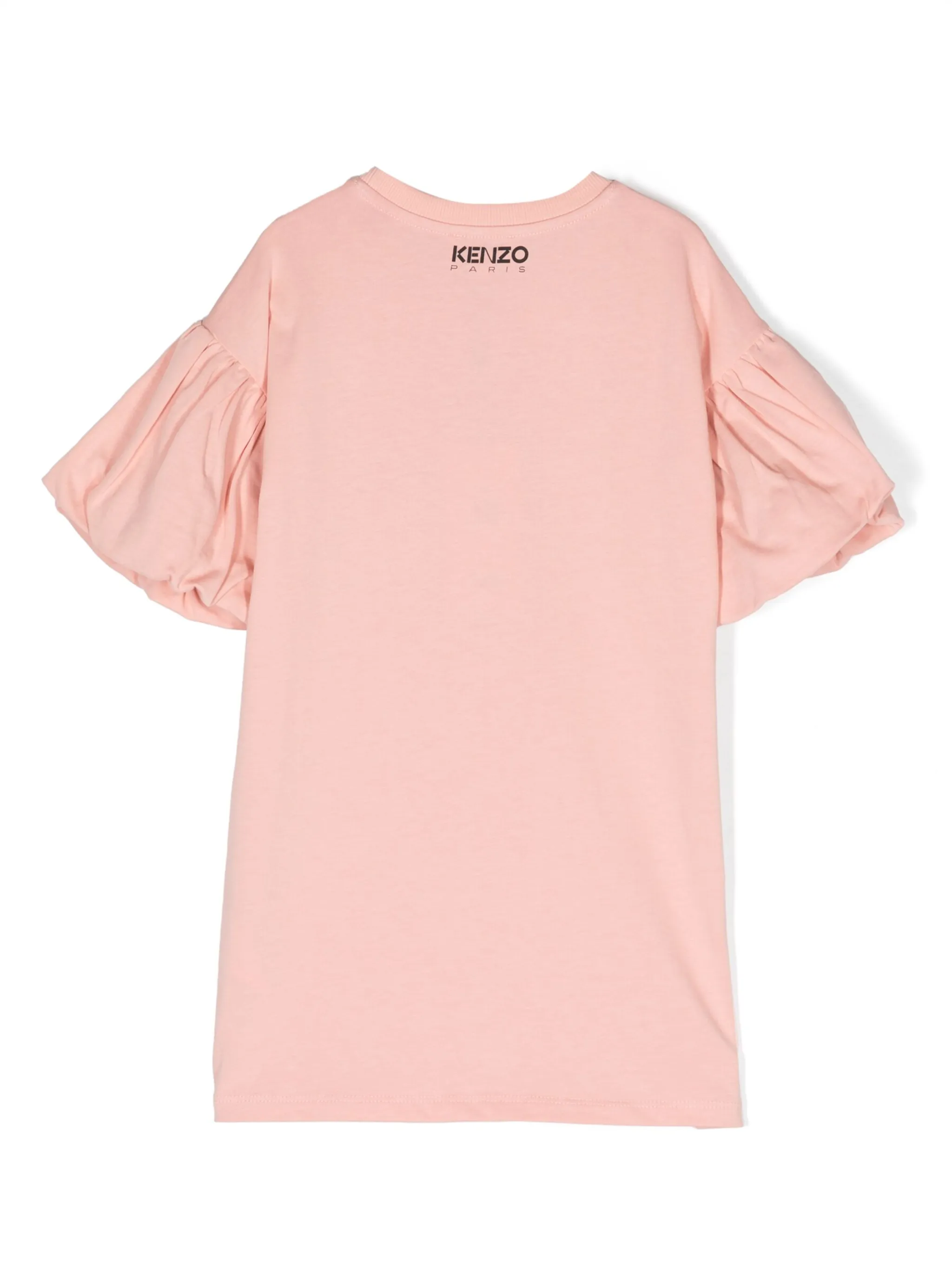 Светло-розовый, хлопок, графичный принт спереди, принт с логотипом сзади, круглый вырез, короткие объемные рукава и прямой подол.