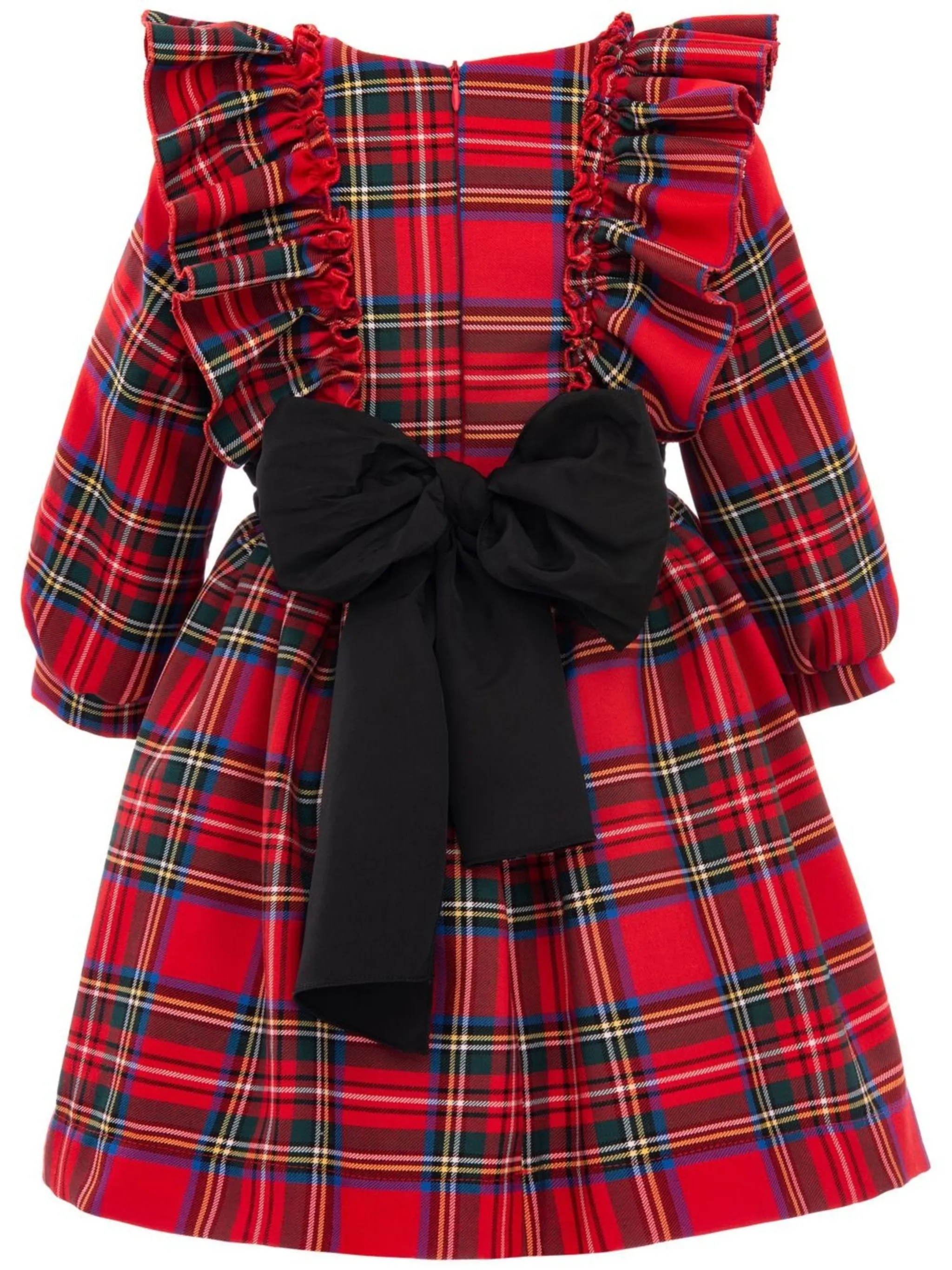 Красный, хлопок, принт в шотландскую клетку, круглый вырез, вставки с оборками, длинные рукава, потайная застежка на молнии сзади, ремень на талии, бант и расклешенный крой.