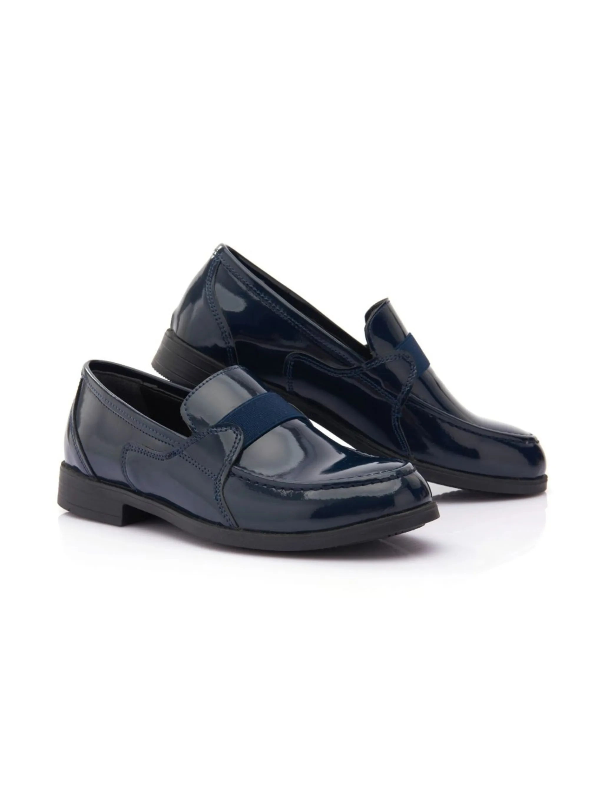 Темно-синий, лакированная кожа, кожа, стелька с логотипом, закругленный носок, модель без застежки и плоская резиновая подошва.