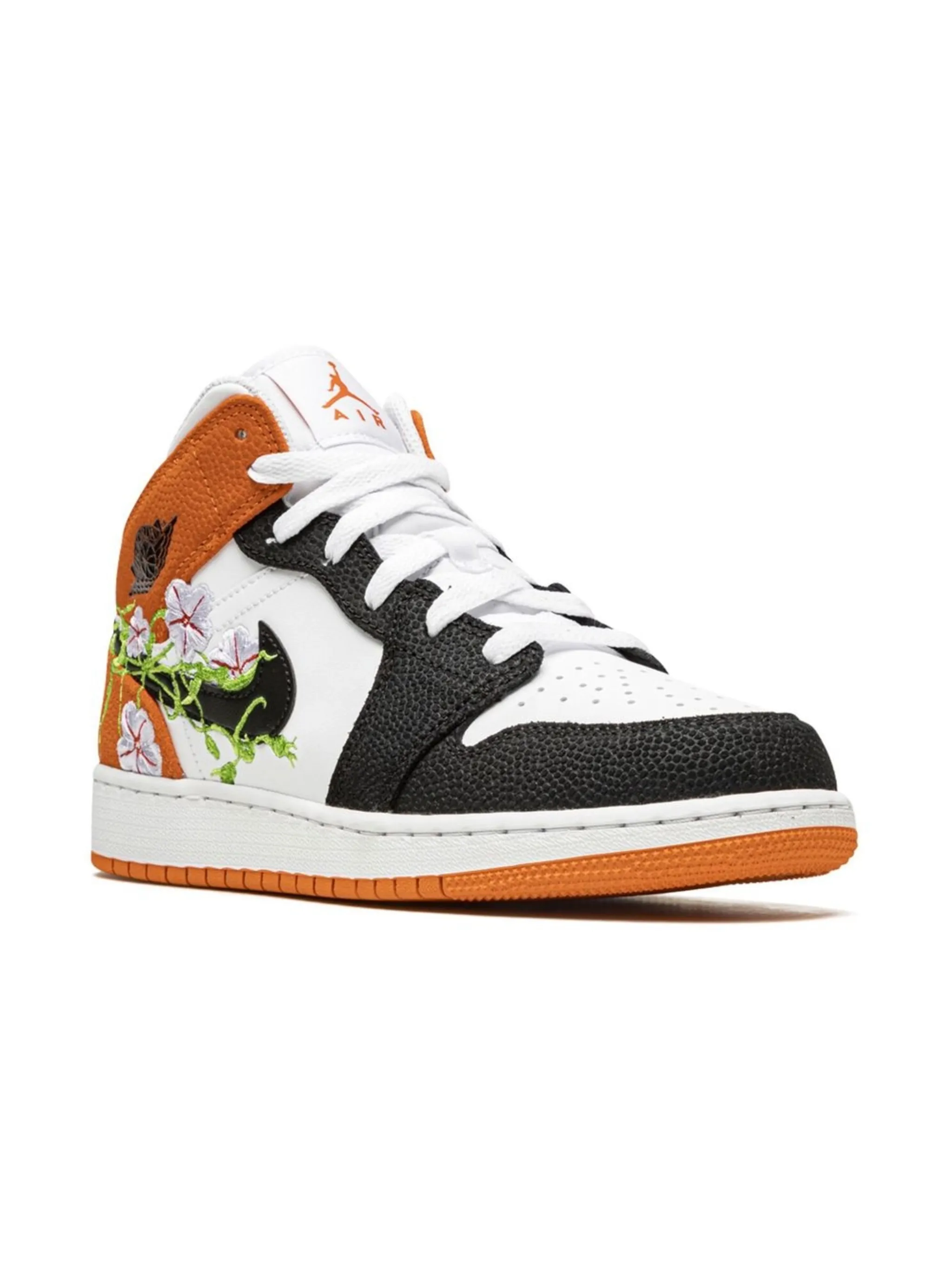 Телячья кожа, логотип сбоку, цветочная вышивка, логотип Nike Swoosh, нашивка с логотипом Jumpman на язычке, перфорированный носок, закругленный носок, шнуровка спереди и резиновая подошва.