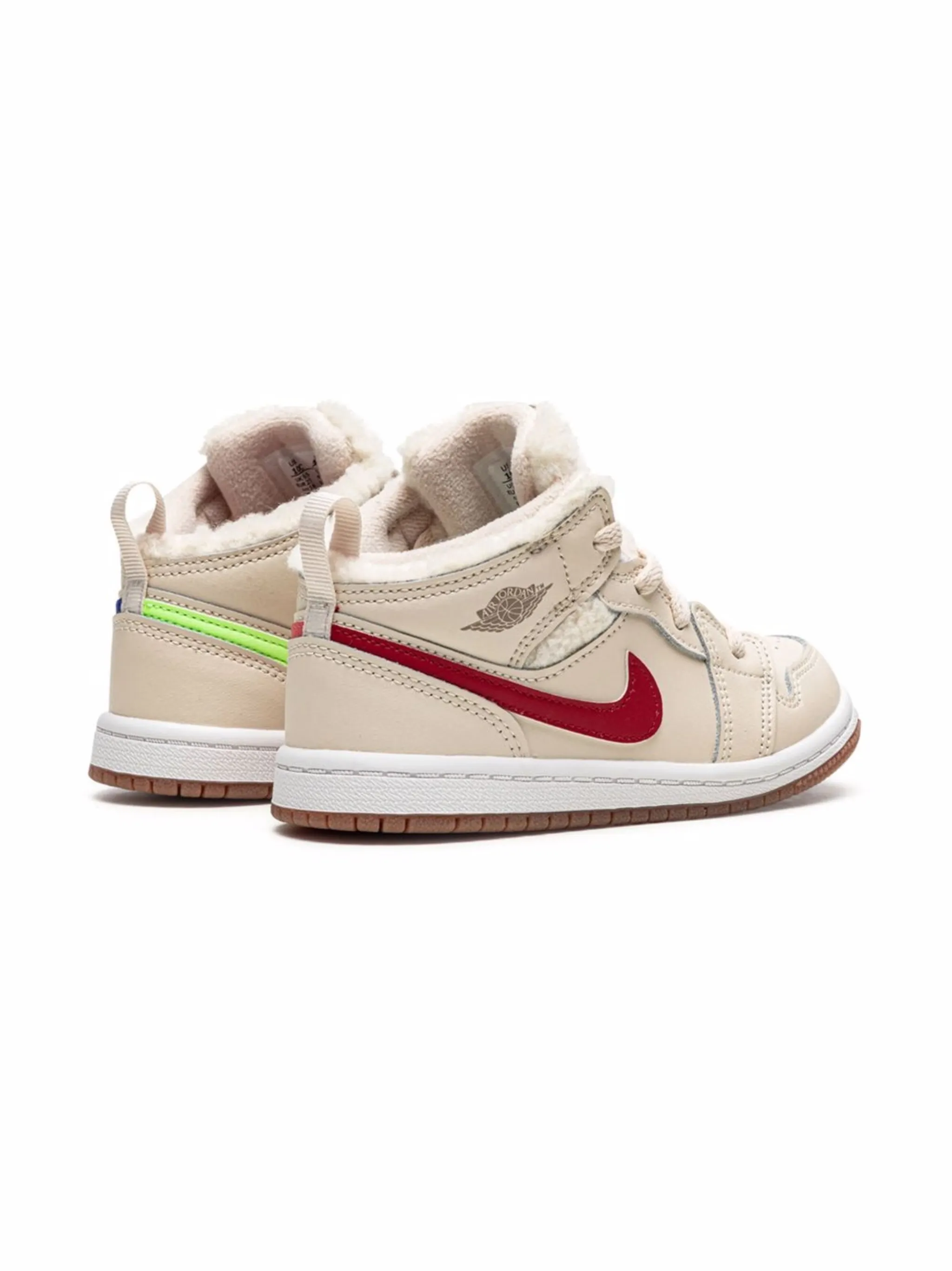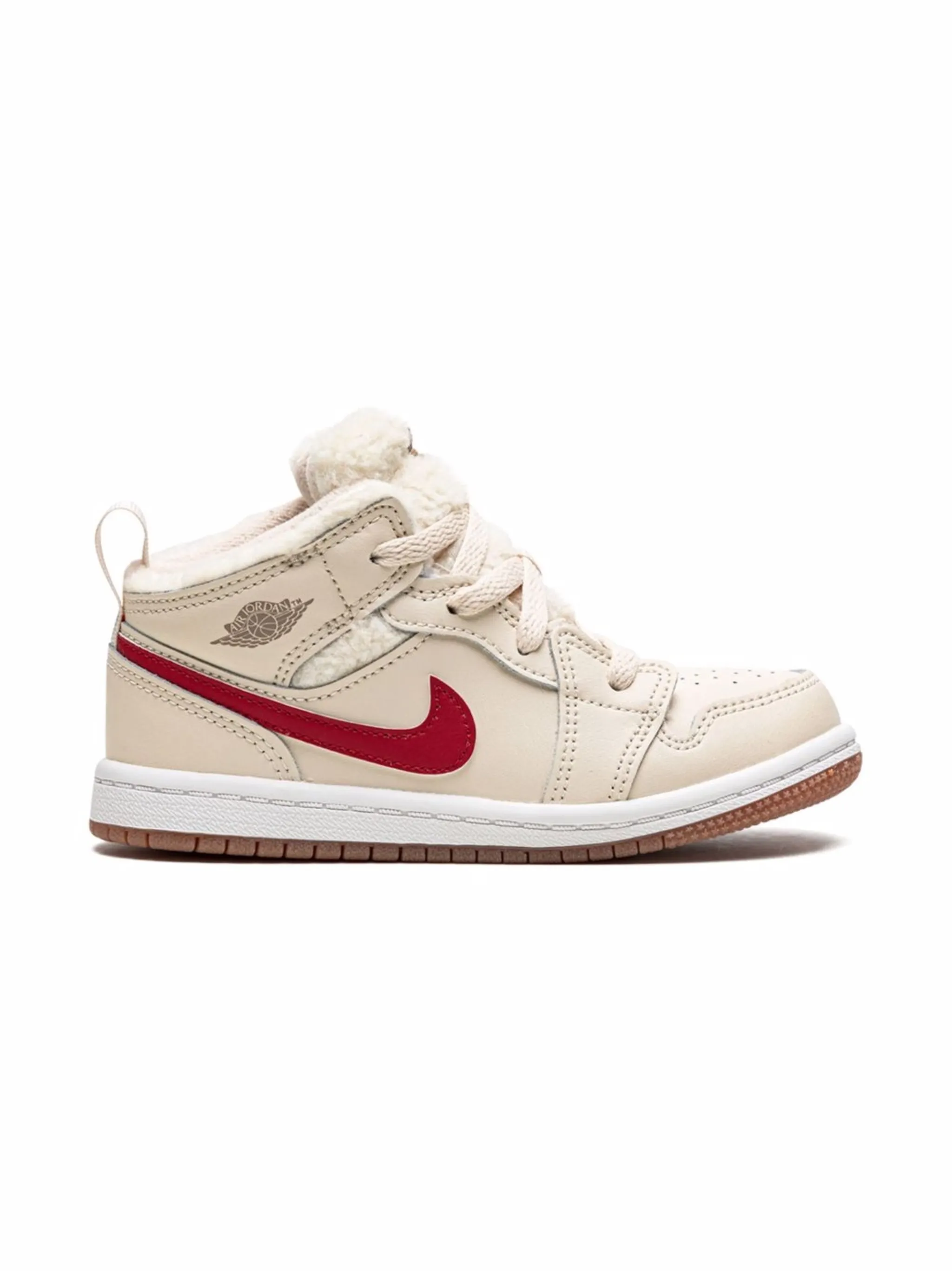 Логотип Air Jordan Wings, логотип Nike Swoosh, подкладка из искусственной овчины, закругленный носок, шнуровка спереди, нашивка с логотипом на язычке, петля для подтягивания сзади, стелька с логотипом и резиновая подошва.