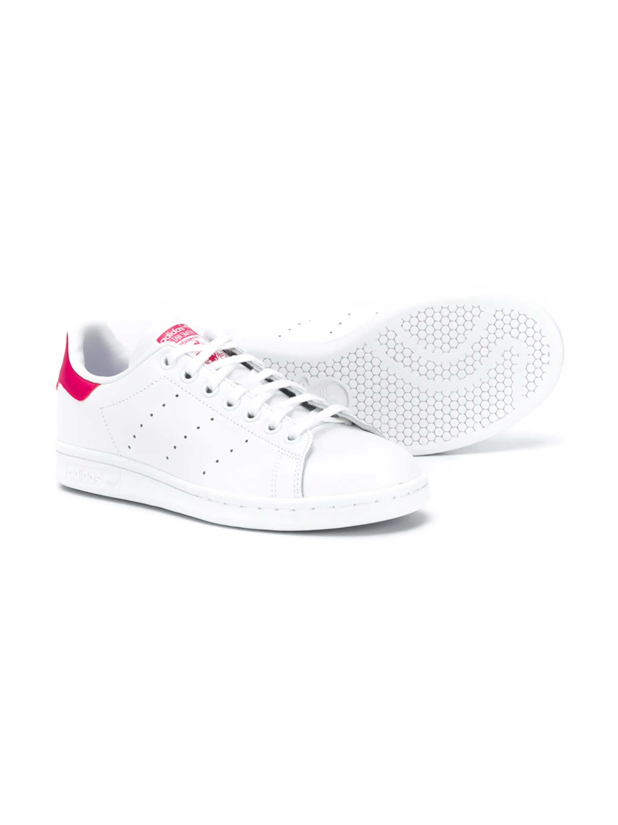 Кроссовки Stan Smith от adidas Originals Kids. Закругленный носок, плоская резиновая подошва, шнуровка спереди, контрастная стойка на каблуке, декоративная перфорация и заплатка с логотипом на язычке.