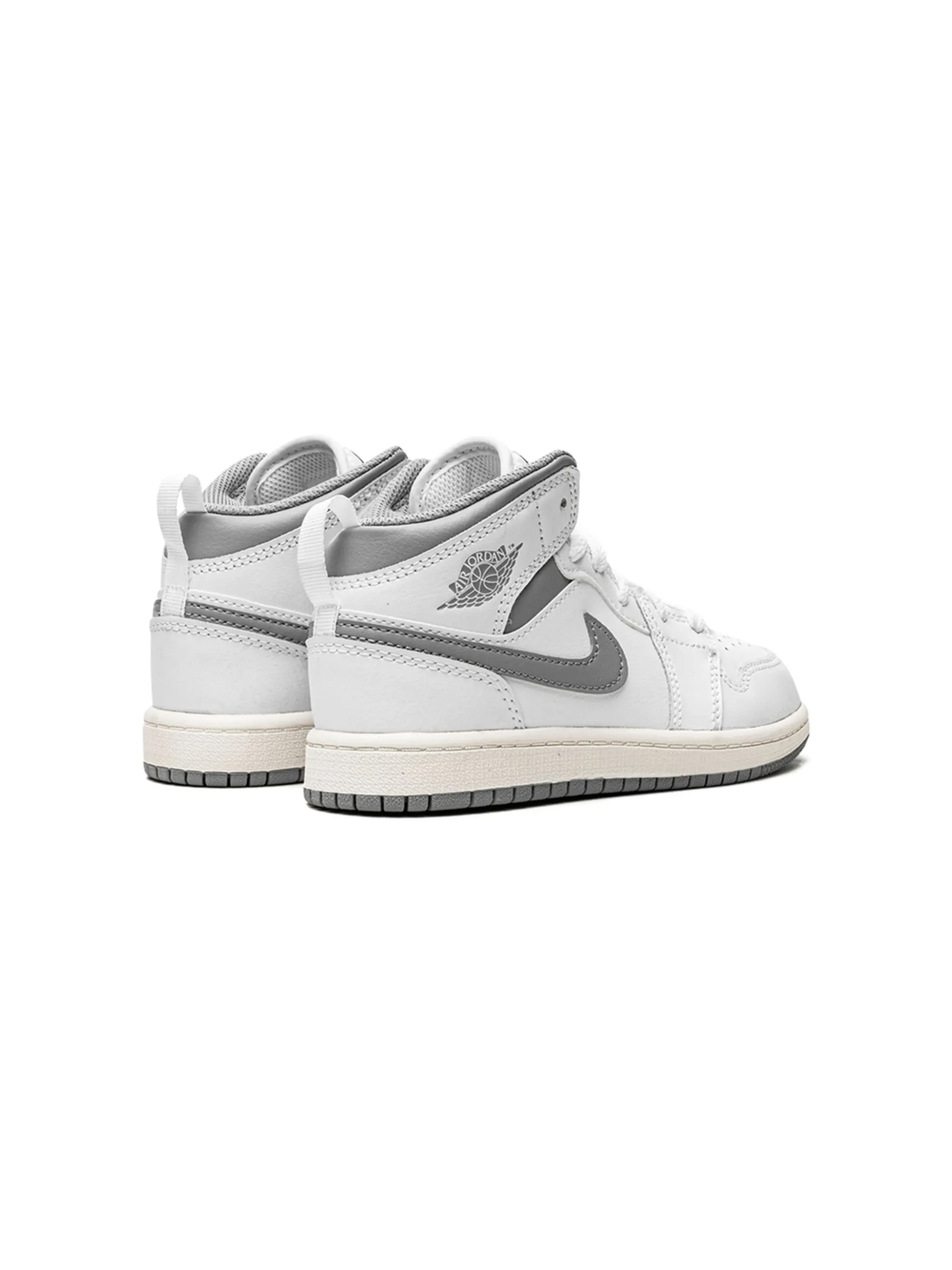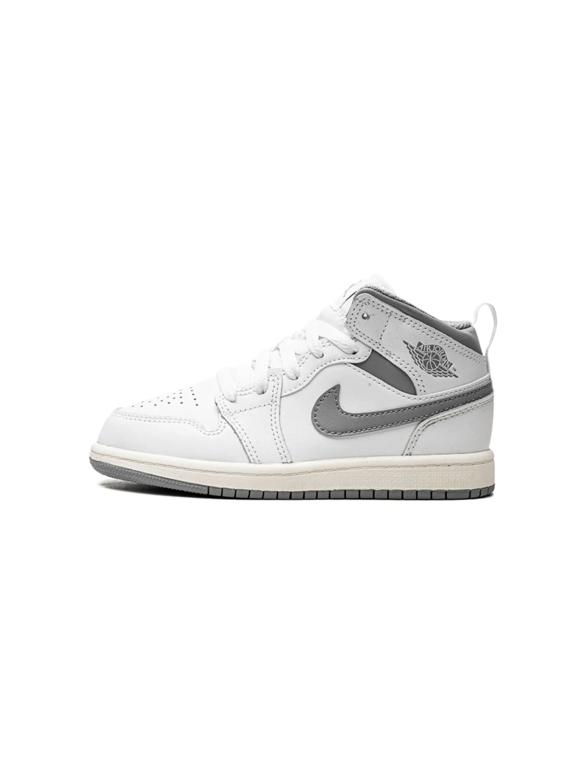 Белый, серый, кожа, логотип Nike Swoosh, логотип Air Jordan Wings, закругленный носок, перфорированный носок, шнуровка спереди, нашивка с логотипом Jumpman на язычке, петля для подтягивания сзади и резиновая подошва.