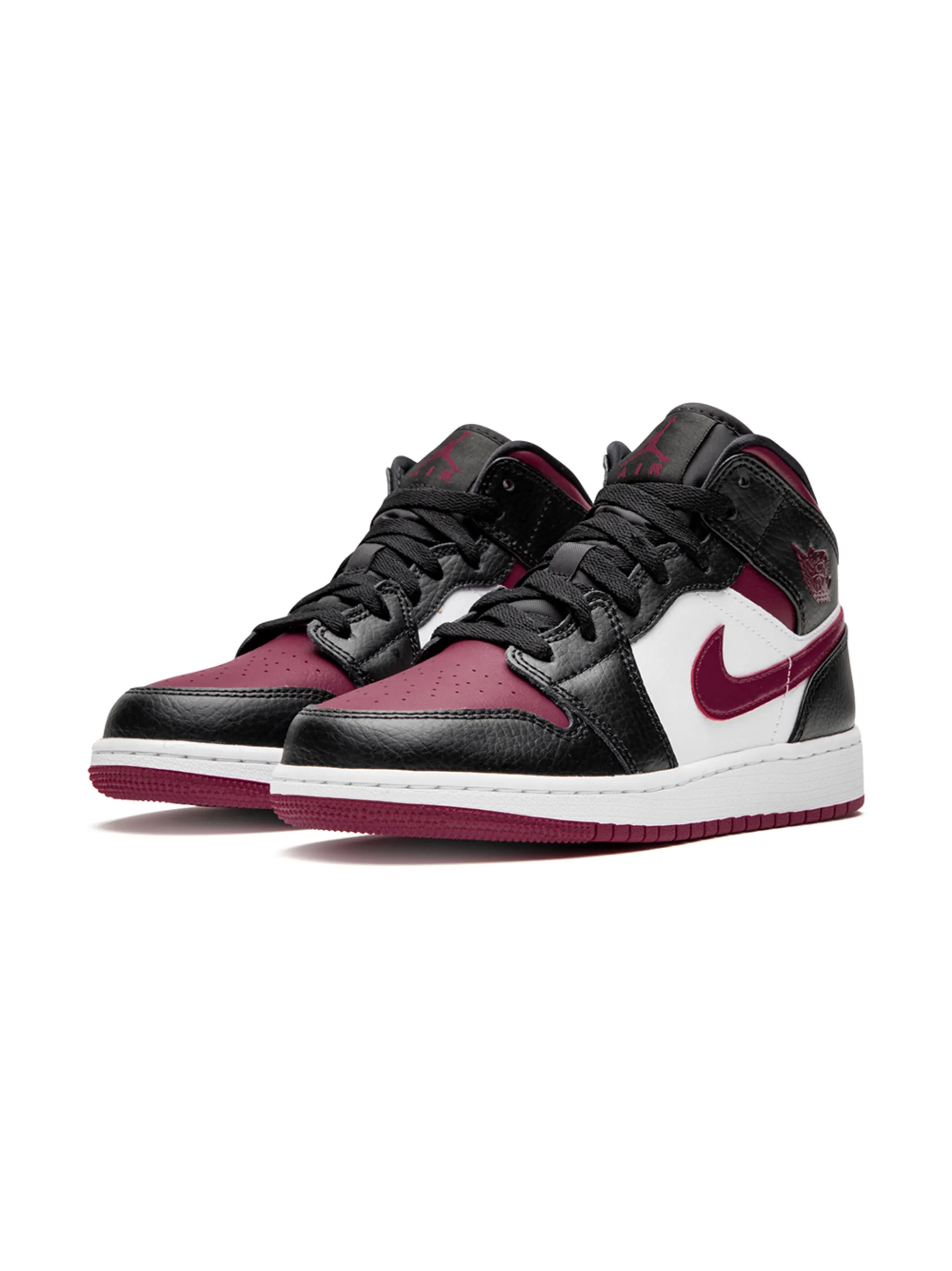 Кроссовки Air Jordan 1 MID (GS) от Jordan. Дизайн колор-блок, фирменная галочка Nike, заплатка с логотипом на язычке, шнуровка спереди, перфорированная деталь, закругленный носок и плоская резиновая подошва.
