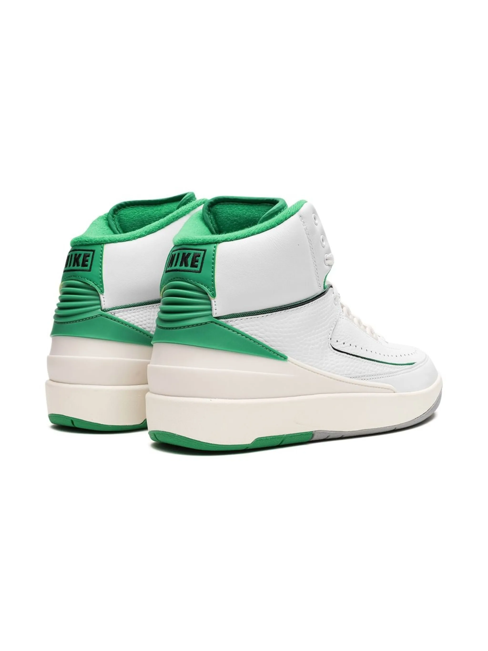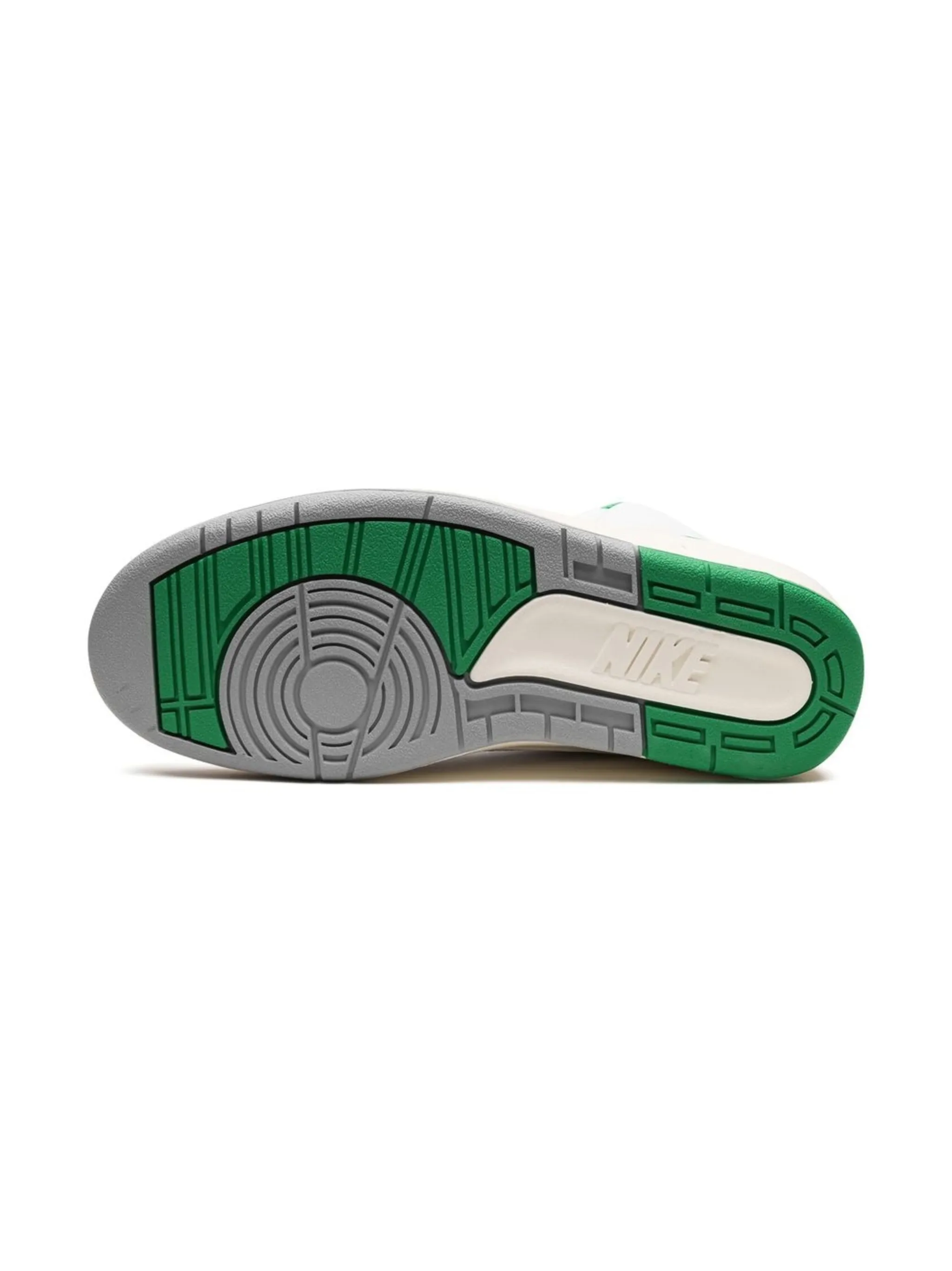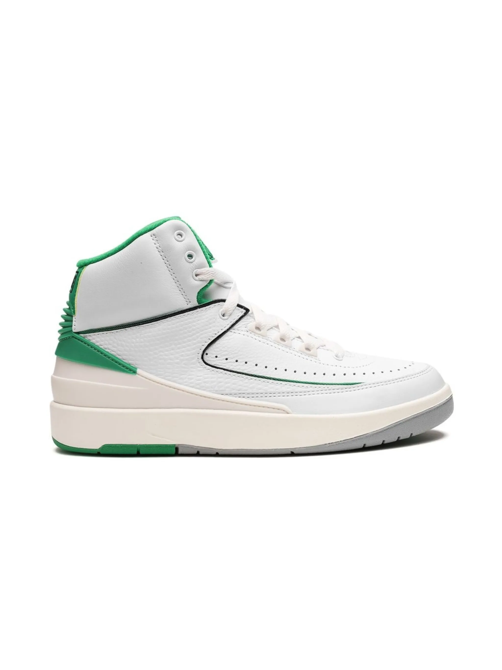 Белый, зеленый, телячья кожа, вставки, перфорация, закругленный носок, шнуровка спереди, логотип Air Jordan Wings, задник с логотипом и плоская резиновая подошва.