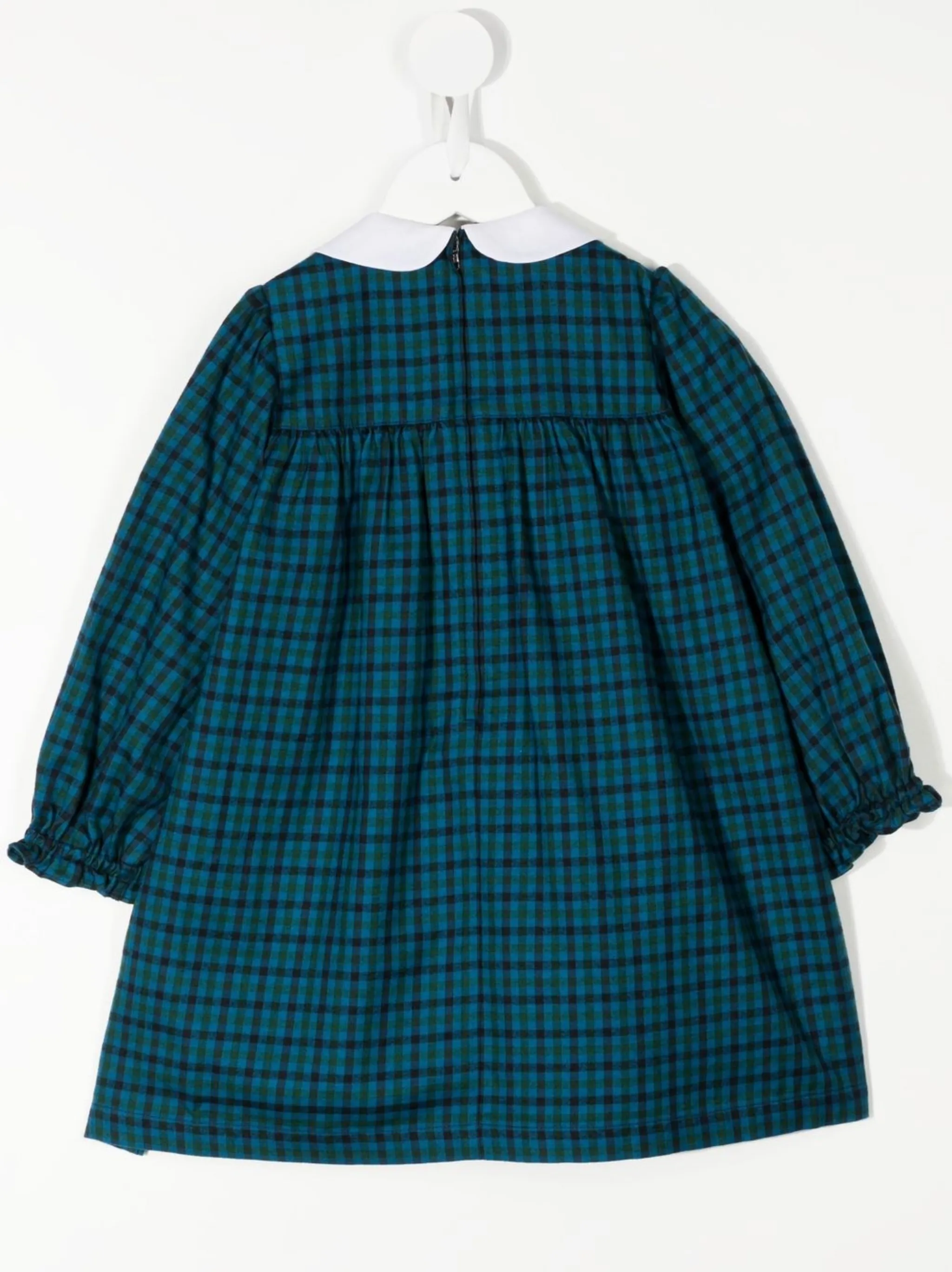 Темно-синий, смесовый хлопок, принт в клетку, вставка со сборками, воротник Питер Пэн, длинные рукава, застежка на молнии сзади, расклешенная юбка и прямой подол.