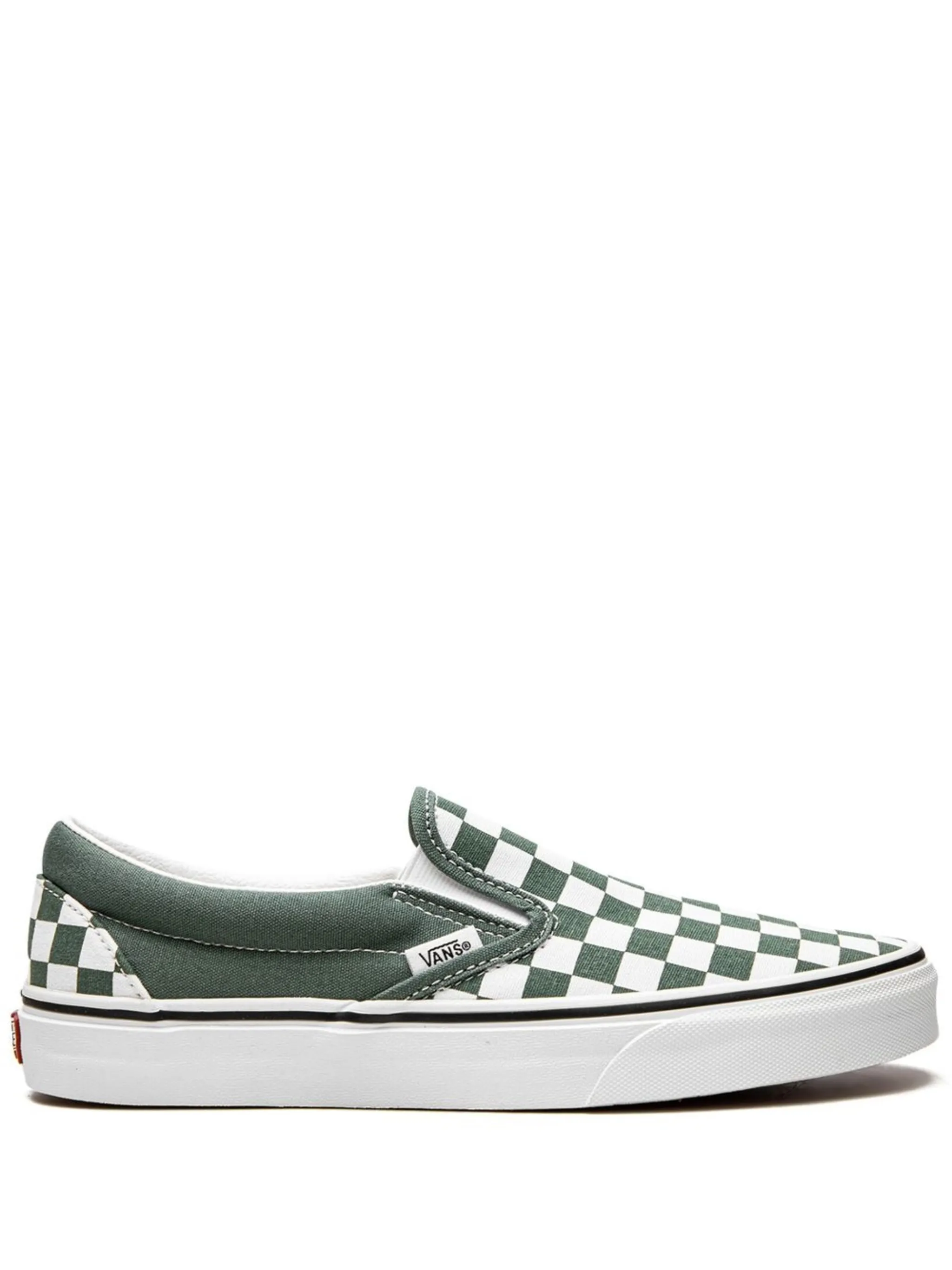 Оливково-зеленый, белый, парусина, нашивка с логотипом сбоку, принт в шахматную клетку, закругленный носок, эластичные боковые вставки, модель без застежки, стелька с логотипом и резиновая подошва.