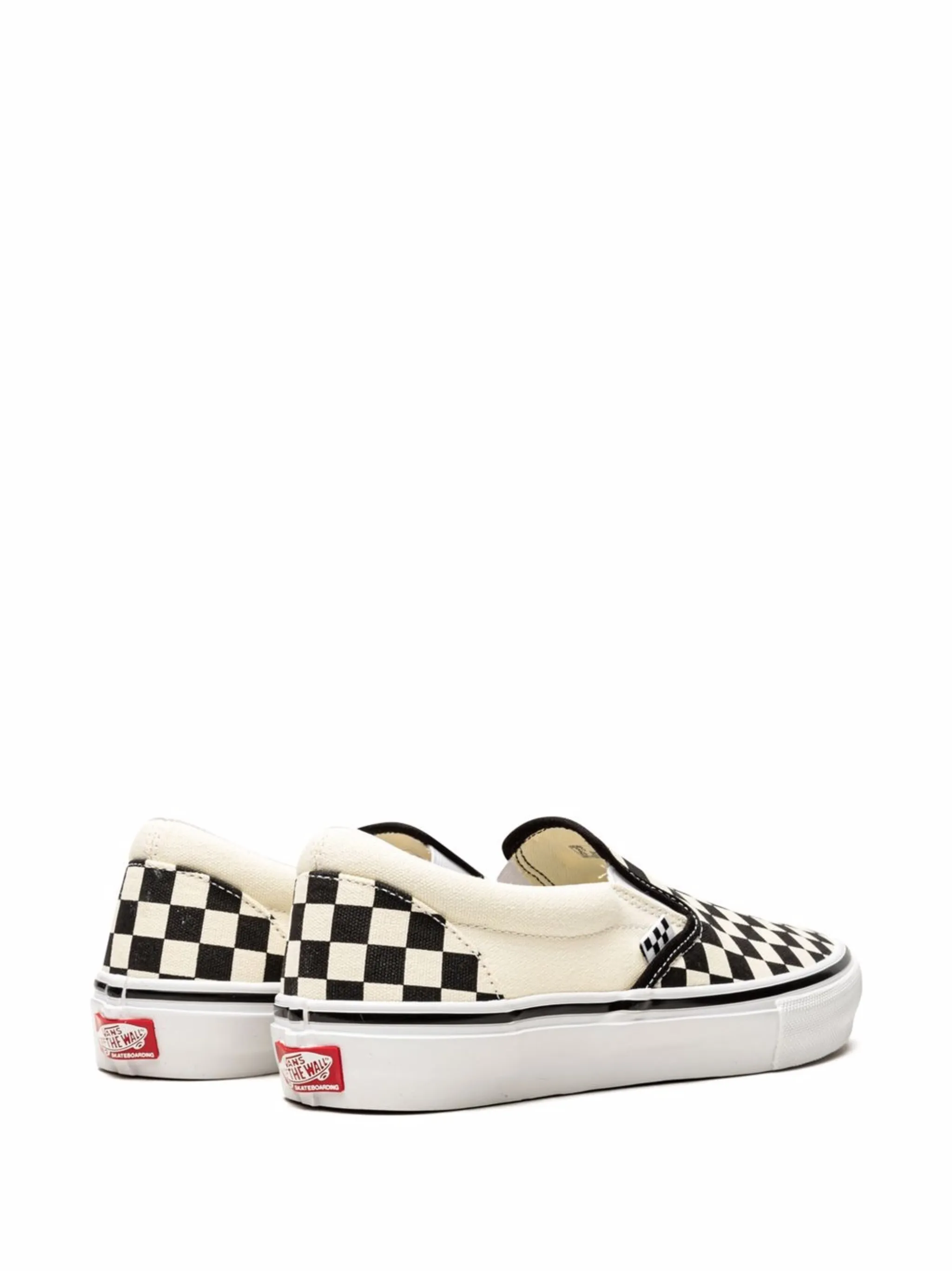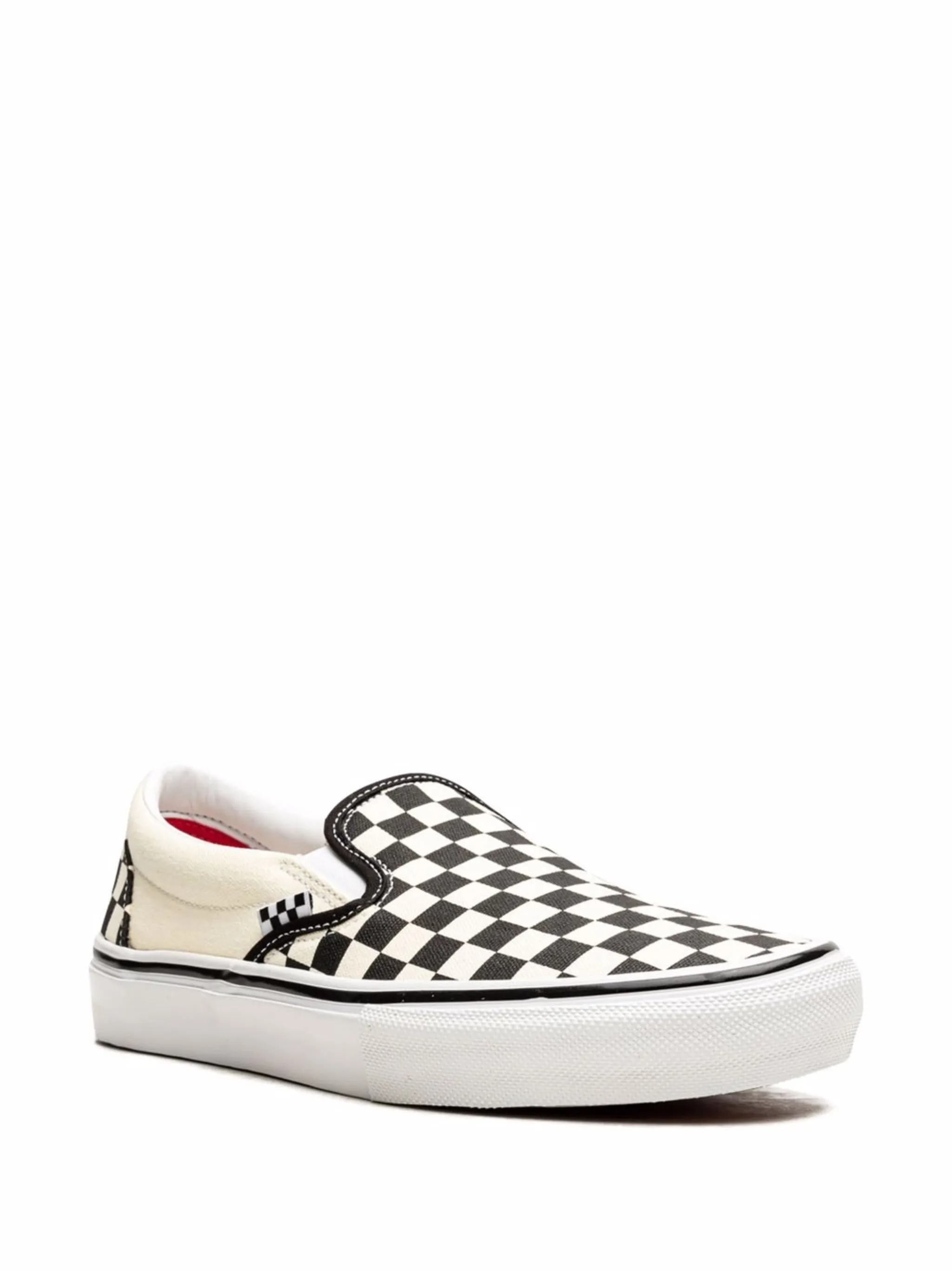 Принт в шахматную клетку, закругленный носок, эластичные боковые панели, модель без застежки, стелька с логотипом и плоская резиновая подошва.