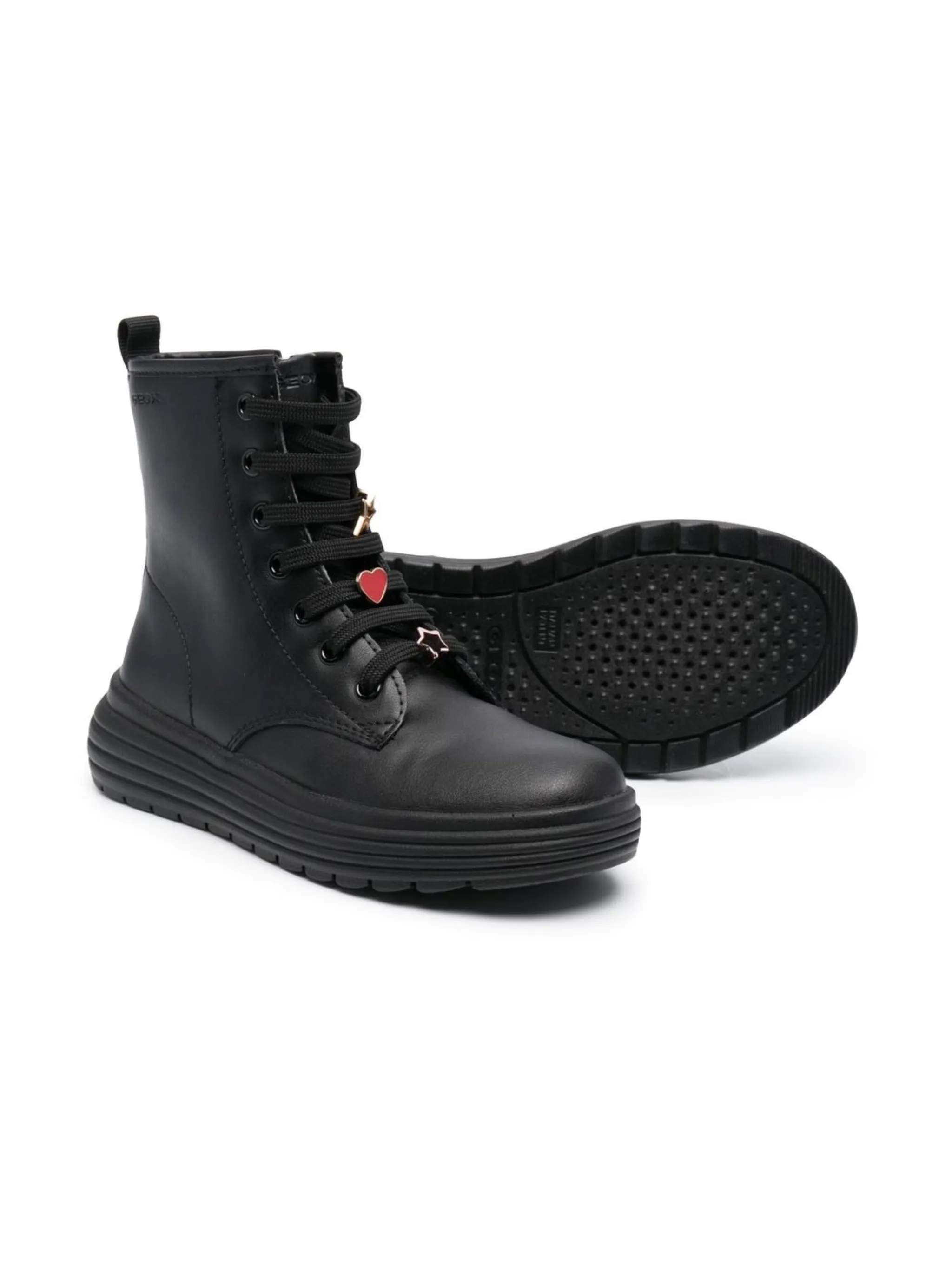 Черный, подвеска в форме сердца, подвеска, шнуровка спереди, петля для подтягивания сзади и массивная резиновая подошва.