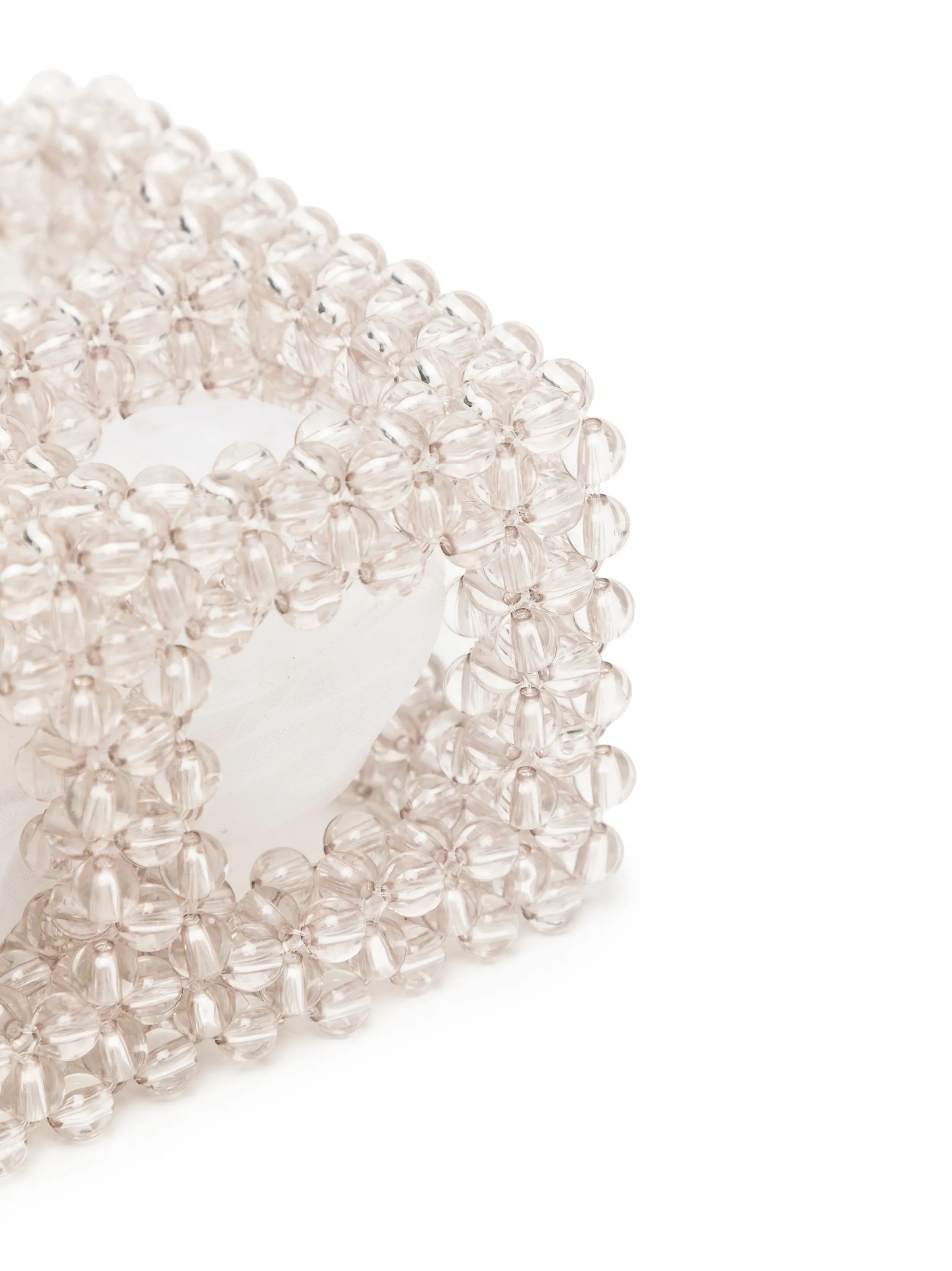 Белый, акриловое стекло, латунь, серебристая фурнитура, прозрачный материал, декор из бисера, верхняя ручка, дизайн с открытым верхом и основное отделение.