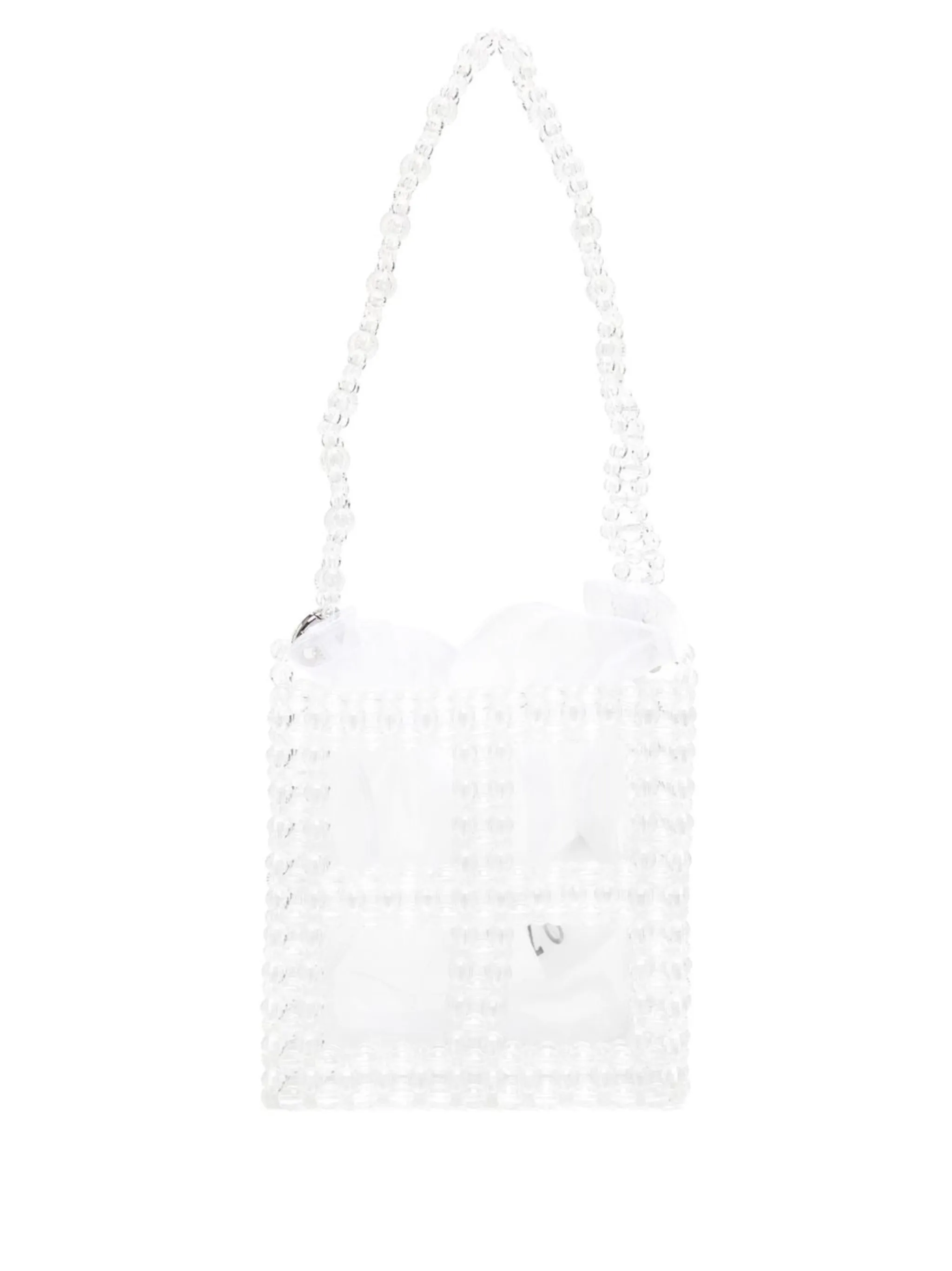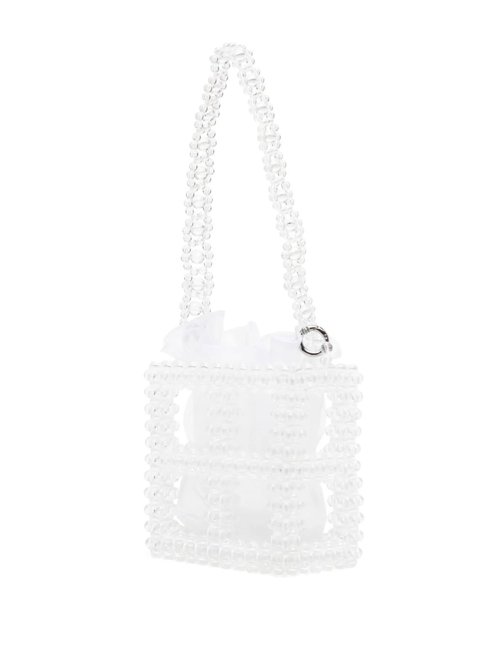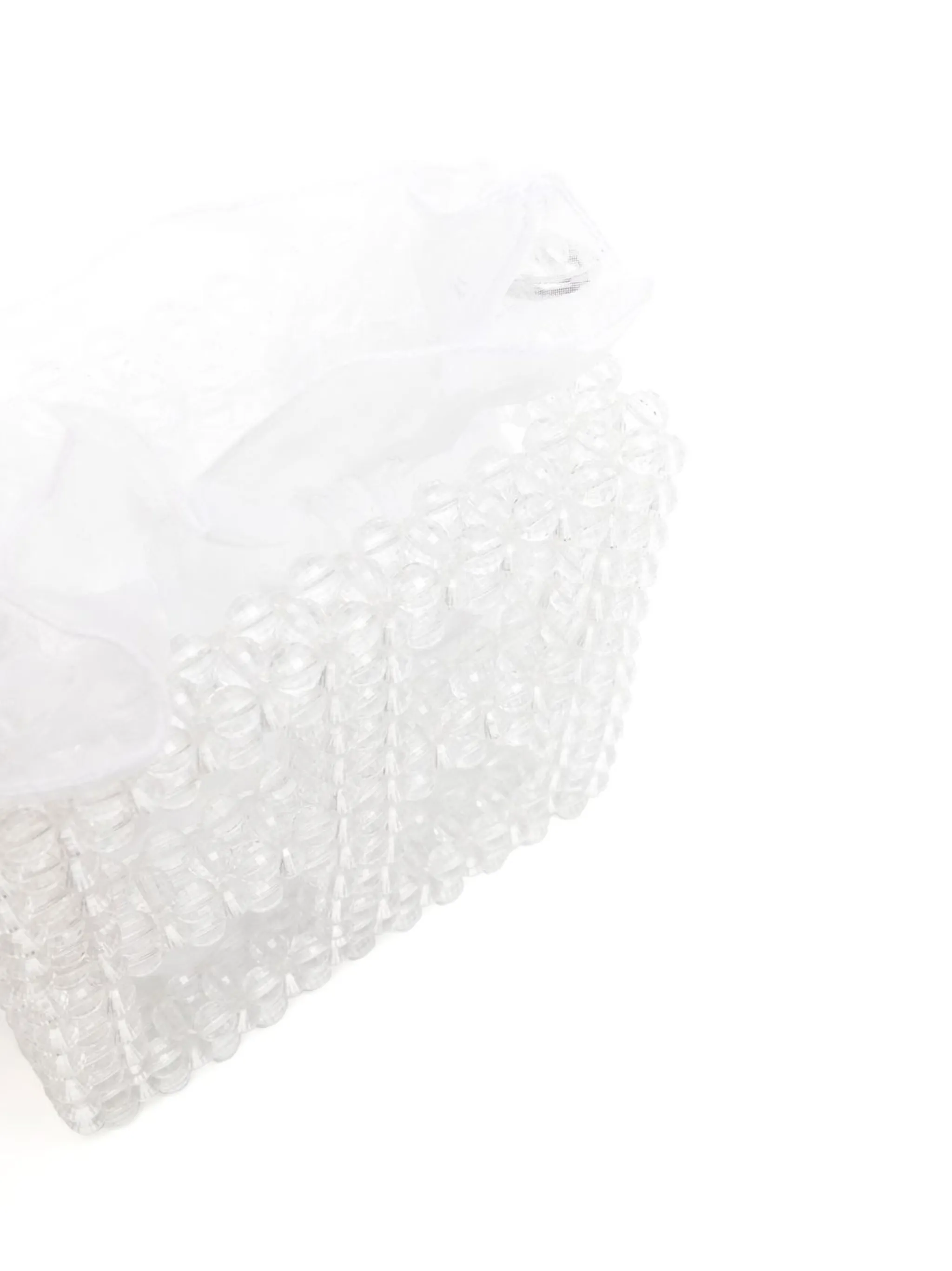 Белый, кристалл, прозрачный материал, дизайн с открытым верхом, две закругленные верхние ручки и основное отделение.