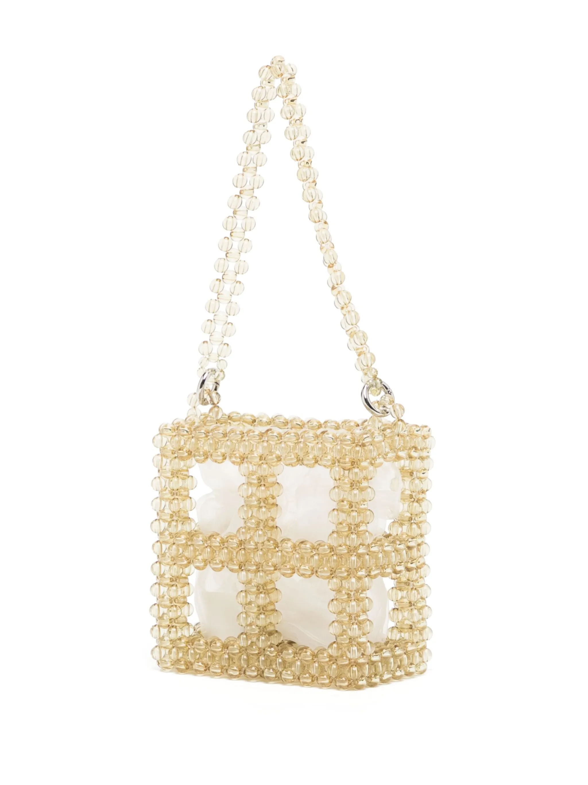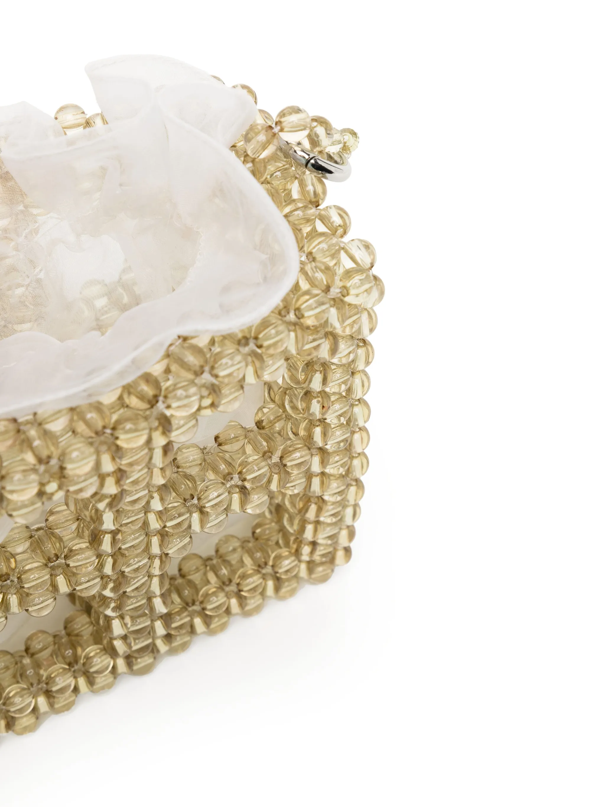Хаки, акриловое стекло, латунь, серебристая фурнитура, прозрачный материал, декор из бисера, верхняя ручка, дизайн с открытым верхом и основное отделение.