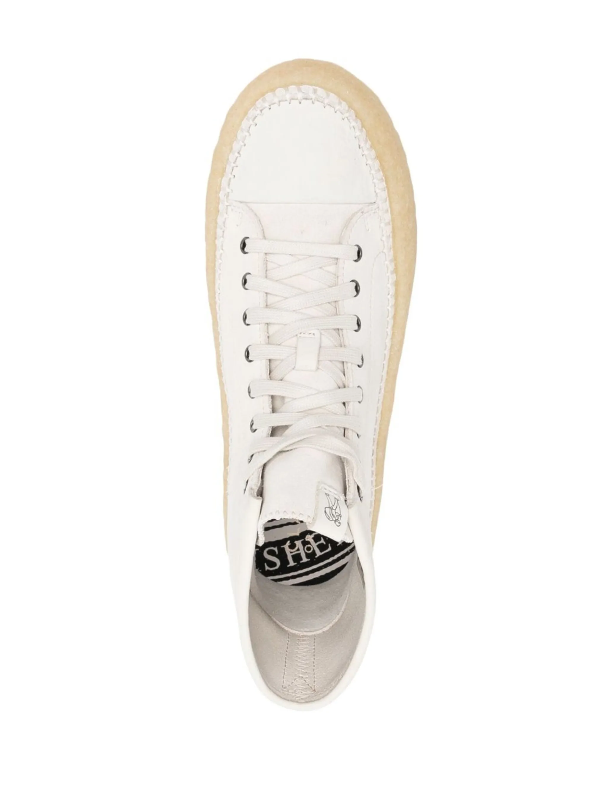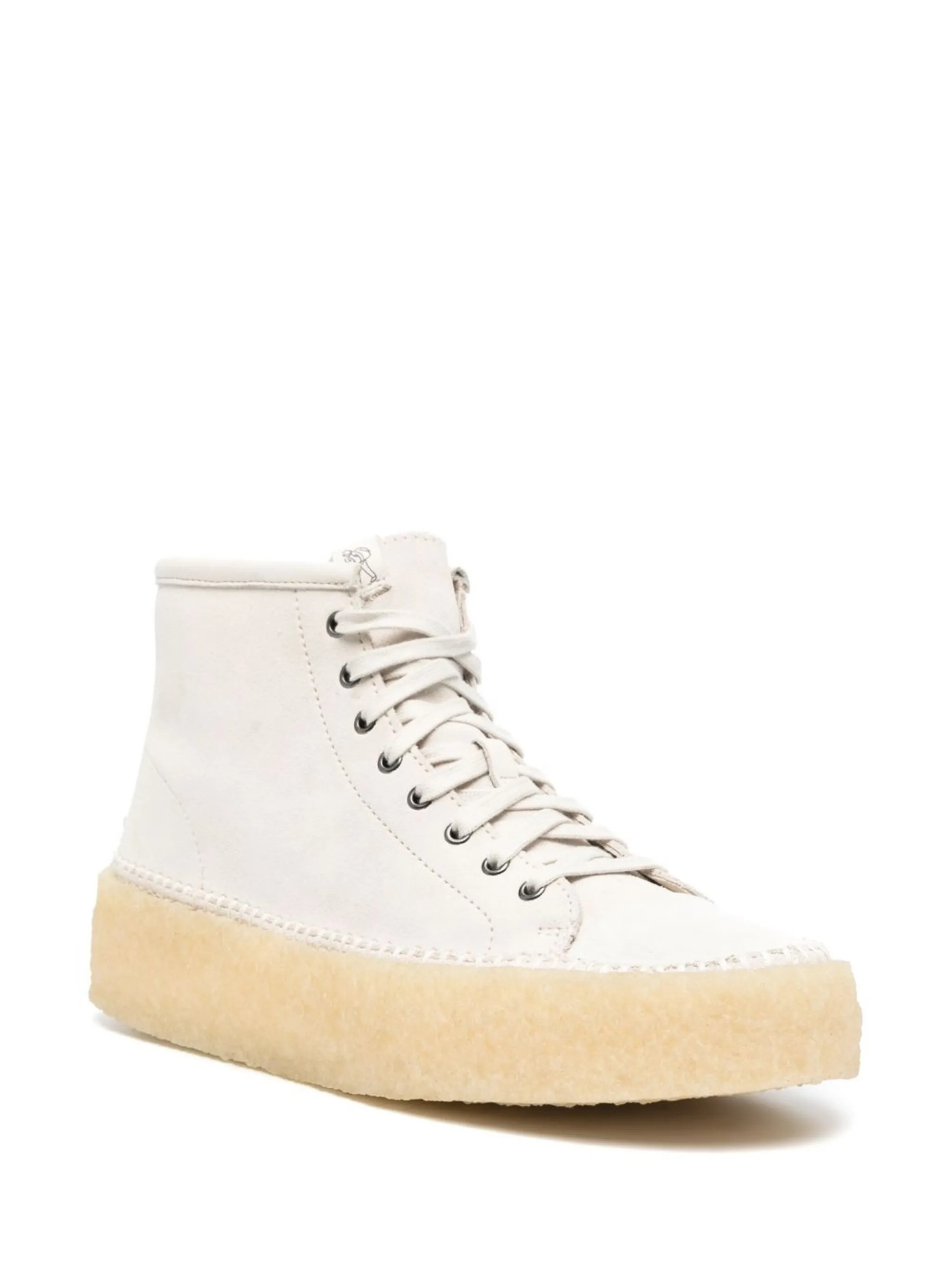 Кремовый, замша из телячьей кожи, телячья кожа, шнуровка спереди, закругленный носок, стелька с логотипом, нашивка с логотипом на язычке, высота по щиколотку и креповая подошва.