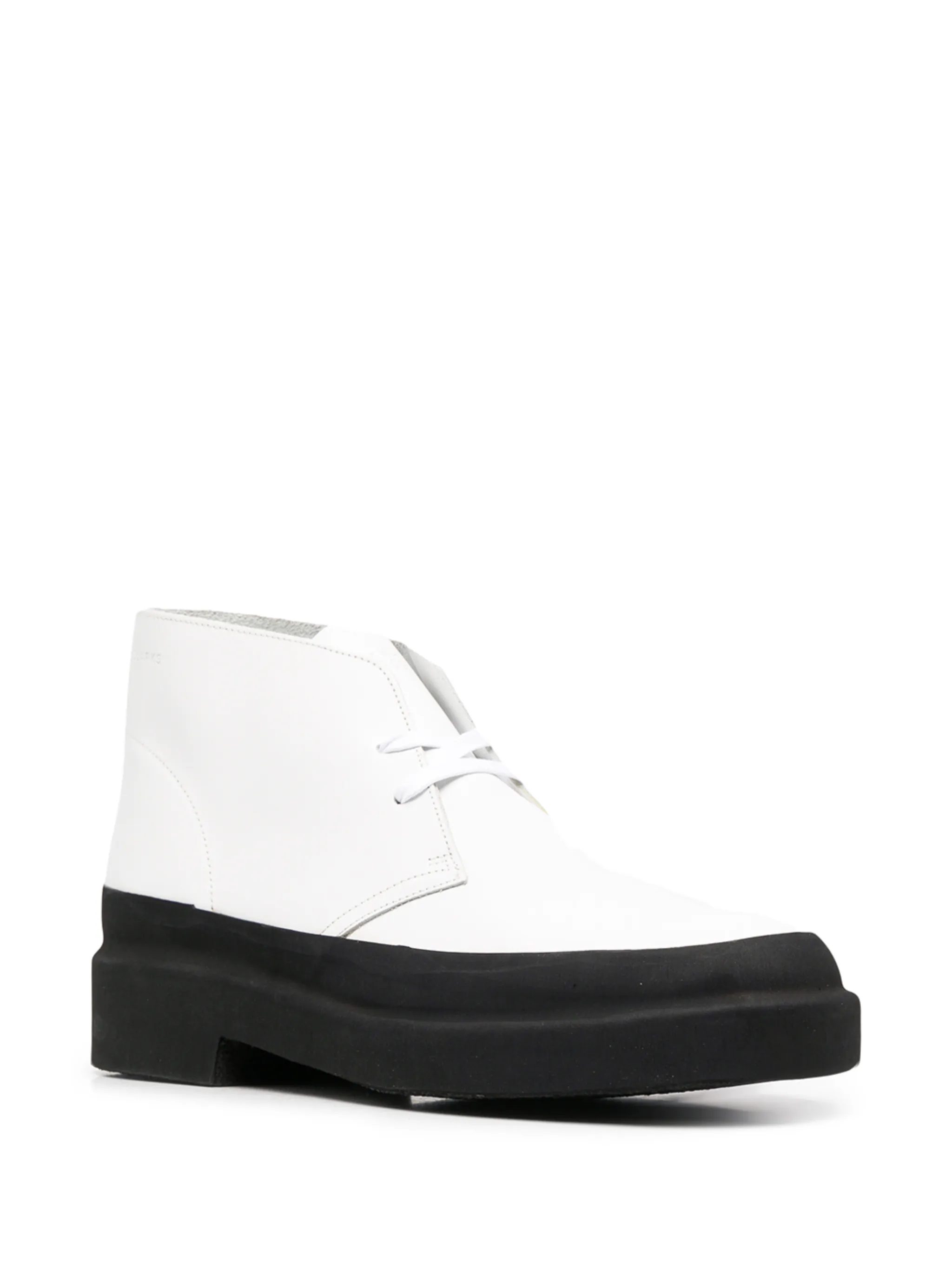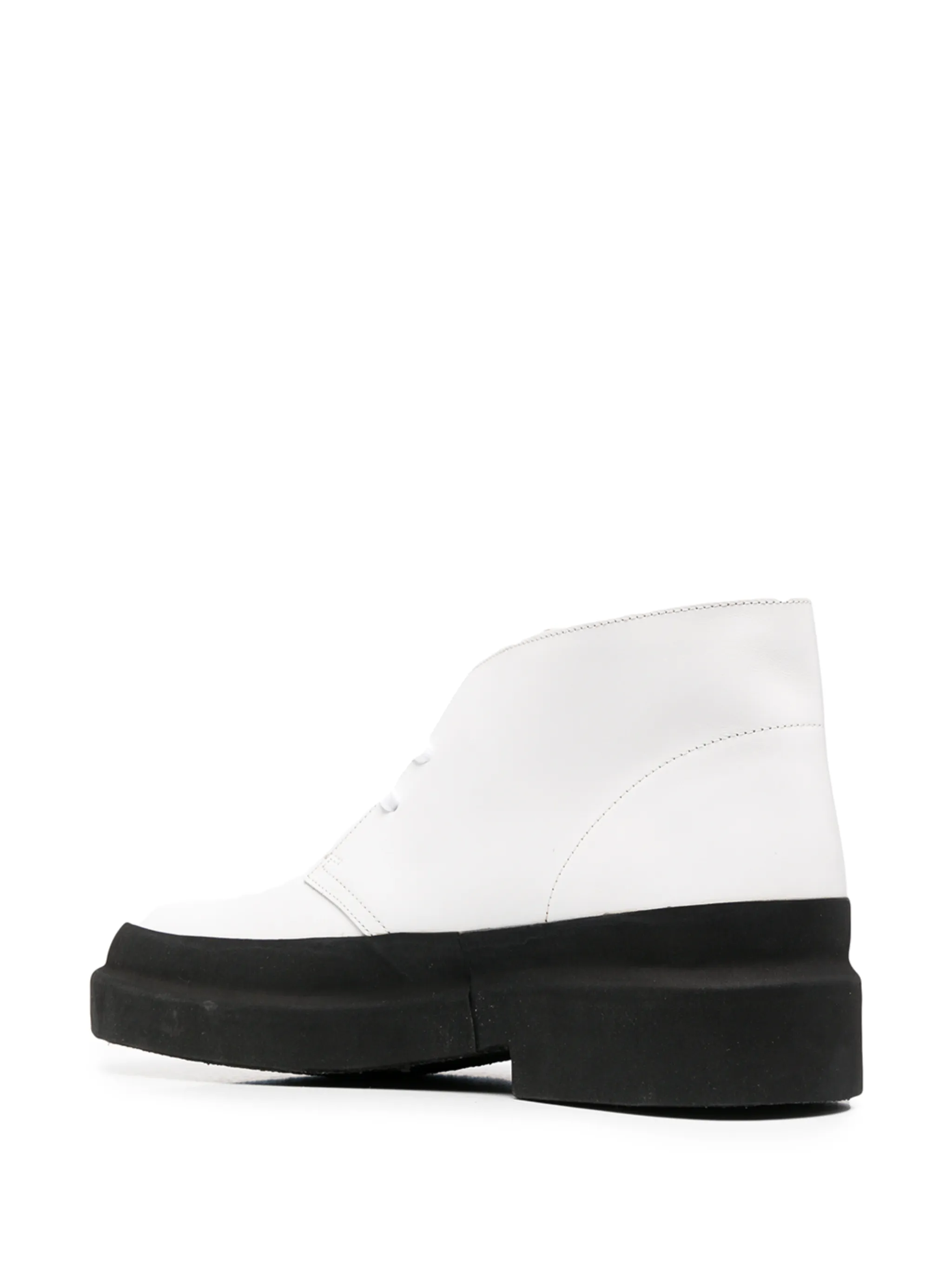 Закругленный носок, шнуровка спереди, длина по щиколотку, стелька с логотипом и резиновая подошва. Цвет: белый.