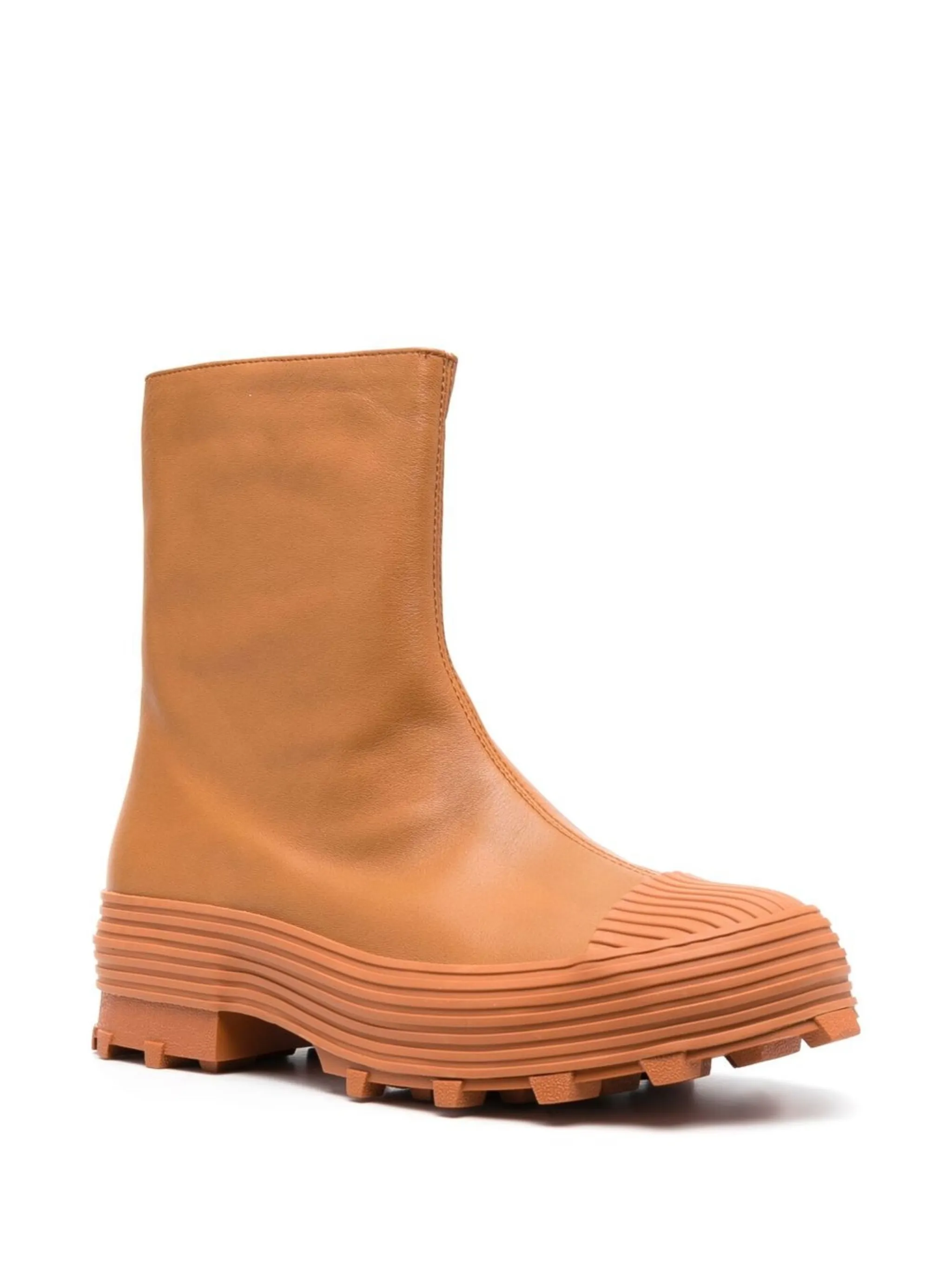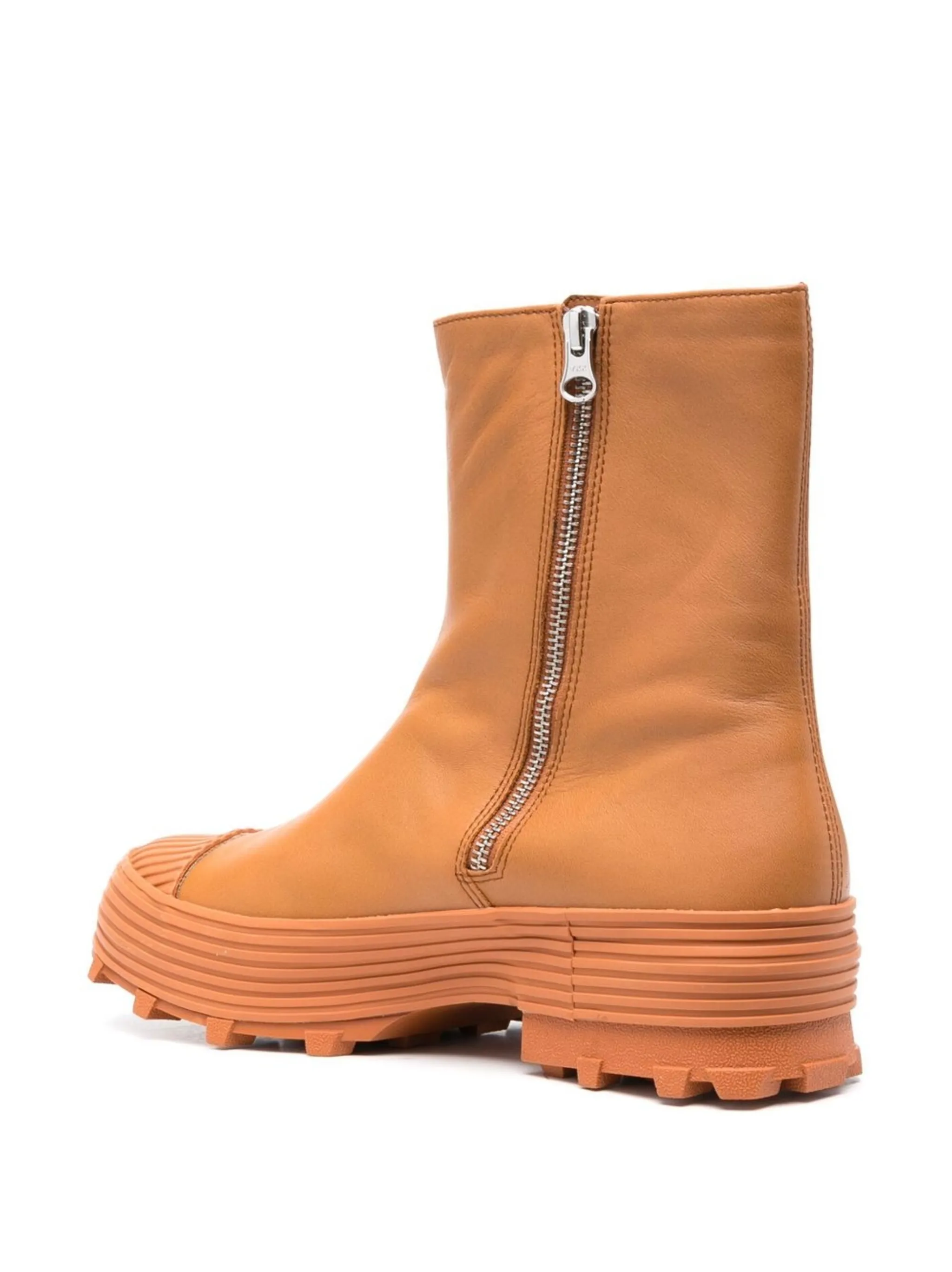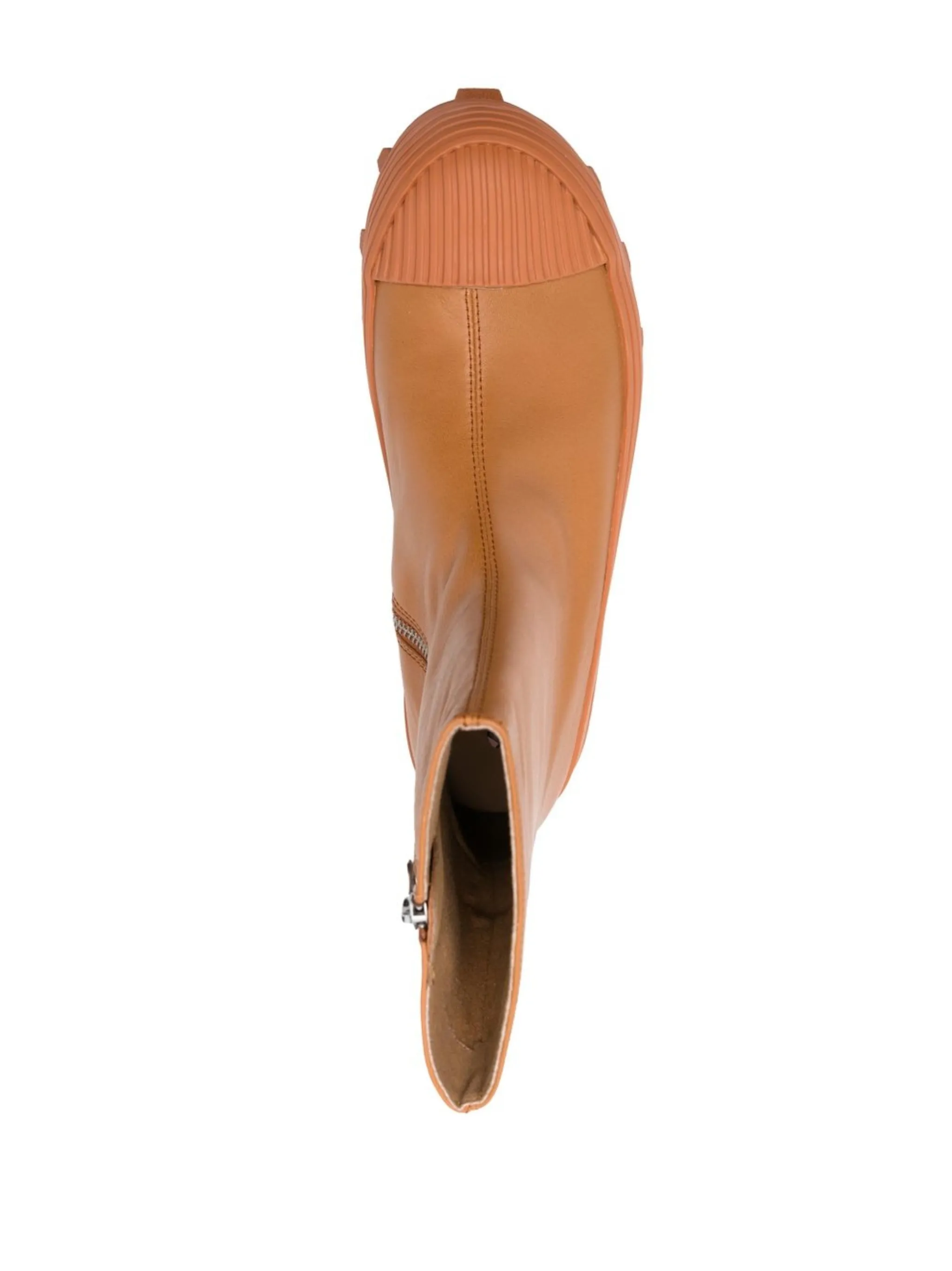 Коричневый, кожа, переработанный полиэстер, резиновый носок, закругленный носок, рифленая резиновая подошва, длина до середины голени и молнии на манжетах.