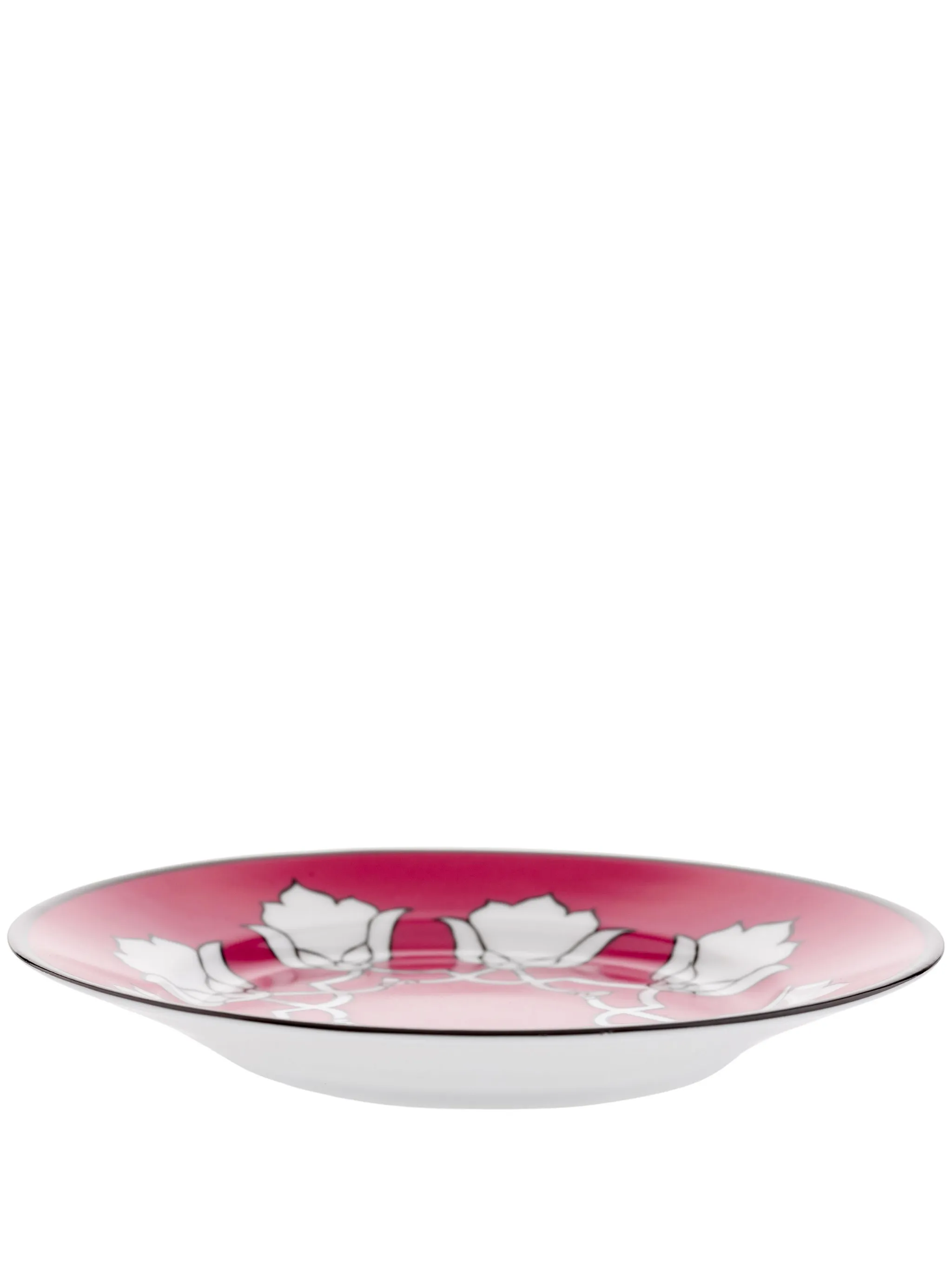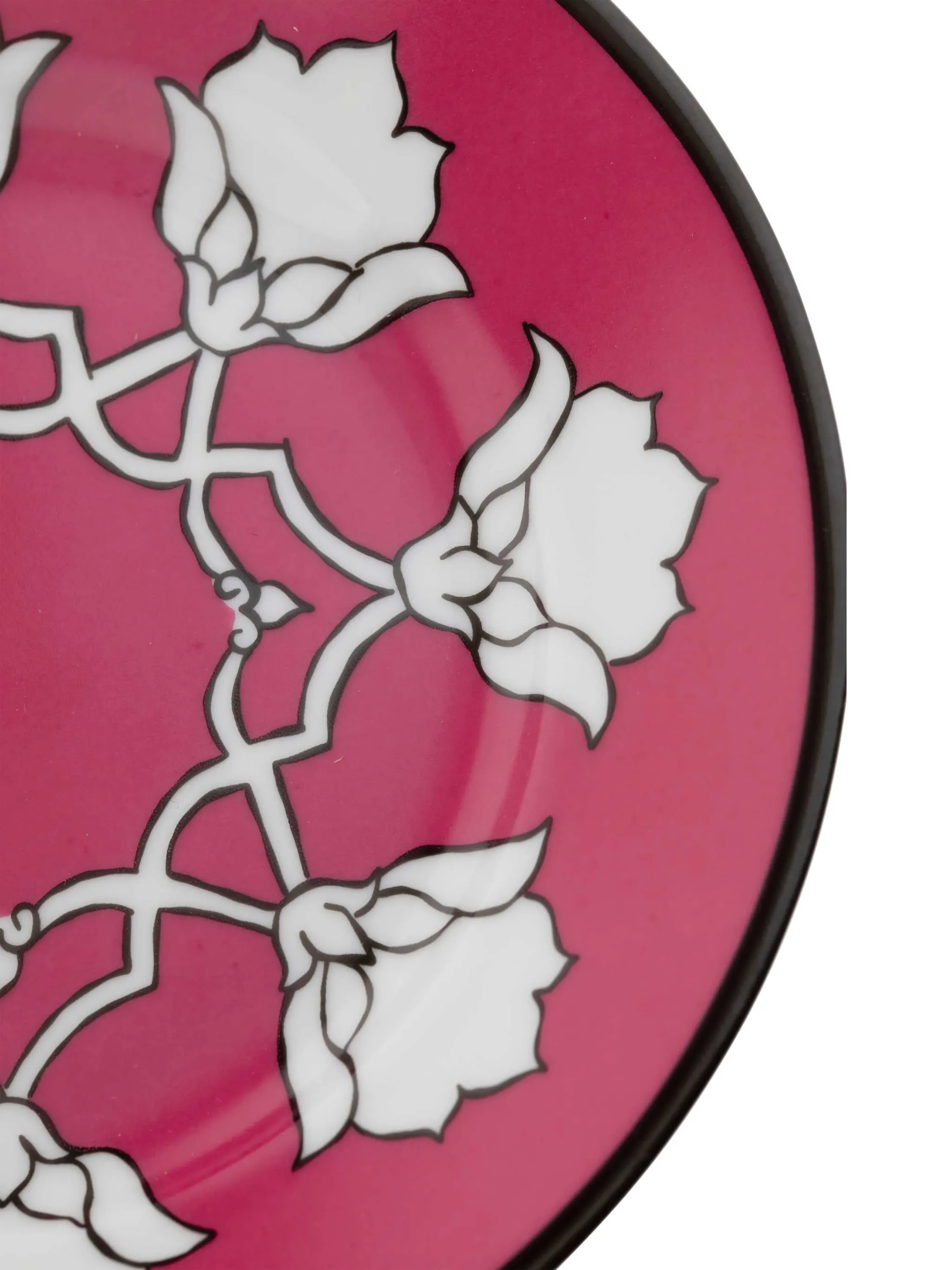 Малиновый, белый, фарфор, цветочный принт, контрастные края и круглая форма.