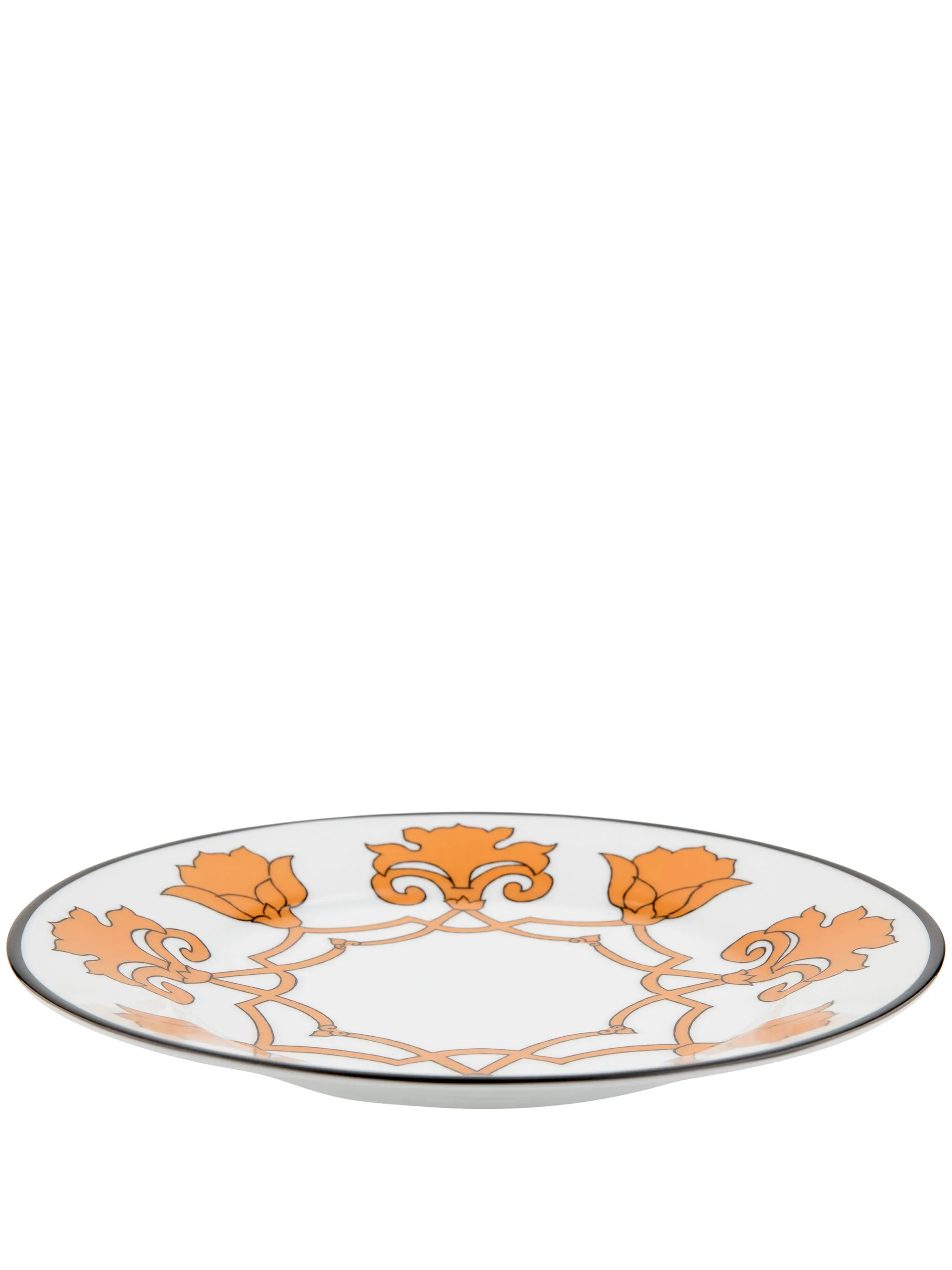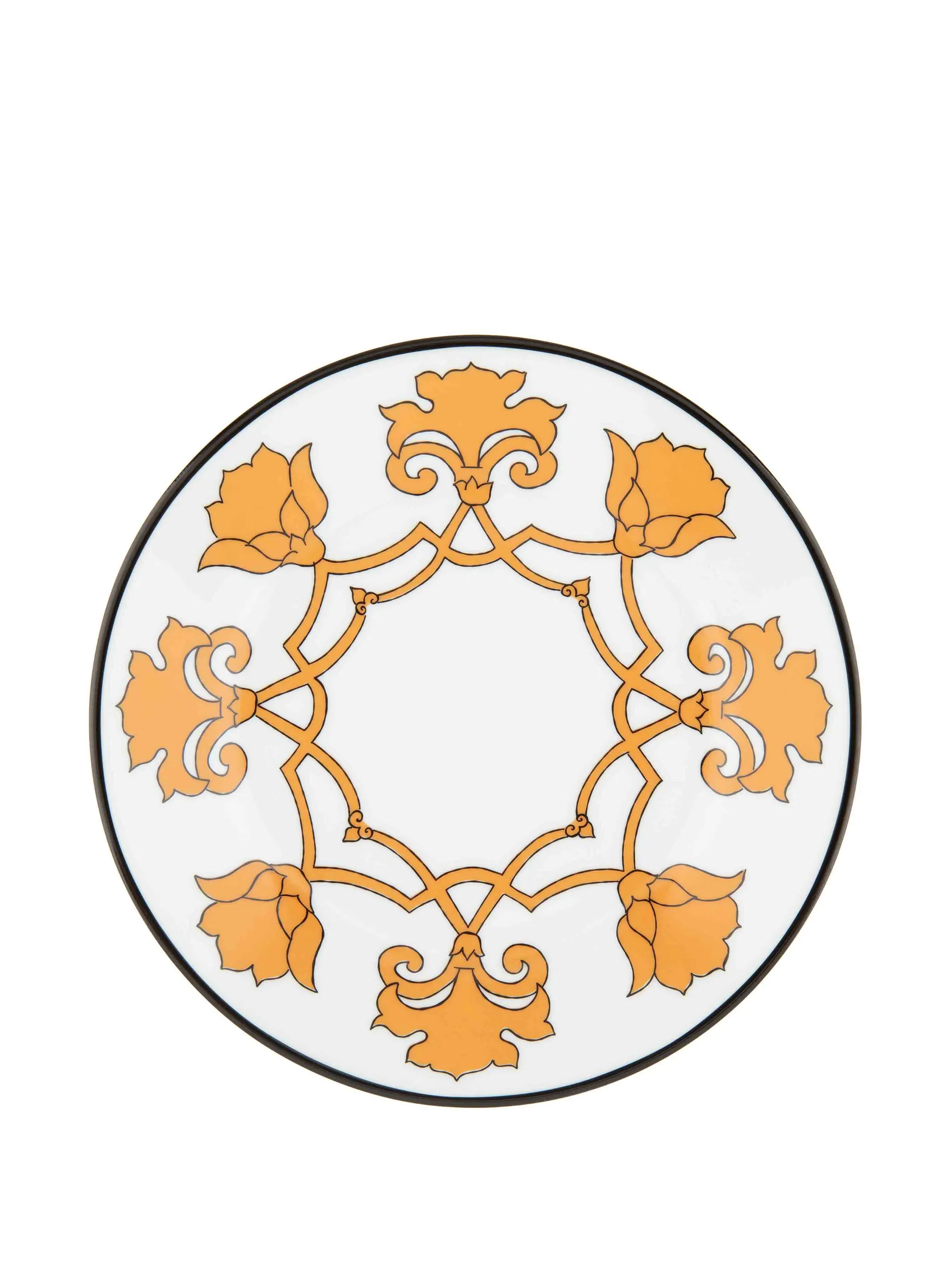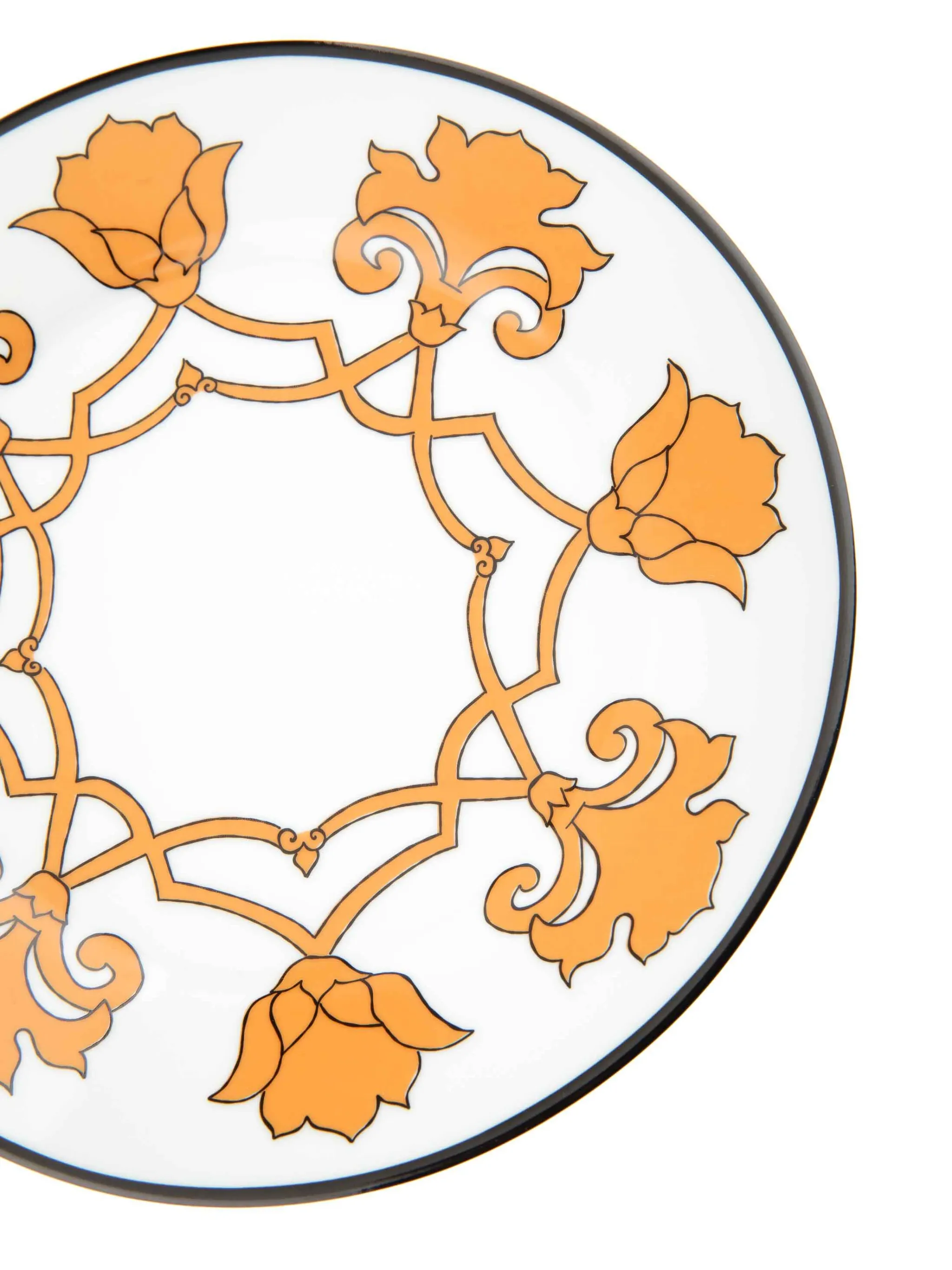 Белый, светло-оранжевый, фарфор, узор в стиле барокко, круглая форма и глазурованное покрытие.