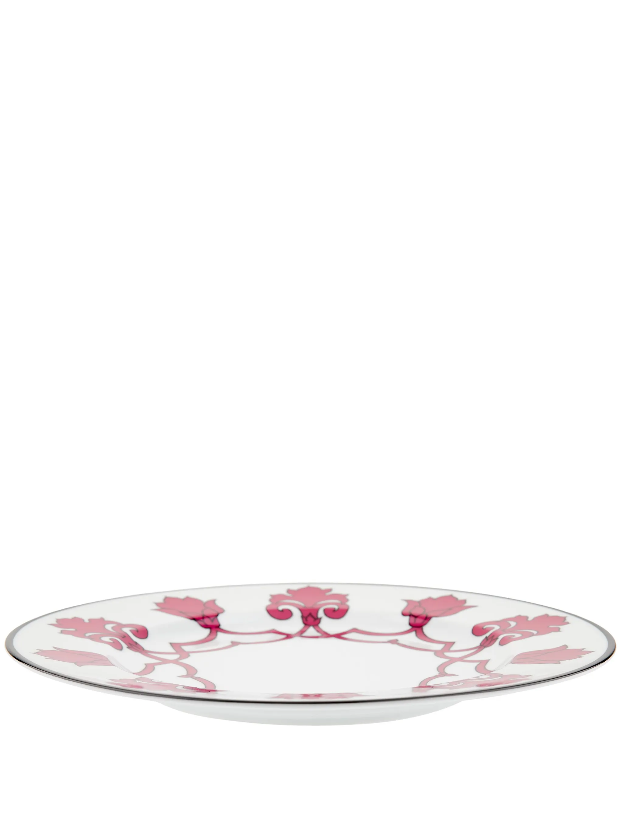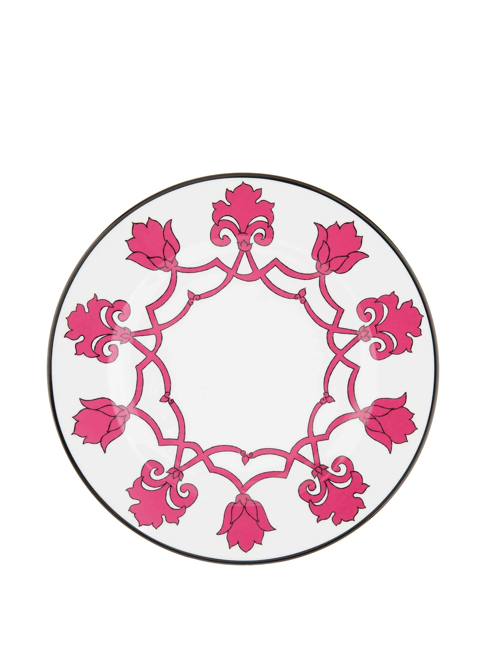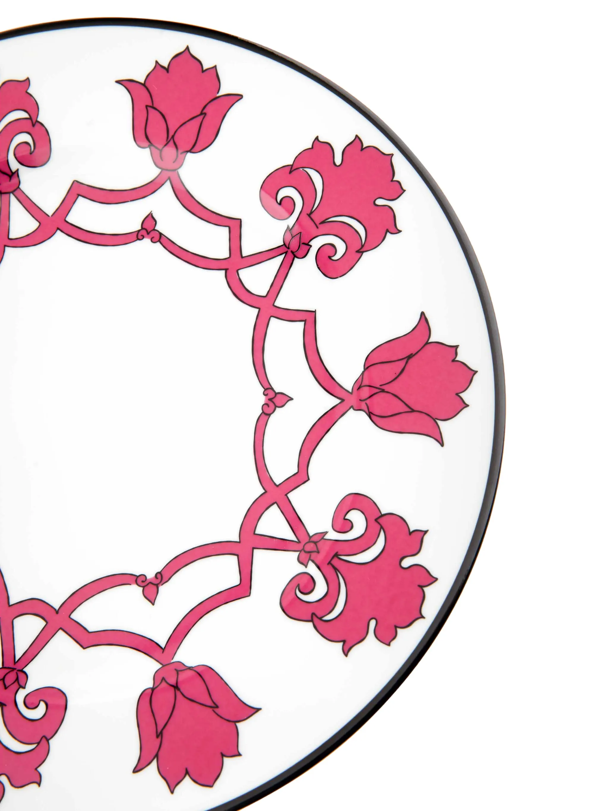 Белый, фуксия, фарфор, цветочный принт, контрастные края и круглая форма.