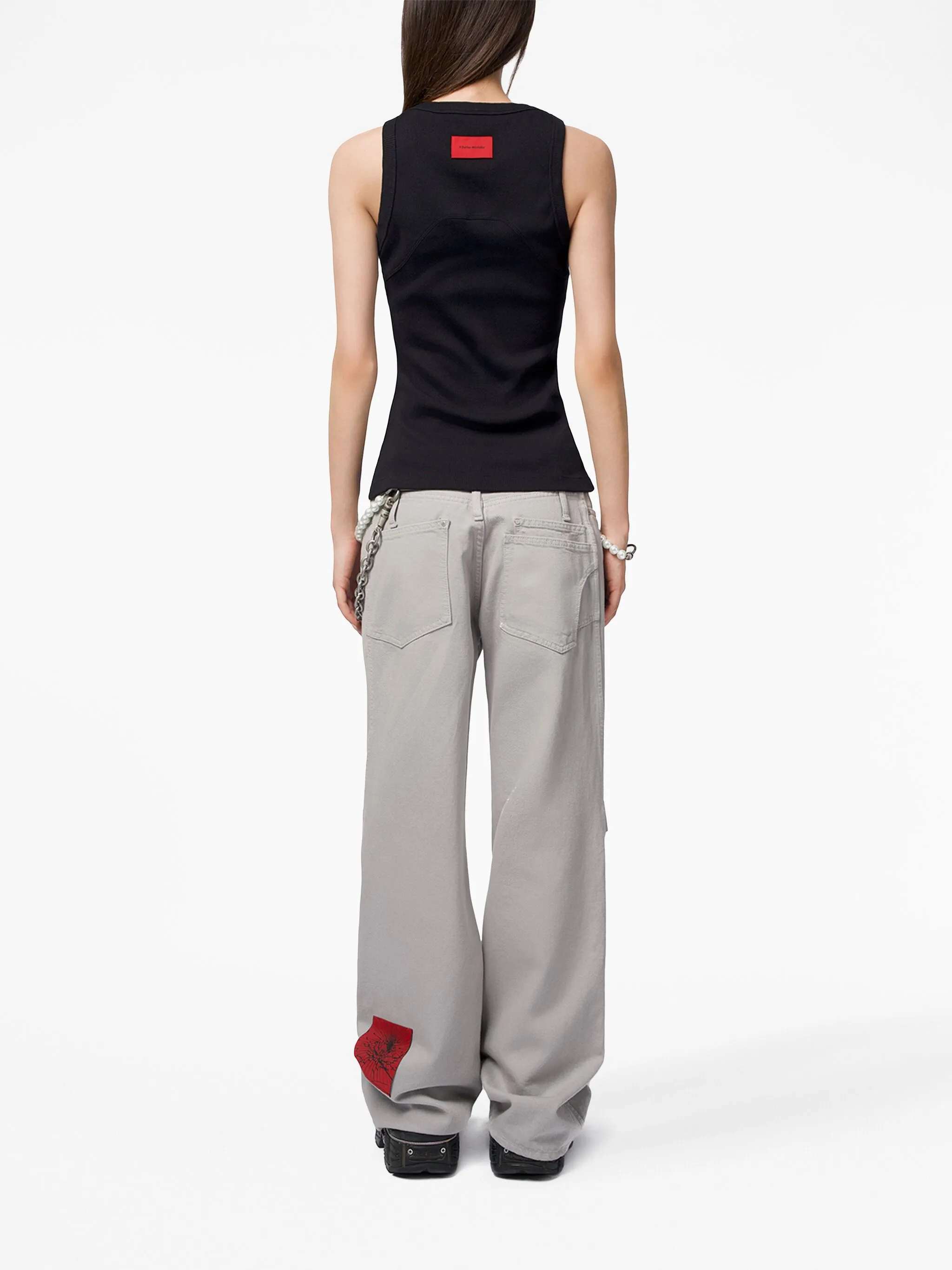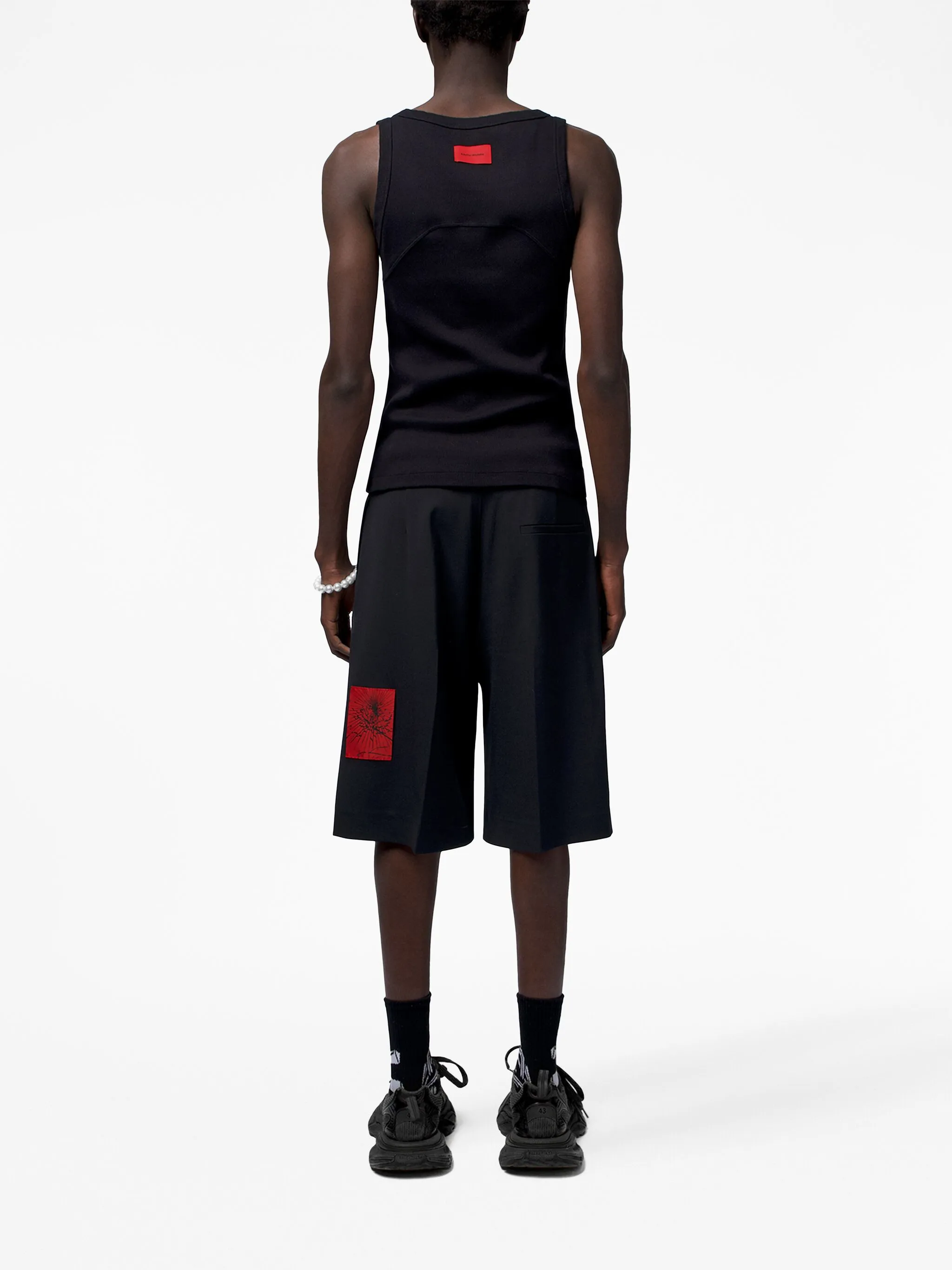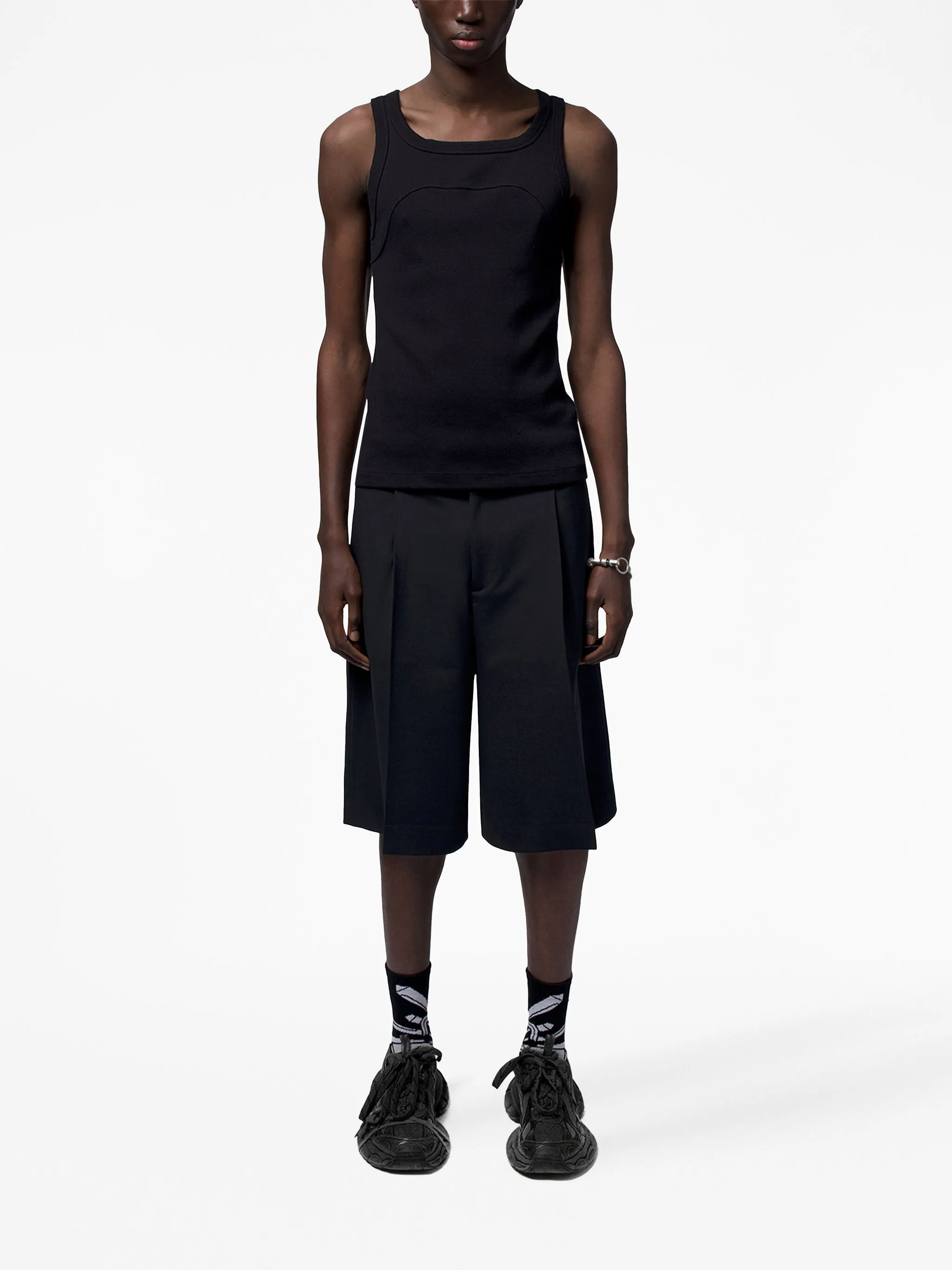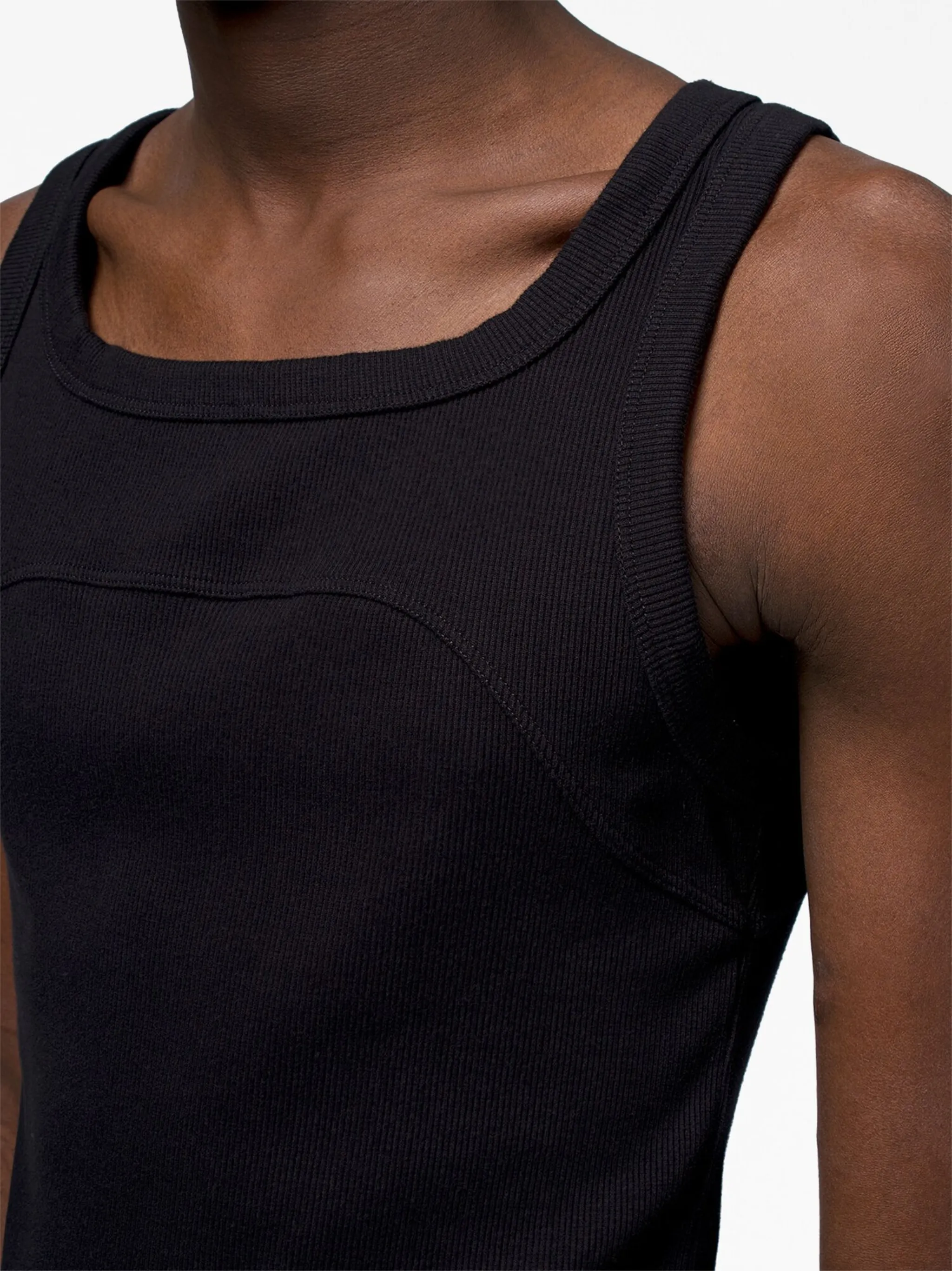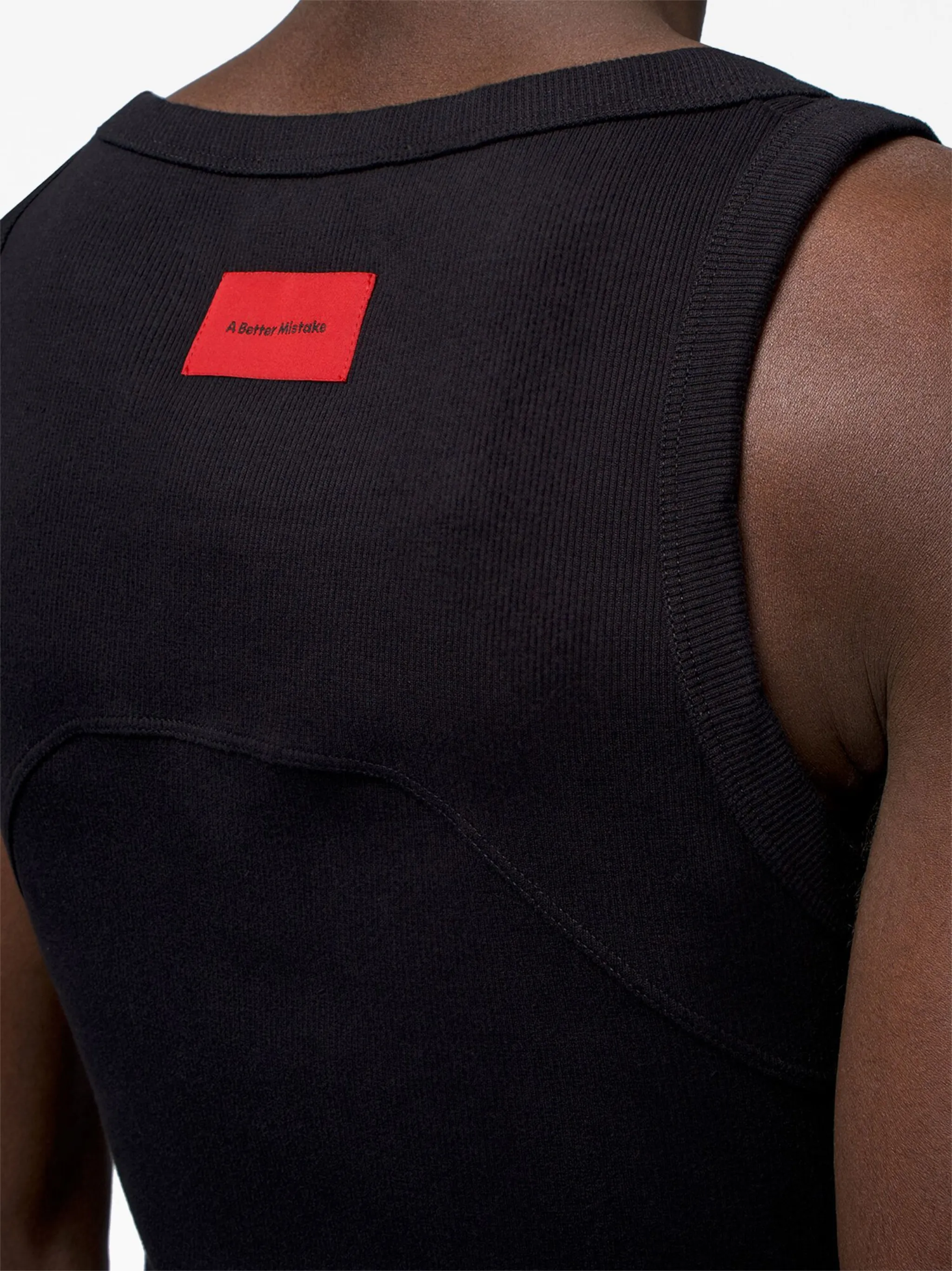 Черный, хлопок, ткань в мелкий рубчик, нашивка с логотипом сзади, круглый вырез, без рукавов и прямой подол. Это унисекс-модель. Обратите внимание, что для нее используется мужская размерная сетка.