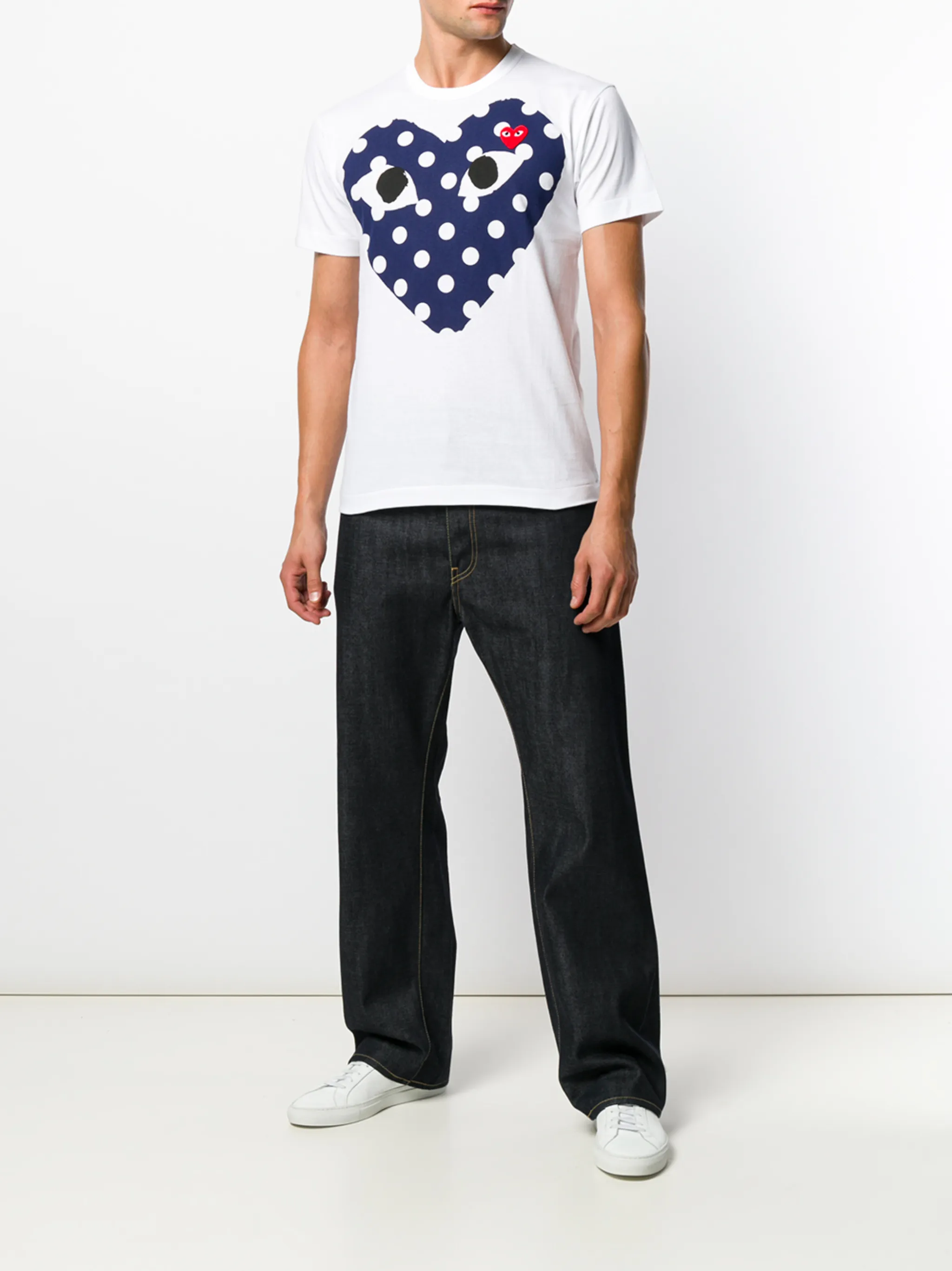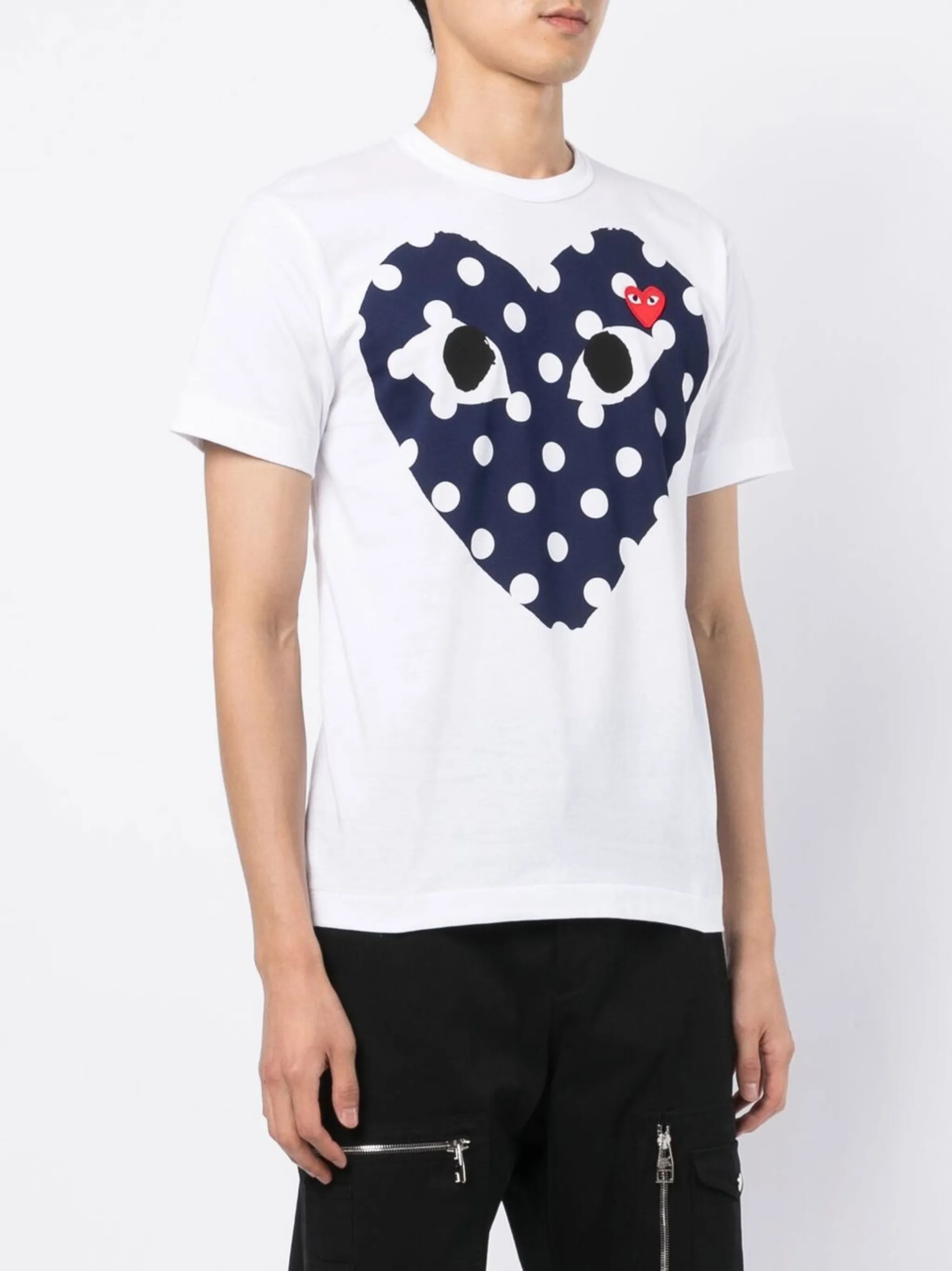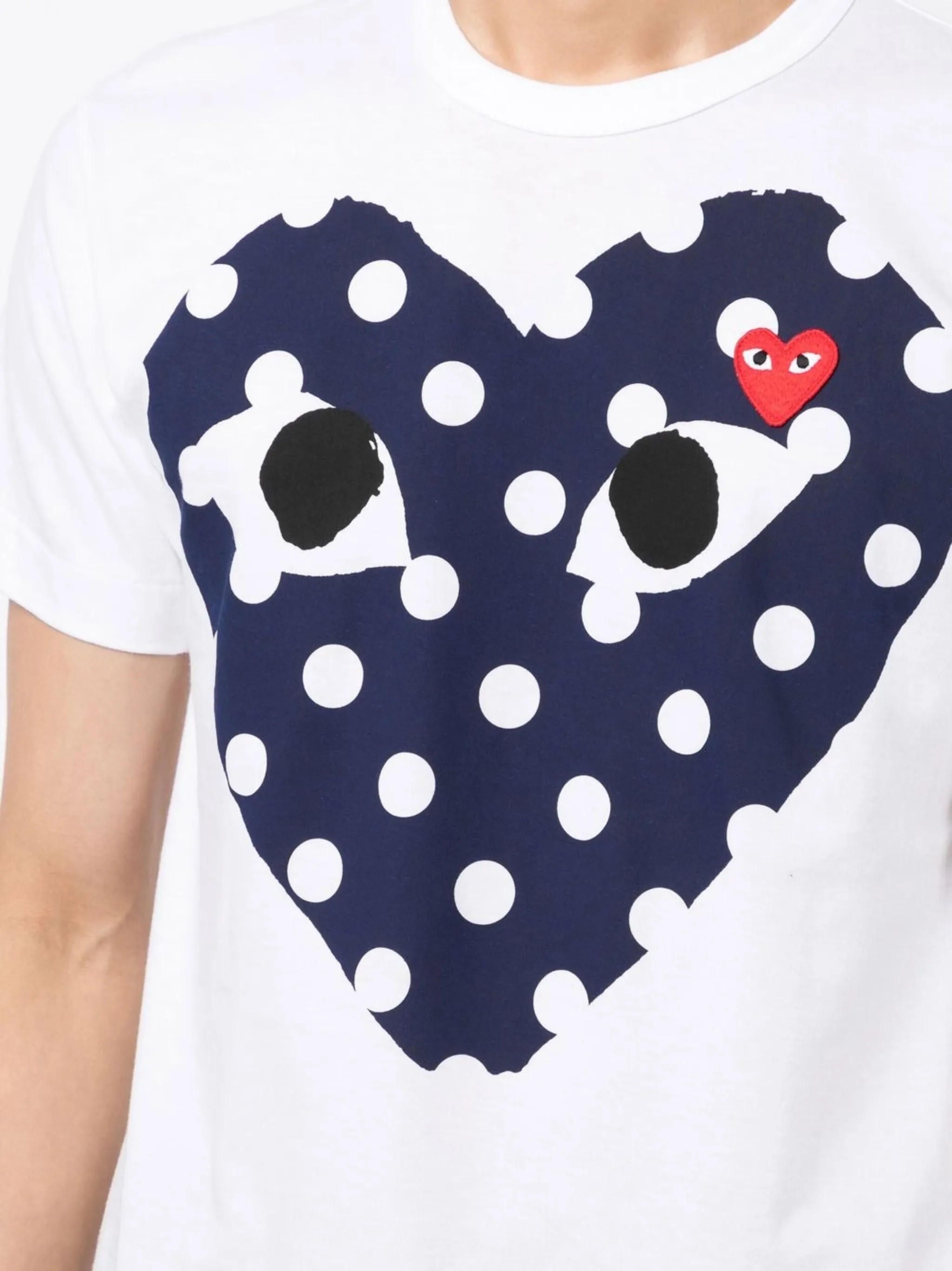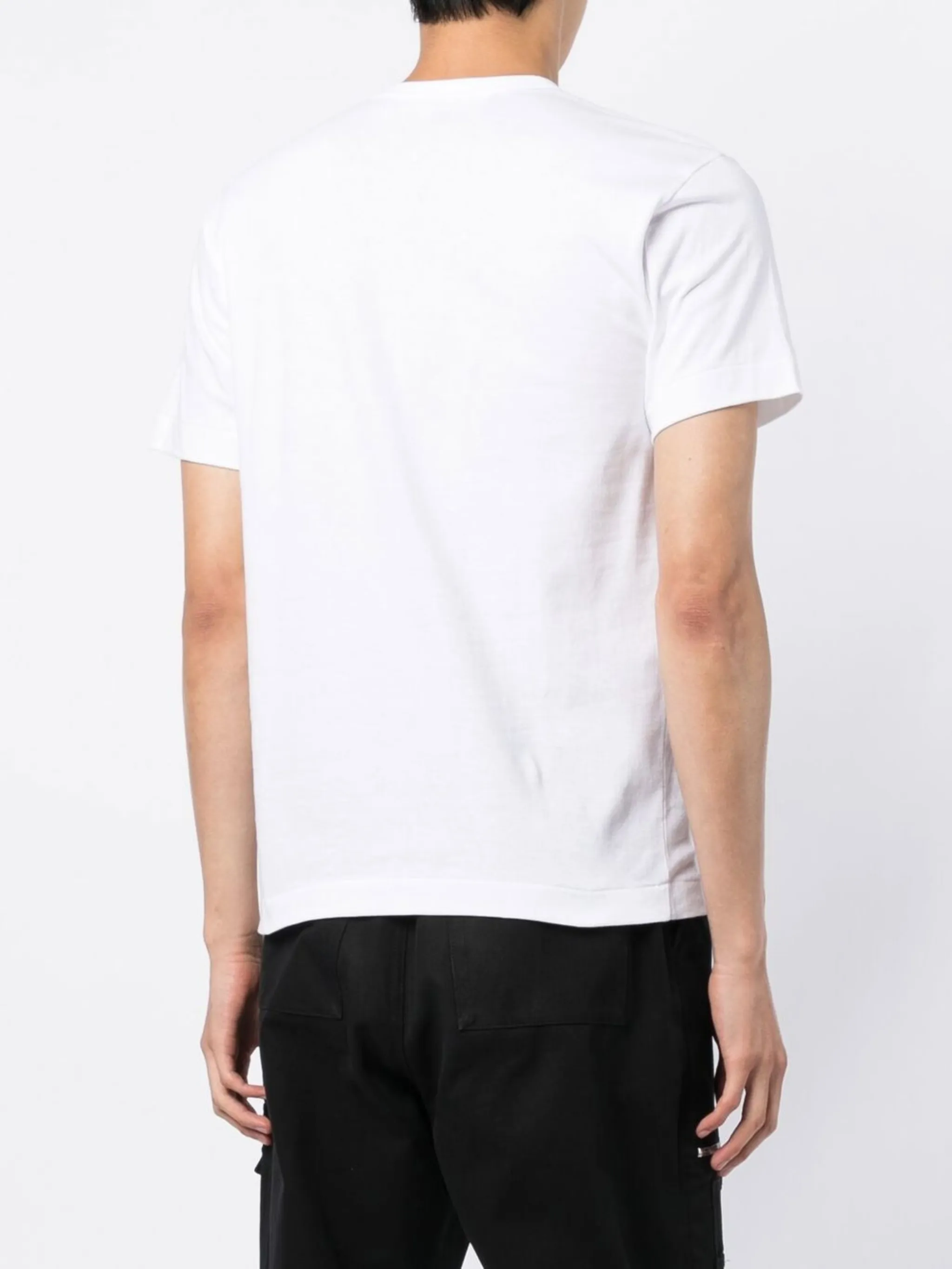 Белая хлопковая футболка с сердцем от Comme Des Garçons Play. Круглый вырез, короткие рукава, прямой подол, принт с логотипом спереди, контрастный вышитый логотип на груди.