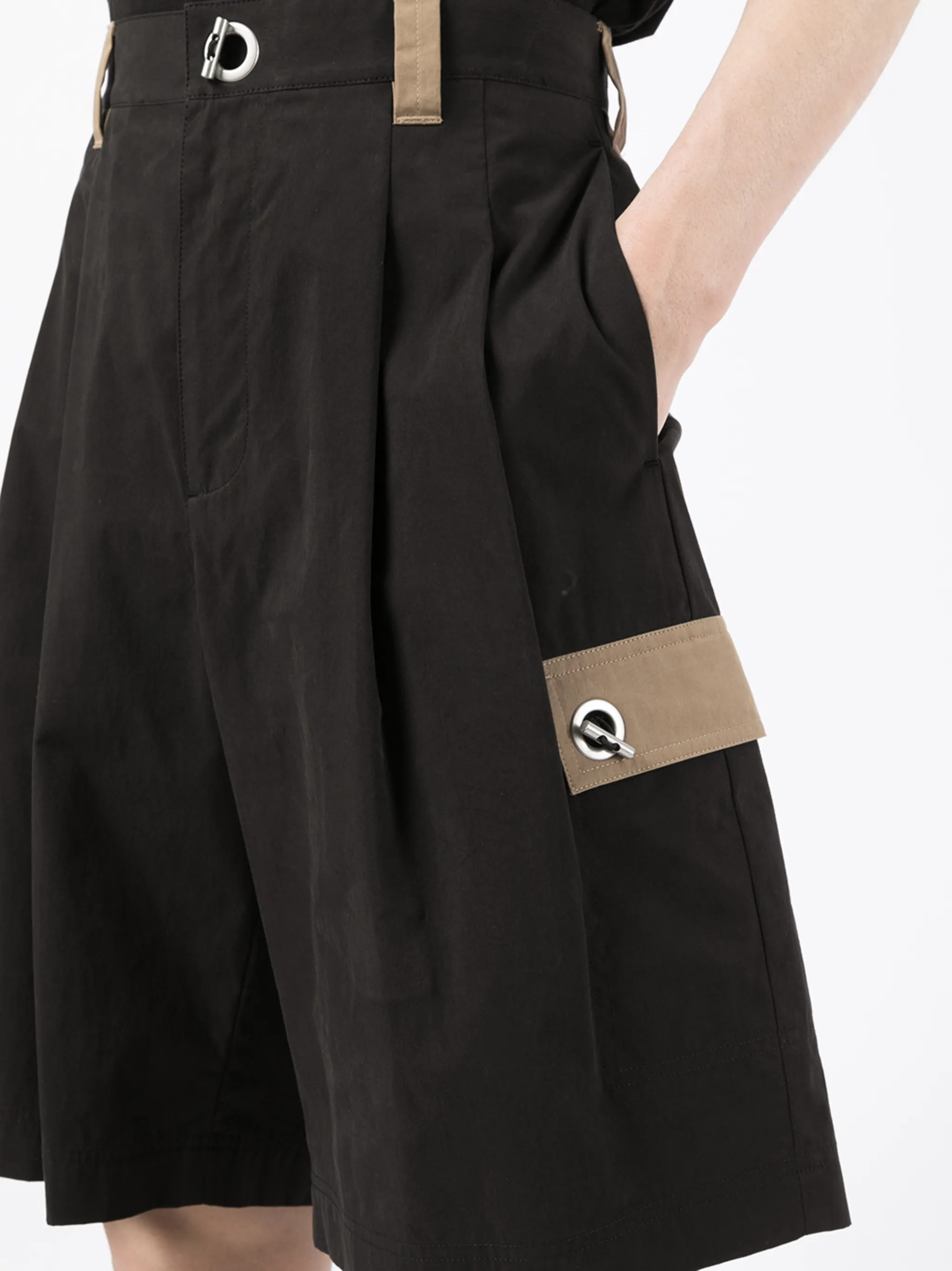 Дизайн колор-блок, плиссировка, петли для ремня, Т-образная застежка, два прорезных кармана по бокам, два кармана с листочкой сзади и длина по колено.