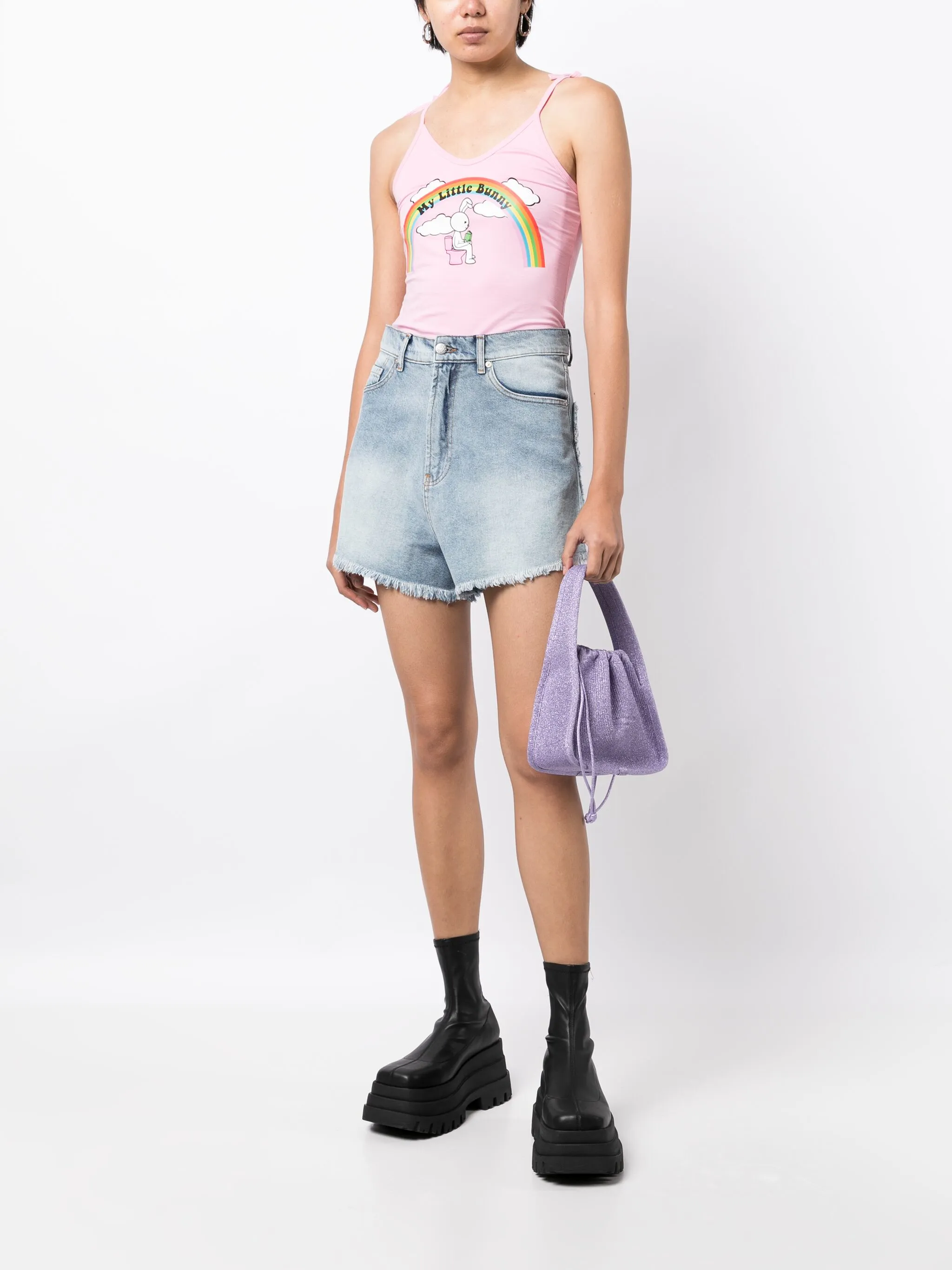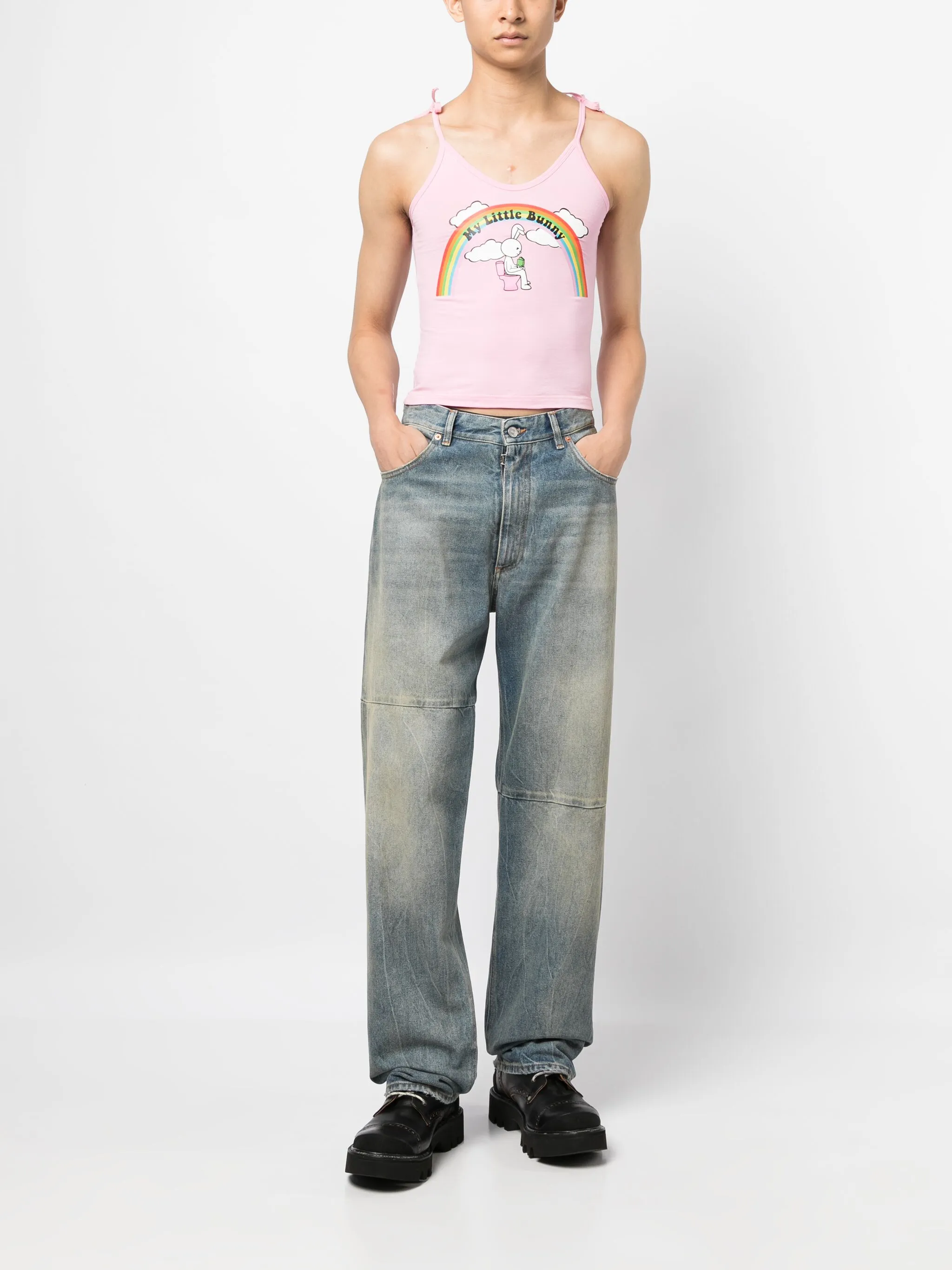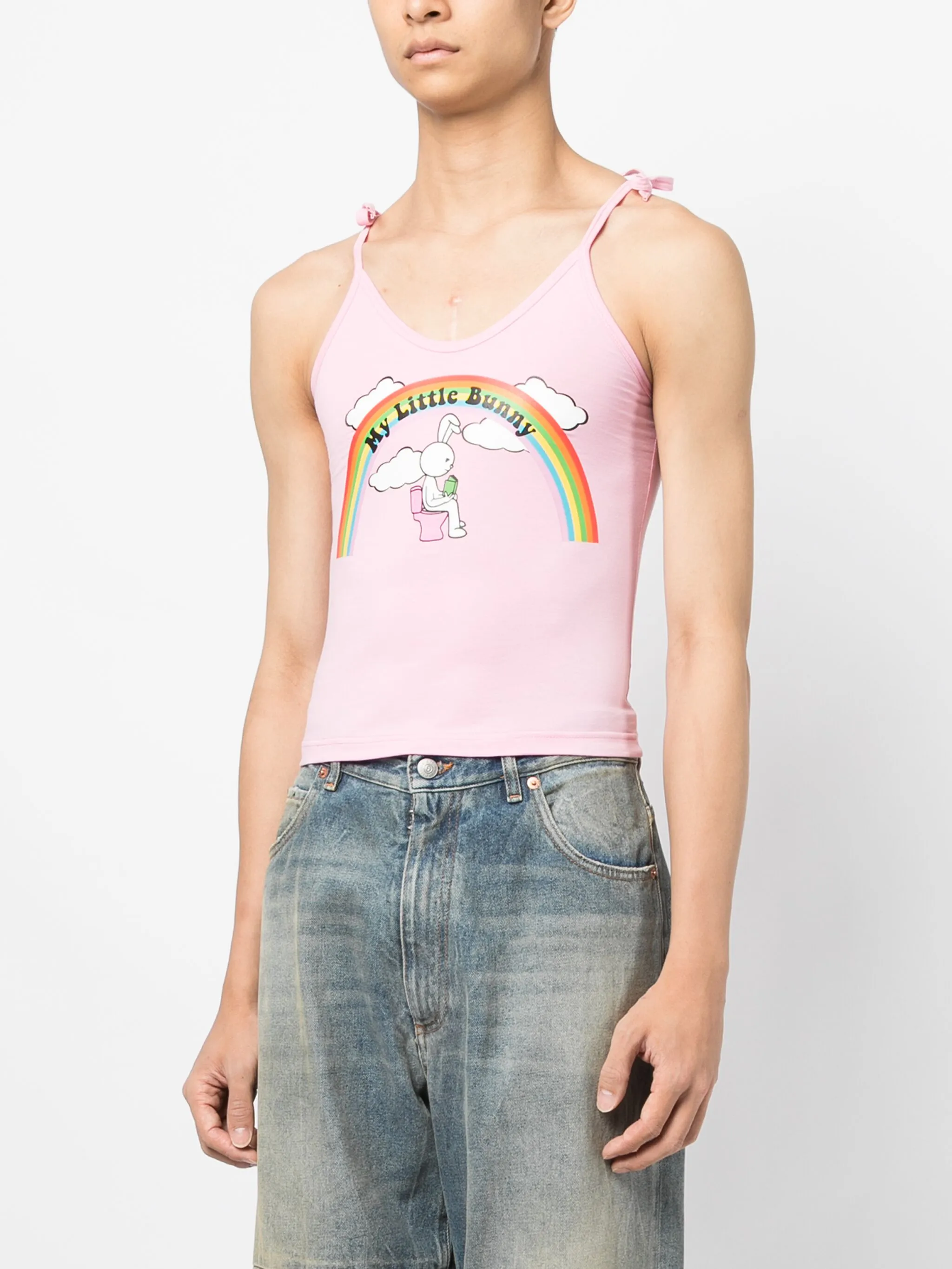Светло-розовый, эластичный хлопок, графичный принт спереди, радужный принт, круглый вырез, застежка на узел, без рукавов и прямой подол. Это унисекс-модель. Обратите внимание, что для нее используется мужская размерная сетка.