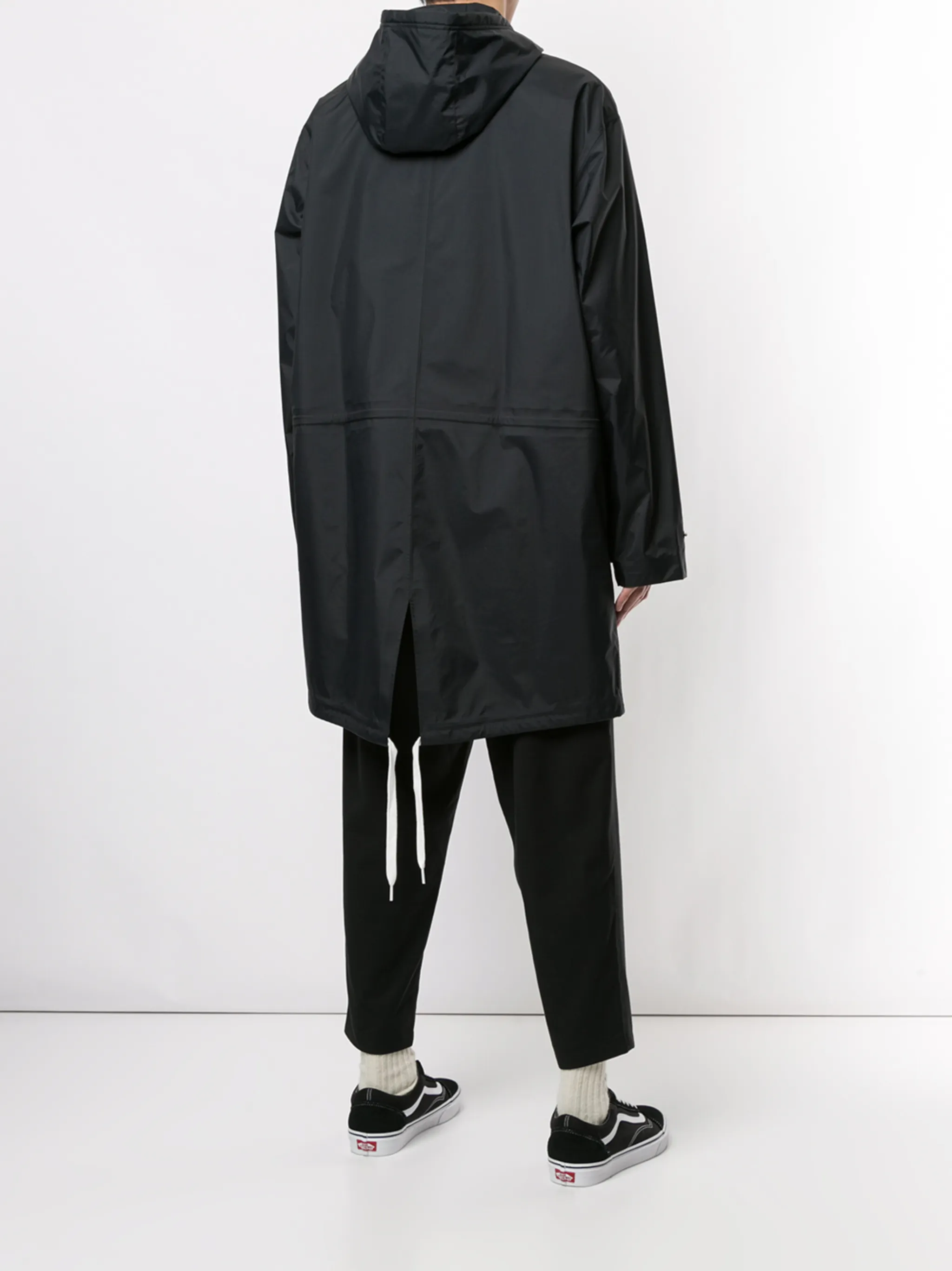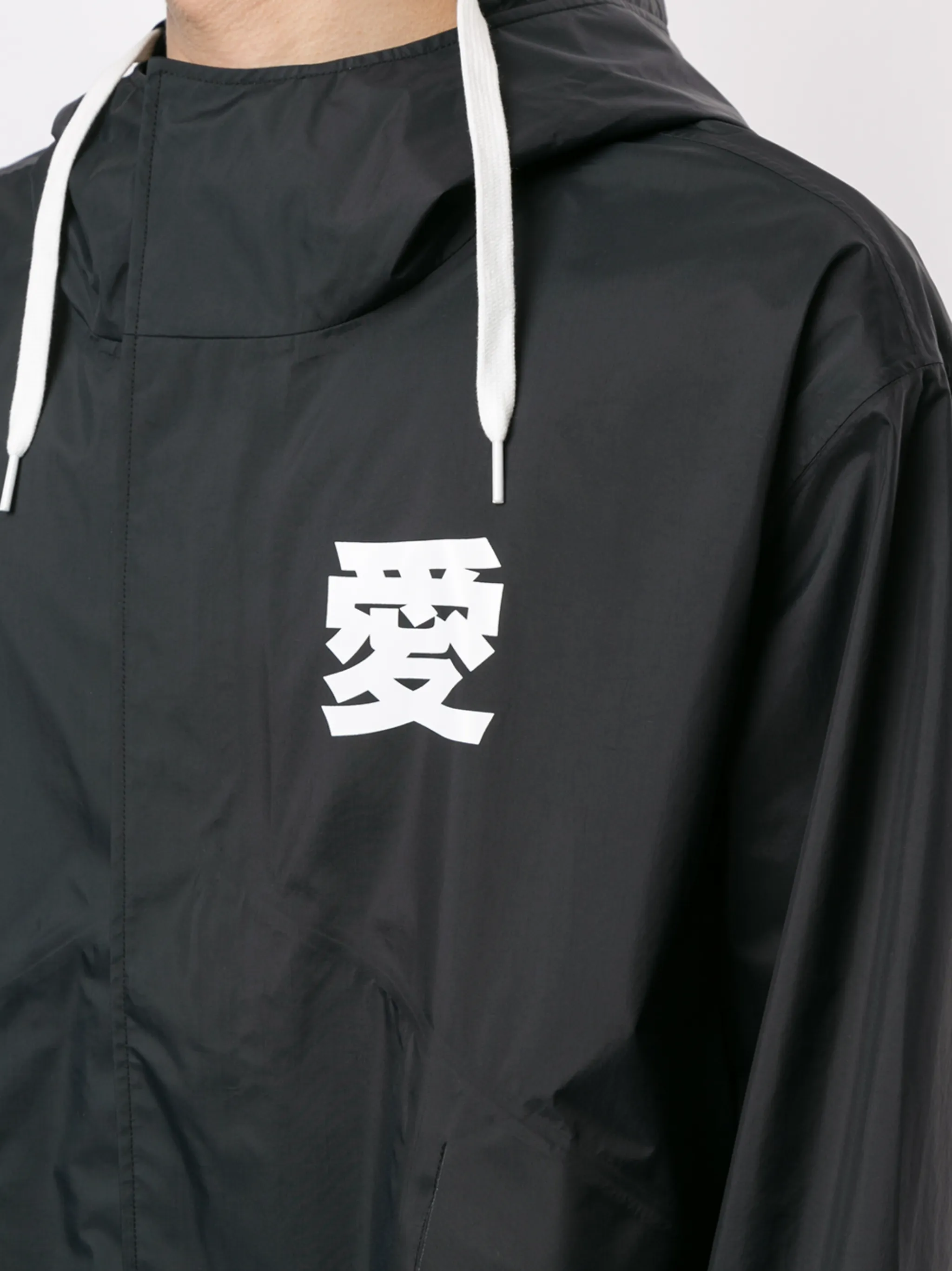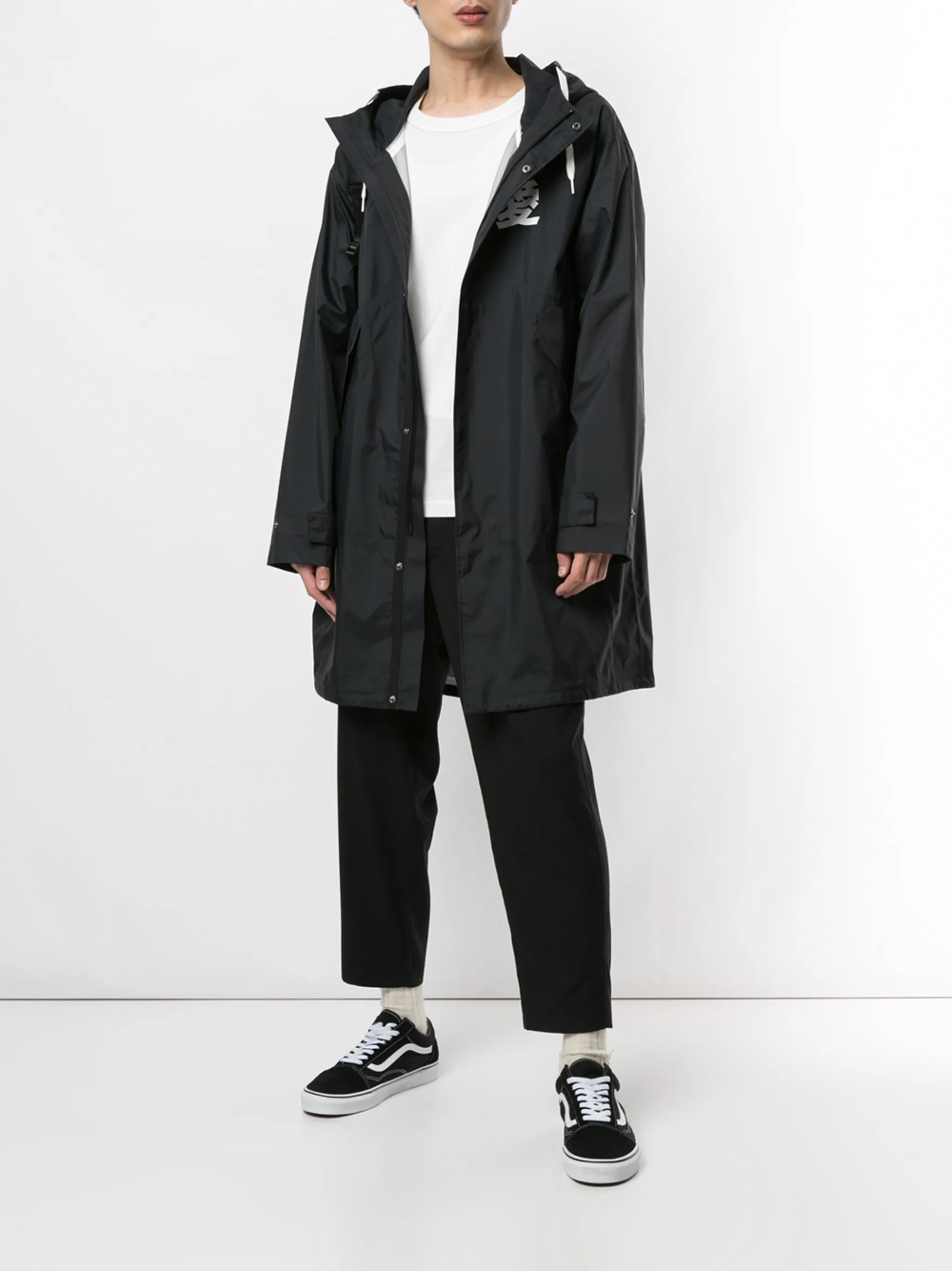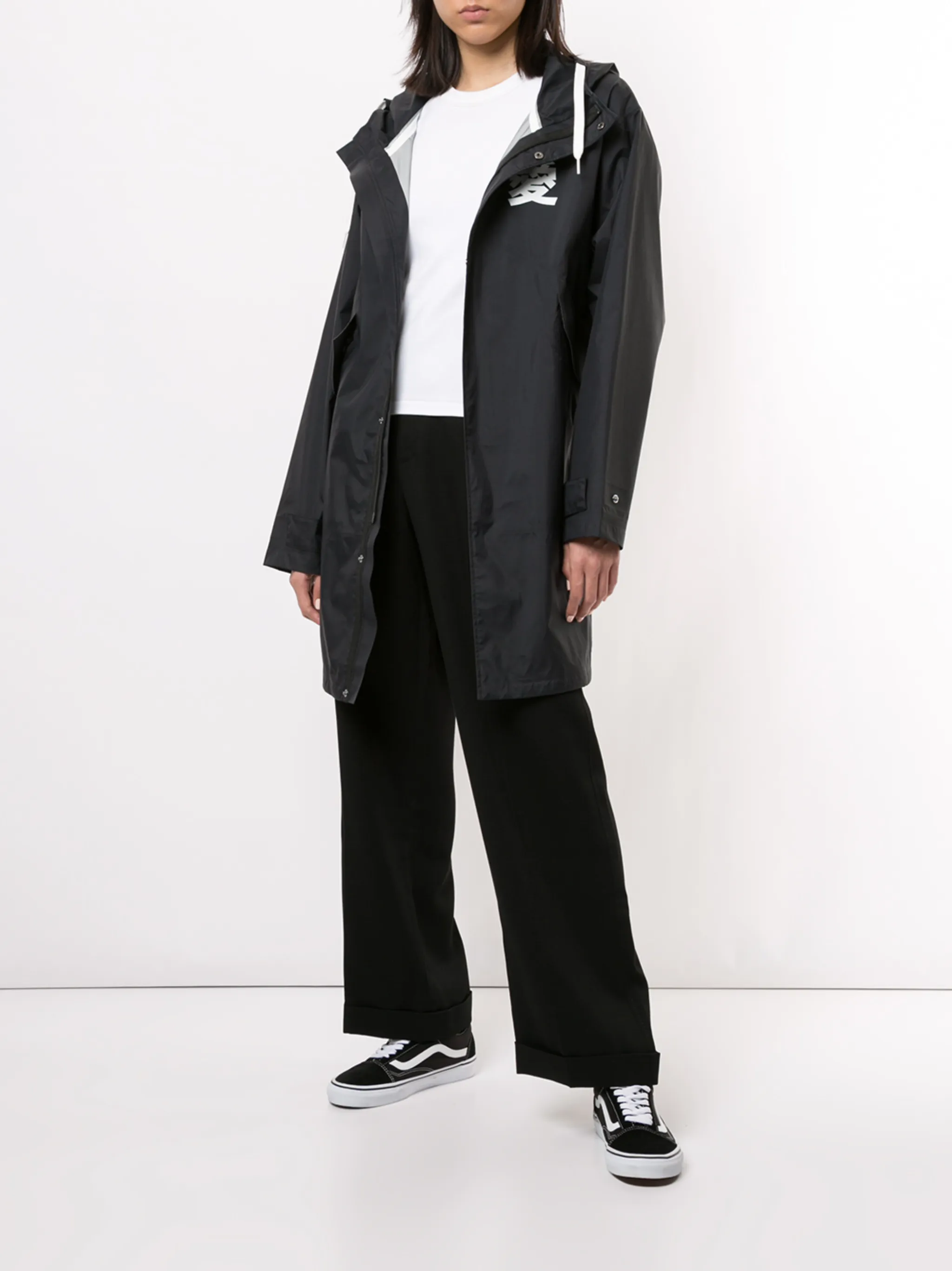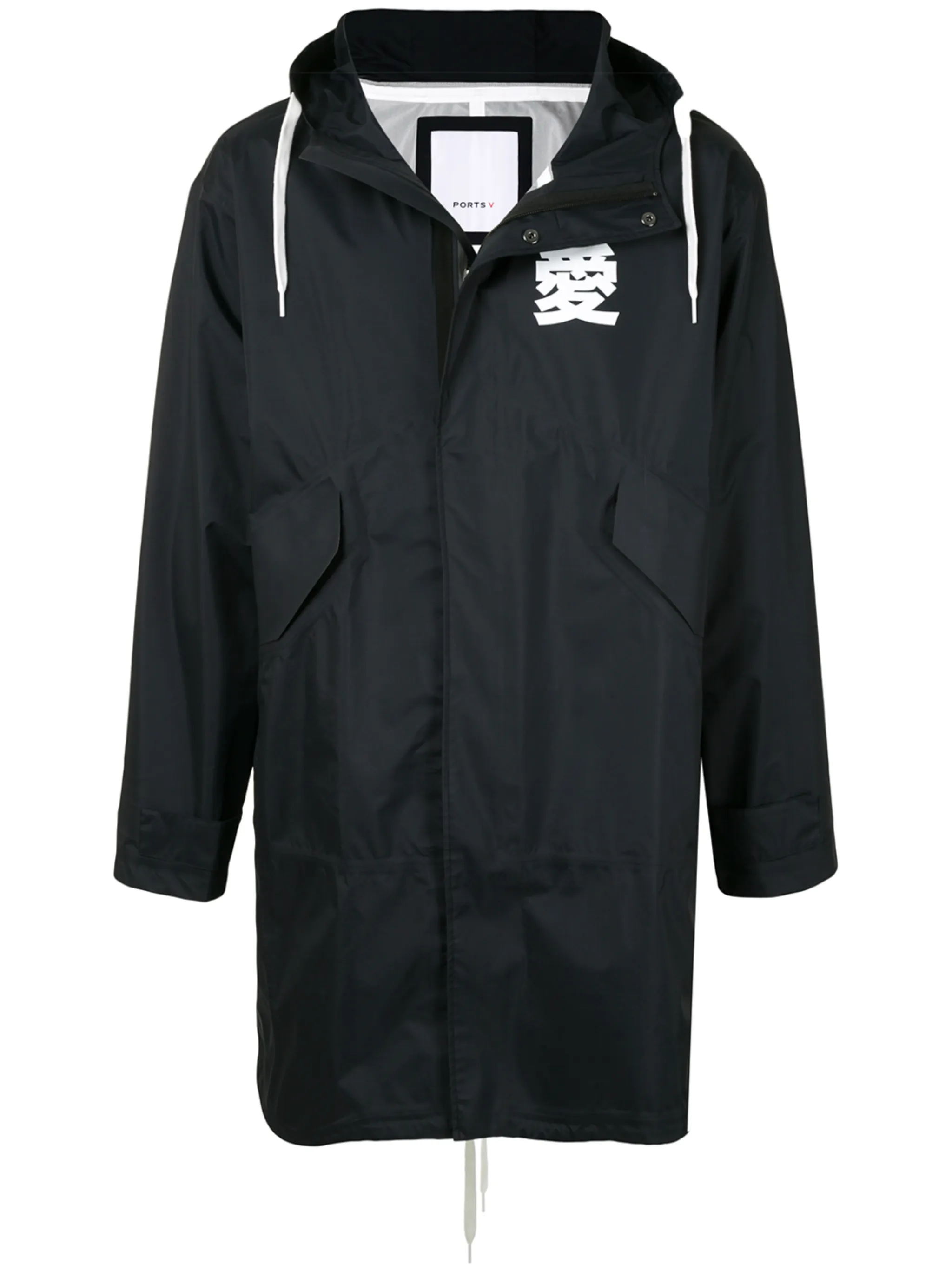 Принт с логотипом на груди, два передних кармана с клапанами, высокий воротник, объемный капюшон на шнурке, длинные рукава, шлица по центру сзади, кулиска на талии и потайная застежка спереди. Цвет: черный.