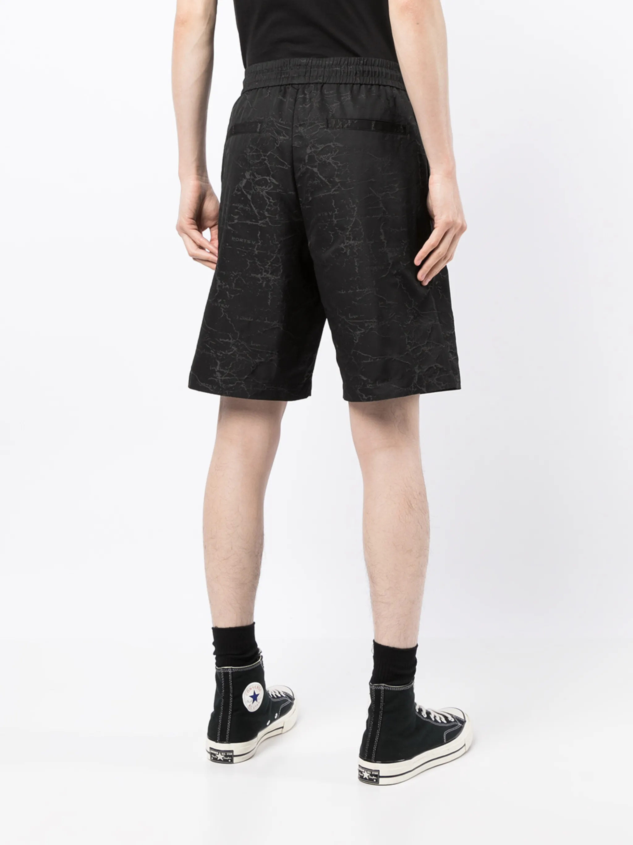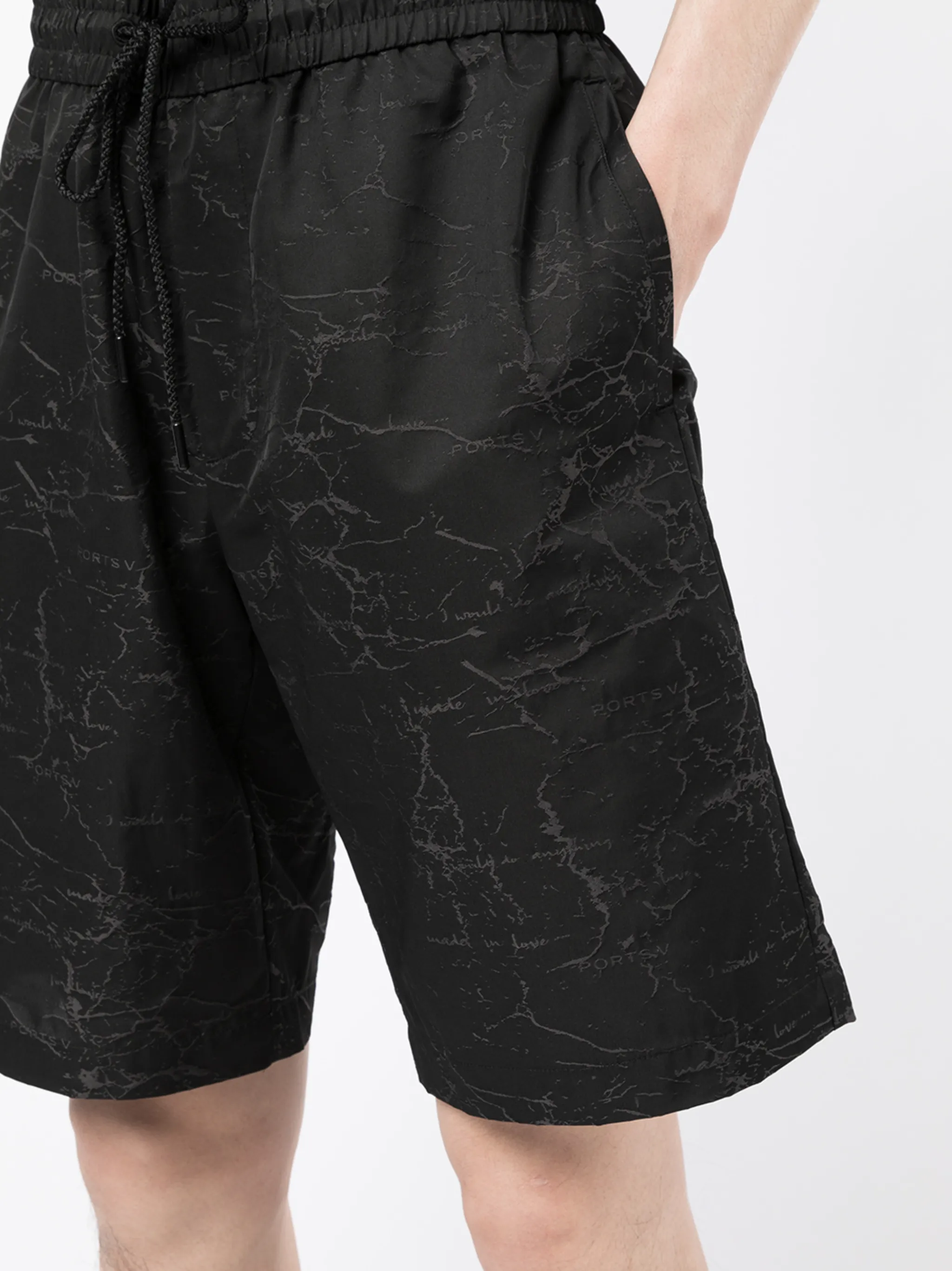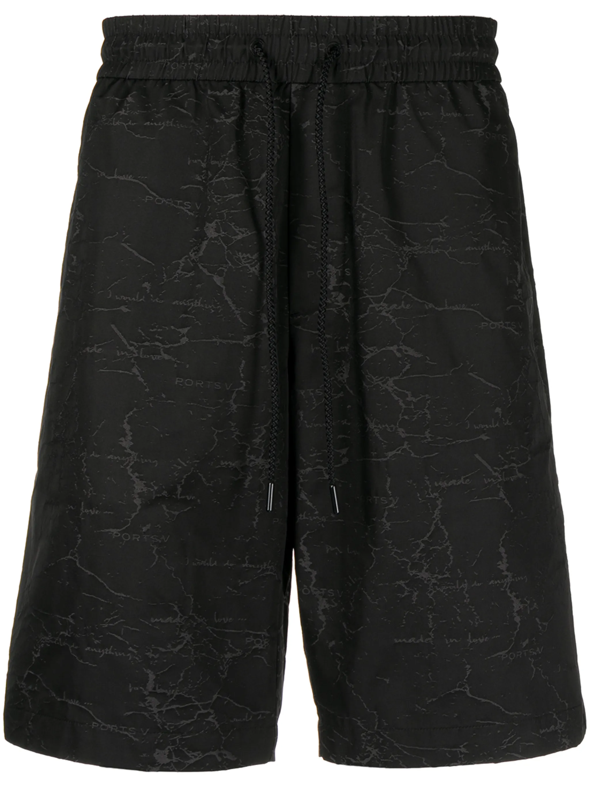 Сплошной принт с логотипом, эластичный пояс на шнурке, два прорезных кармана по бокам, длина по колено и два кармана с листочкой сзади. Цвет: черный.