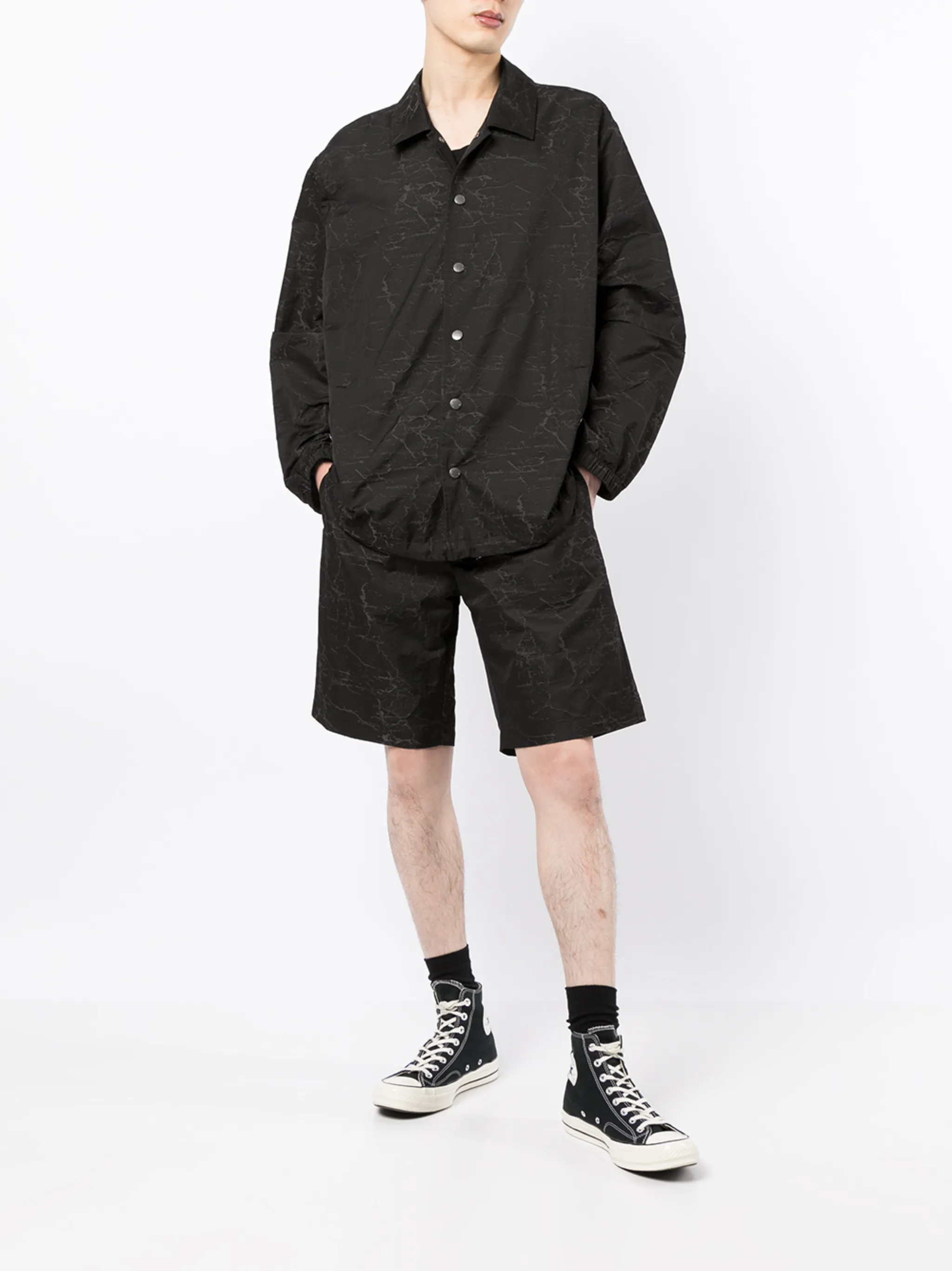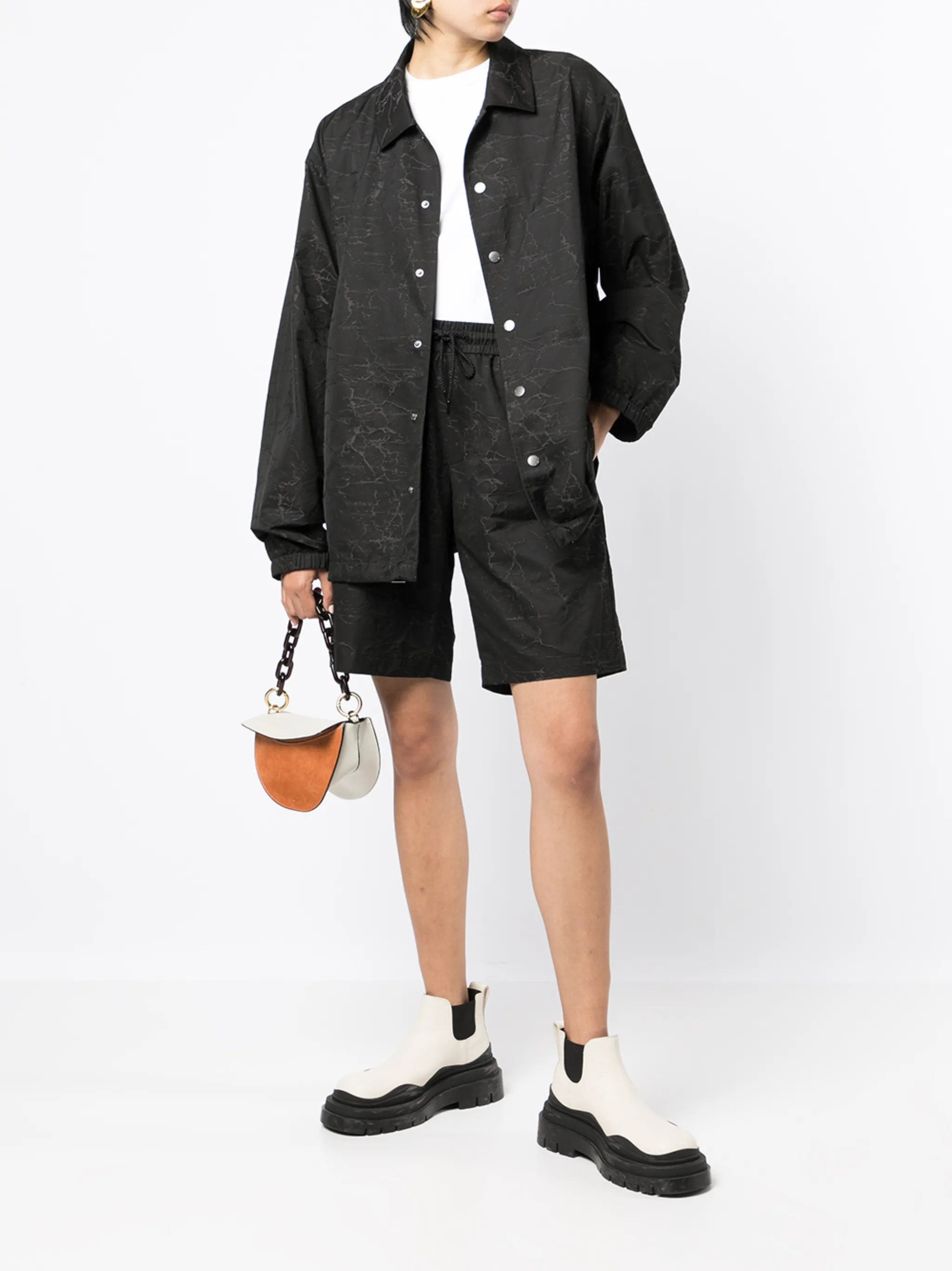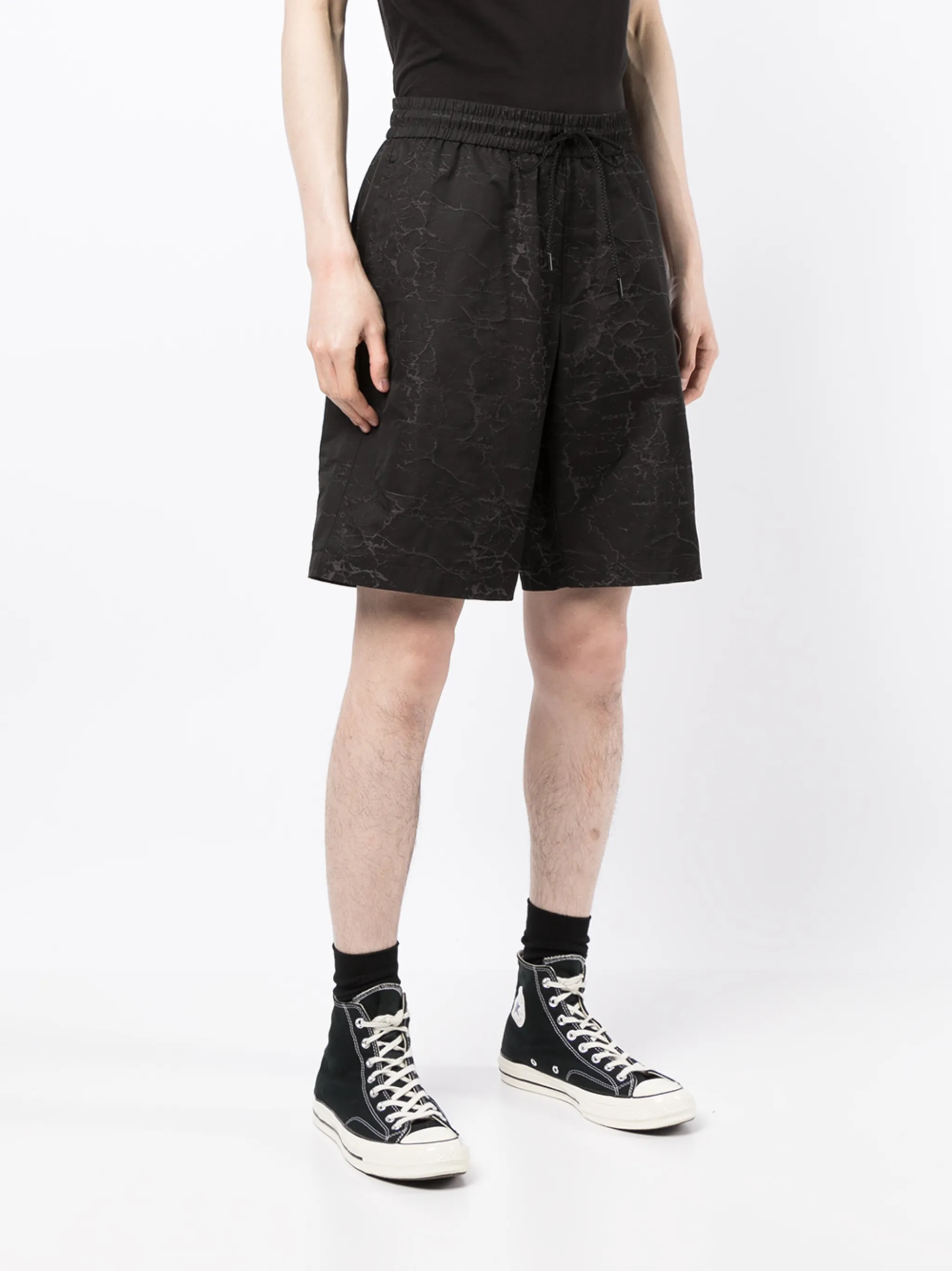 Сплошной принт с логотипом, эластичный пояс на шнурке, два прорезных кармана по бокам, длина по колено и два кармана с листочкой сзади. Цвет: черный.