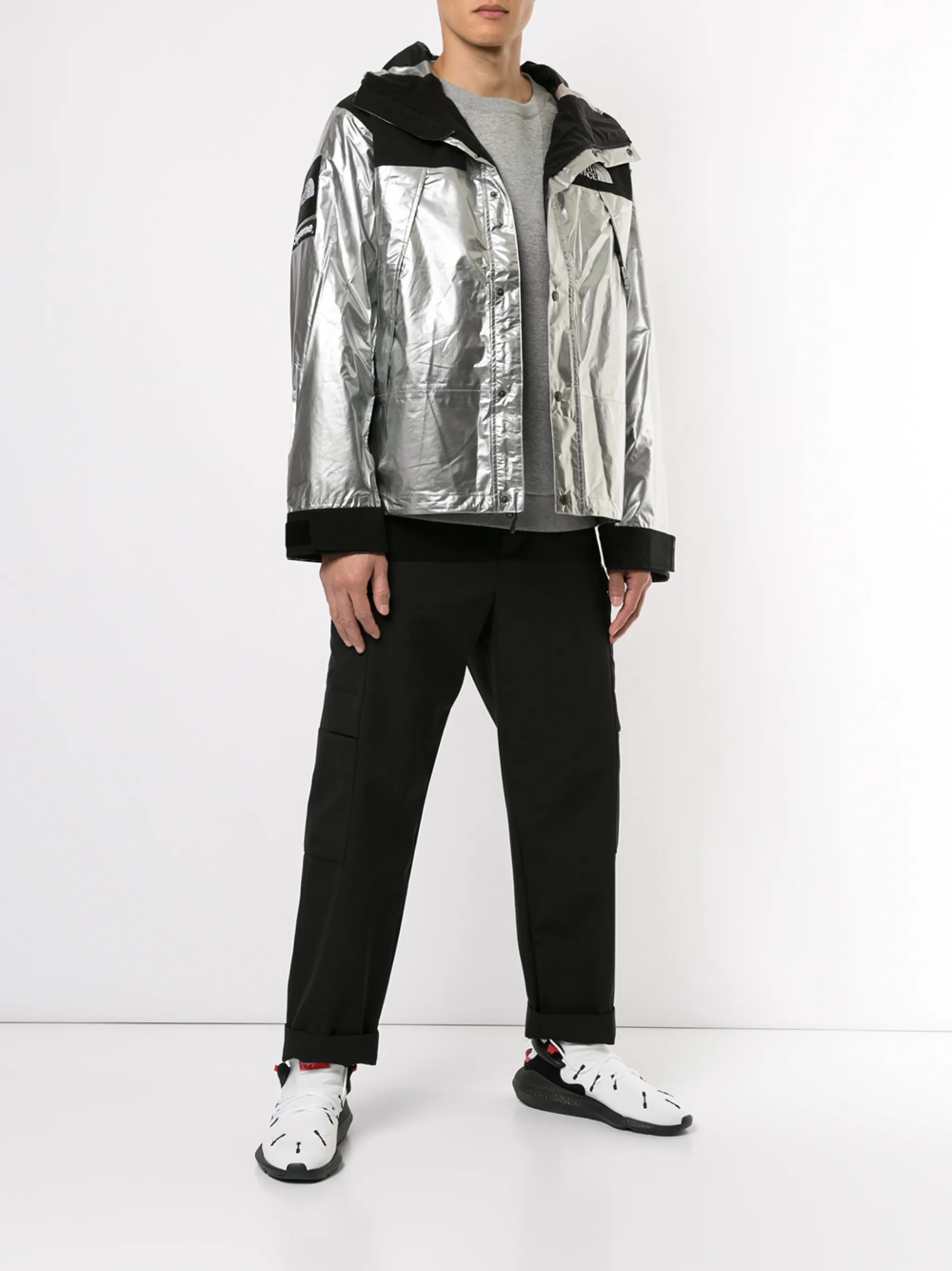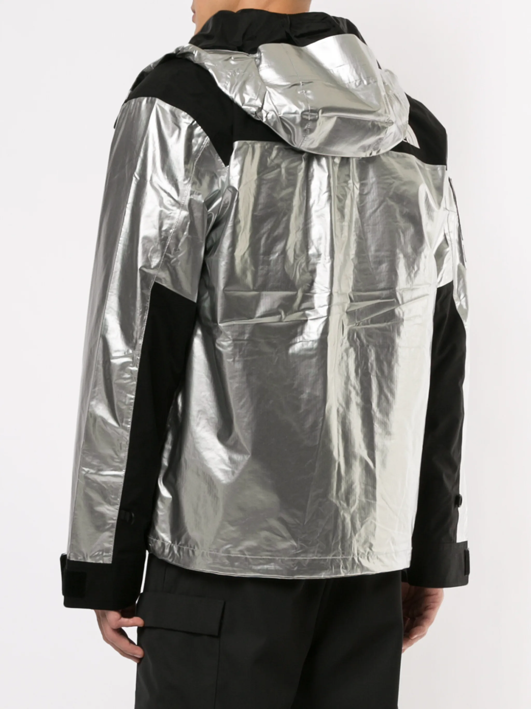 Парка TNF Metallic Mountain от Supreme. Капюшон, застежка на кнопках, длинные рукава и металлический отблеск.