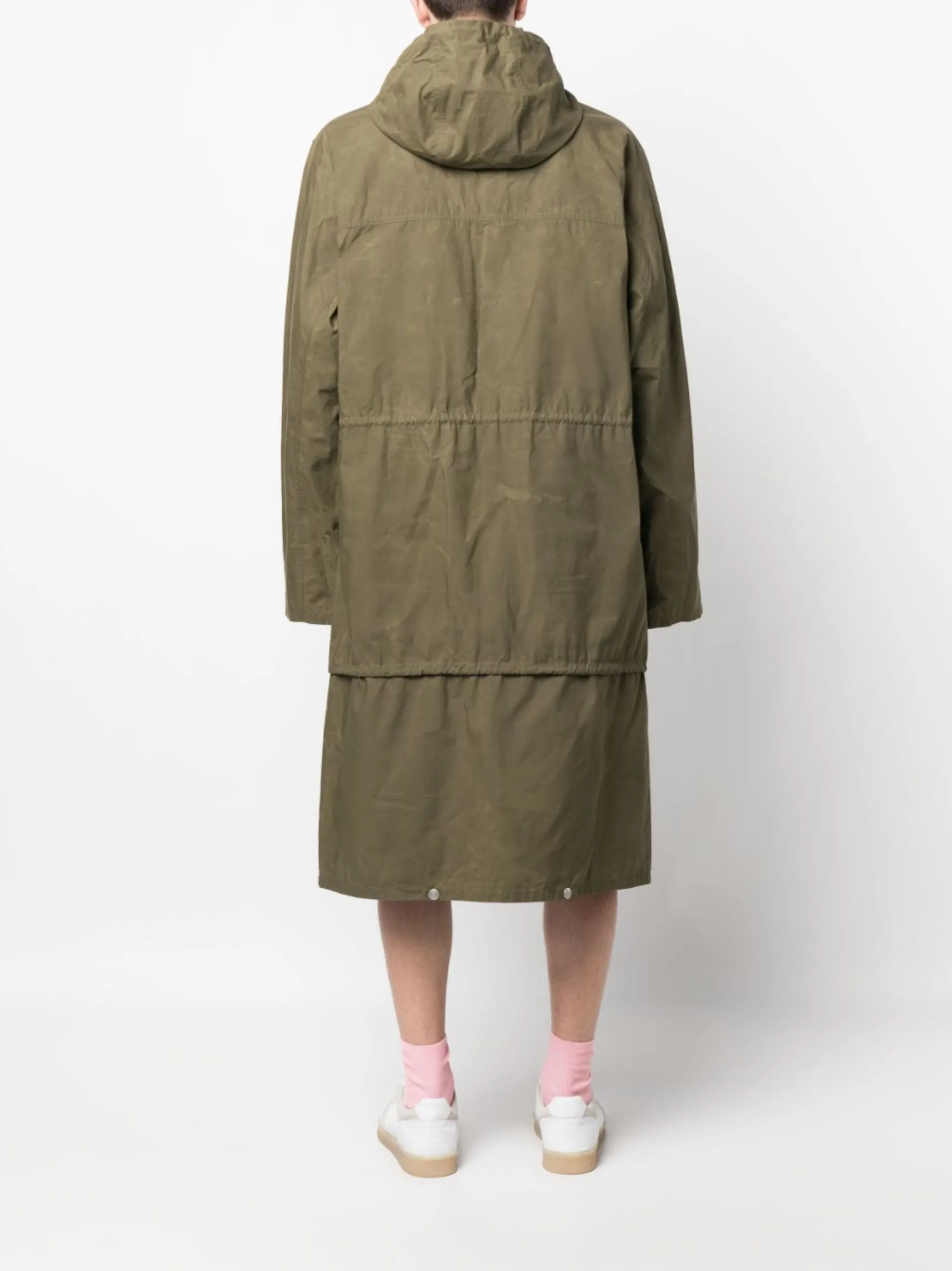 Хаки, хлопок, нашивка с логотипом на груди, затягивающийся на шнурок капюшон, застежка на пуговицах спереди, эполеты, длинные рукава, четыре накладных кармана спереди, кулиска на талии, прямой подол и длина миди.