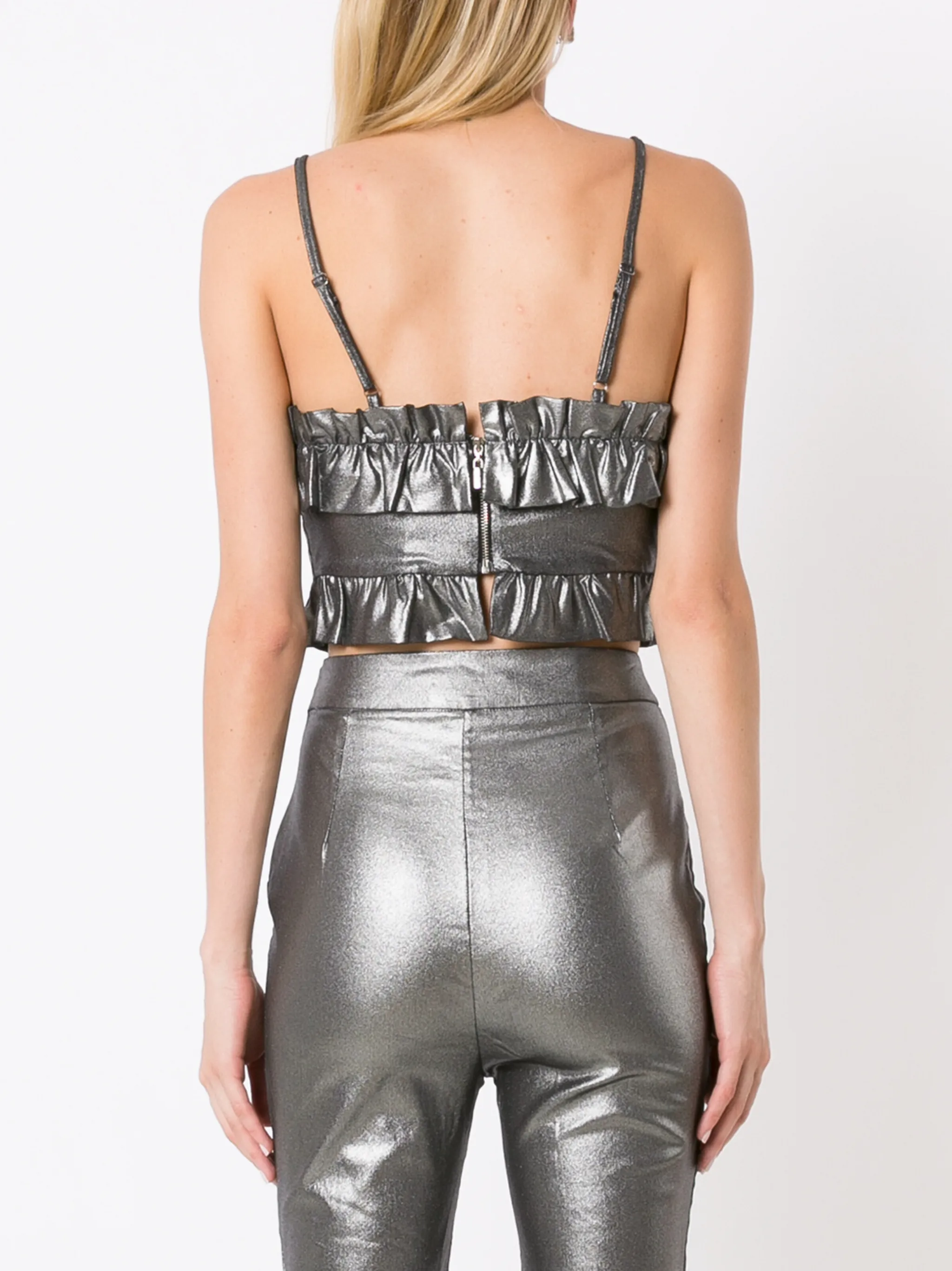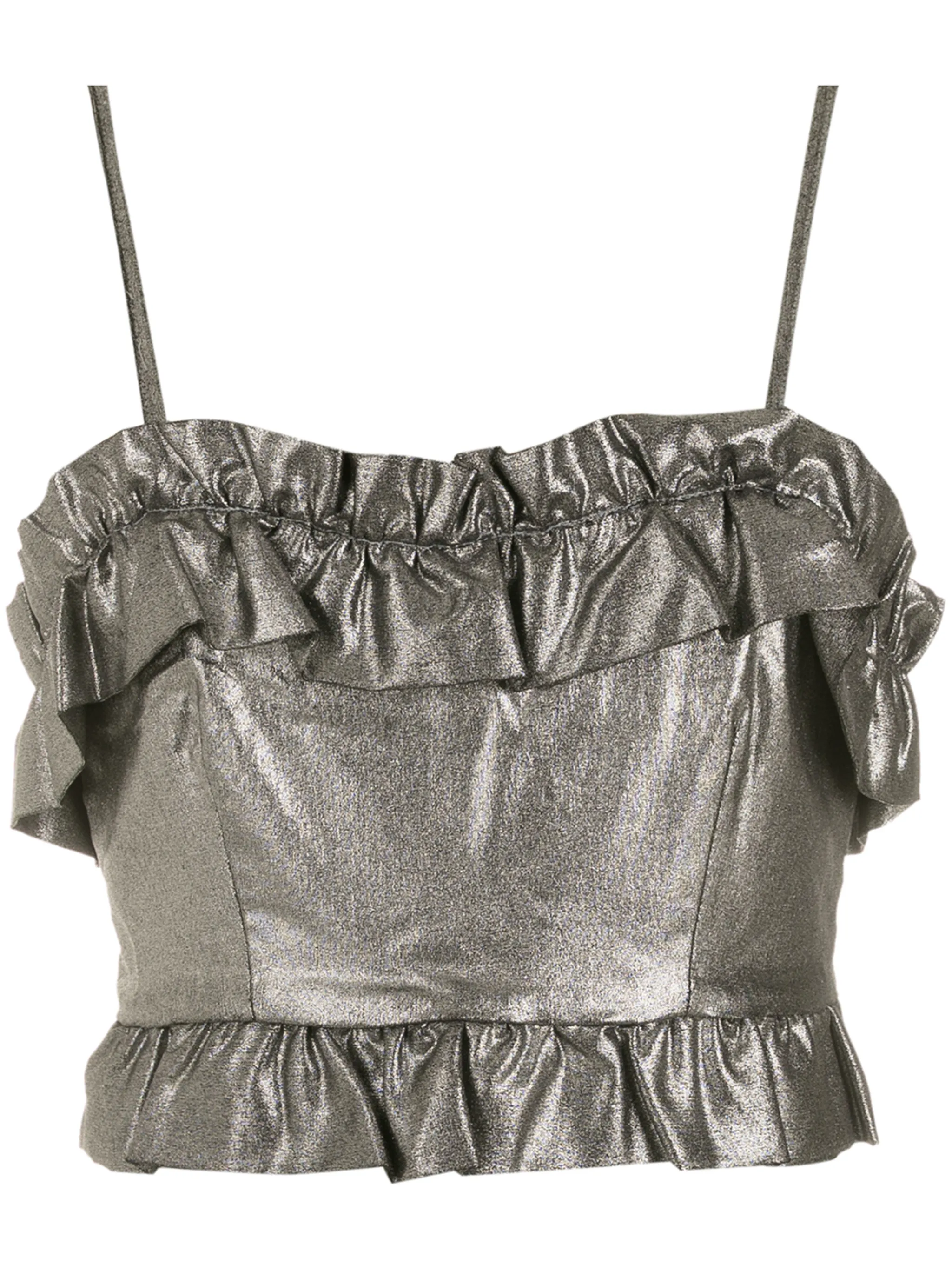 Металллизированное покрытие, отделка с оборками, регулируемые тонкие бретели и застежка на молнии сзади.