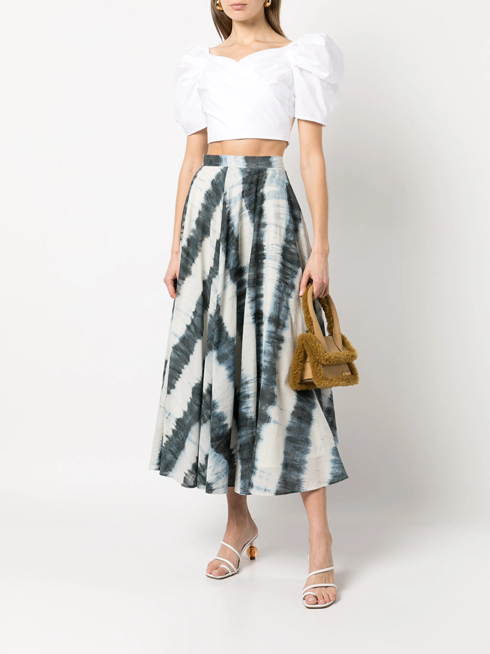 V-образный вырез, юбка с запахом, короткие объемные рукава, потайная застежка на молнии сзади и укороченная длина.