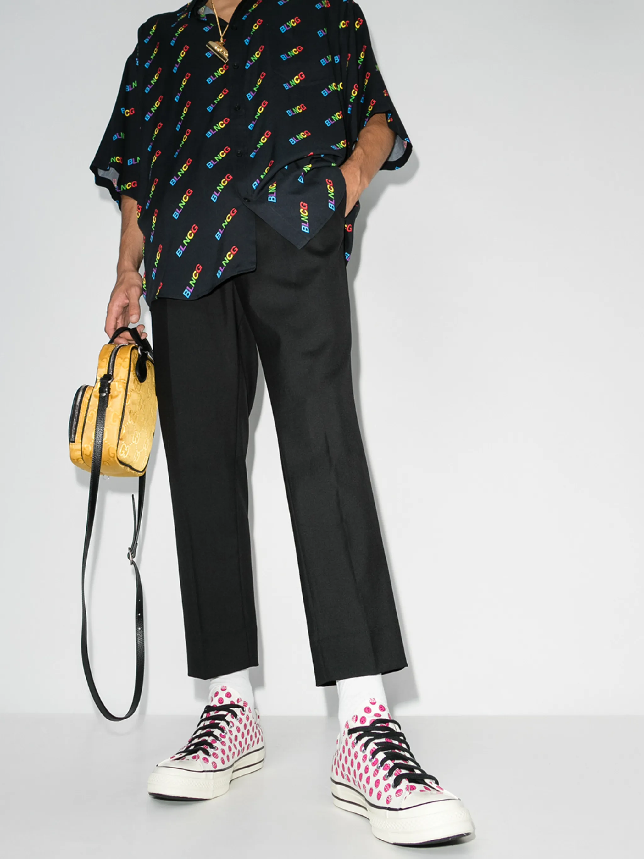 Резиновая подошва, миндалевидный носок, принт в горох и шнуровка спереди.