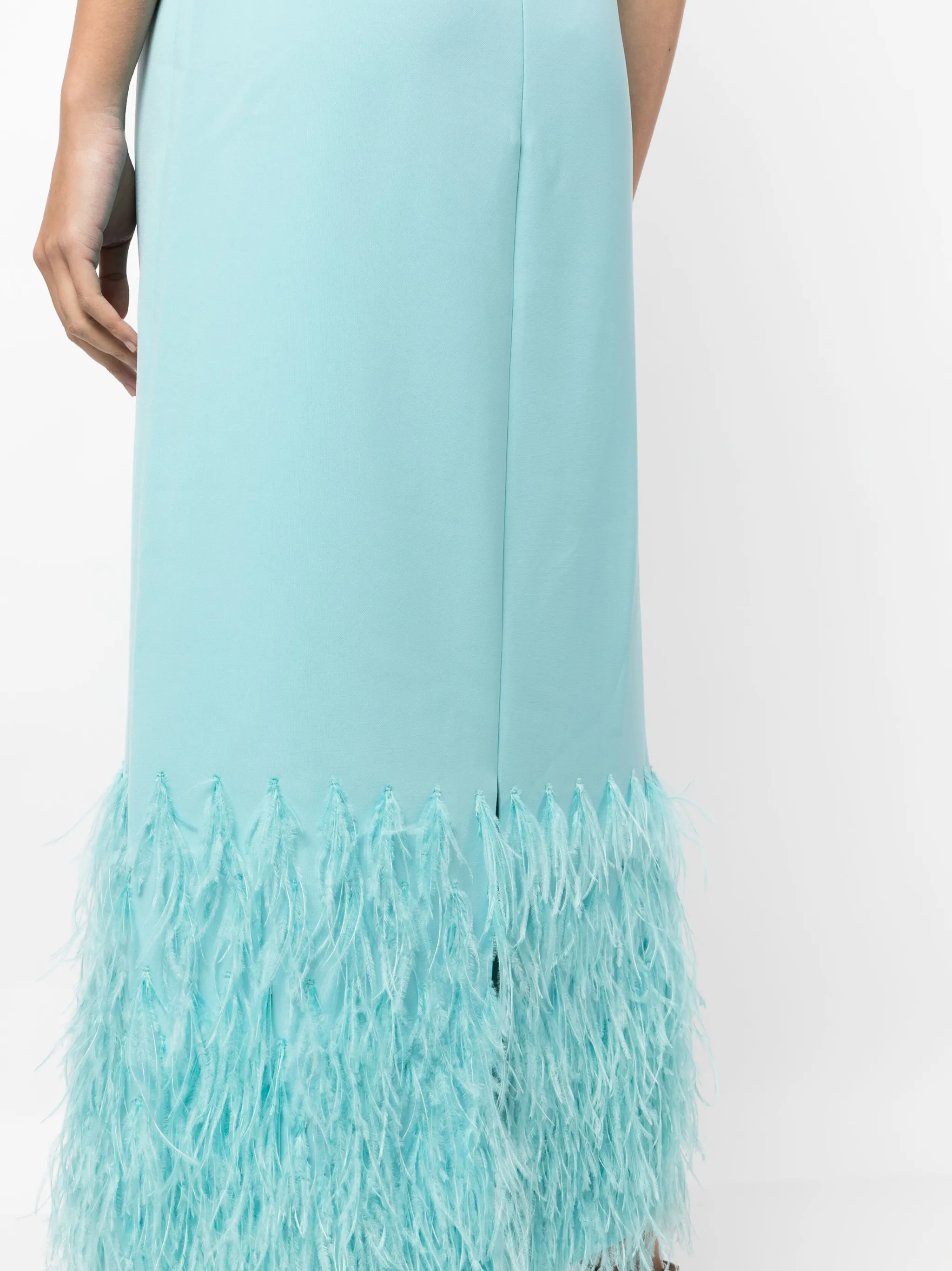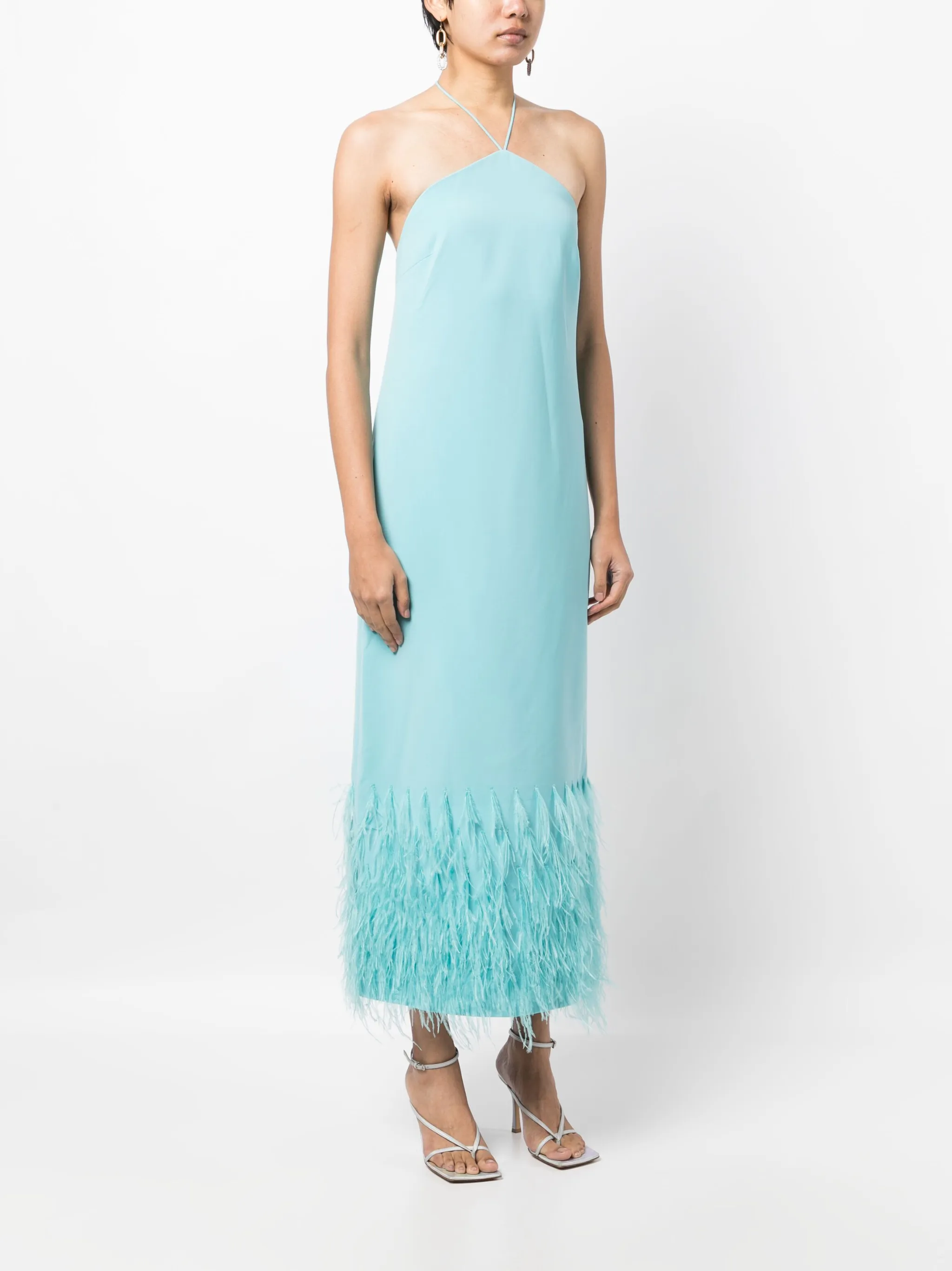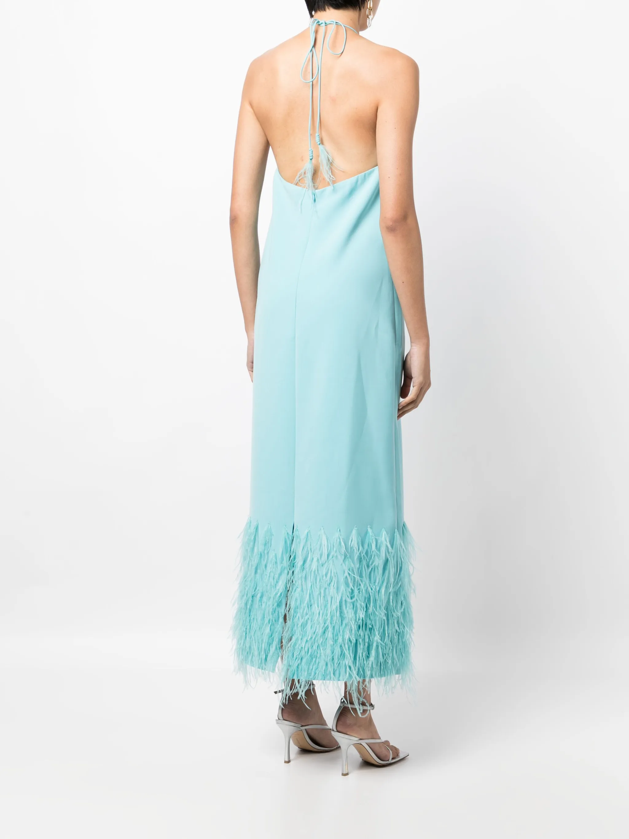 Голубой, эластичный материал, завязки вокруг шеи, открытая спина, без рукавов, расклешенный подол и прямой подол.