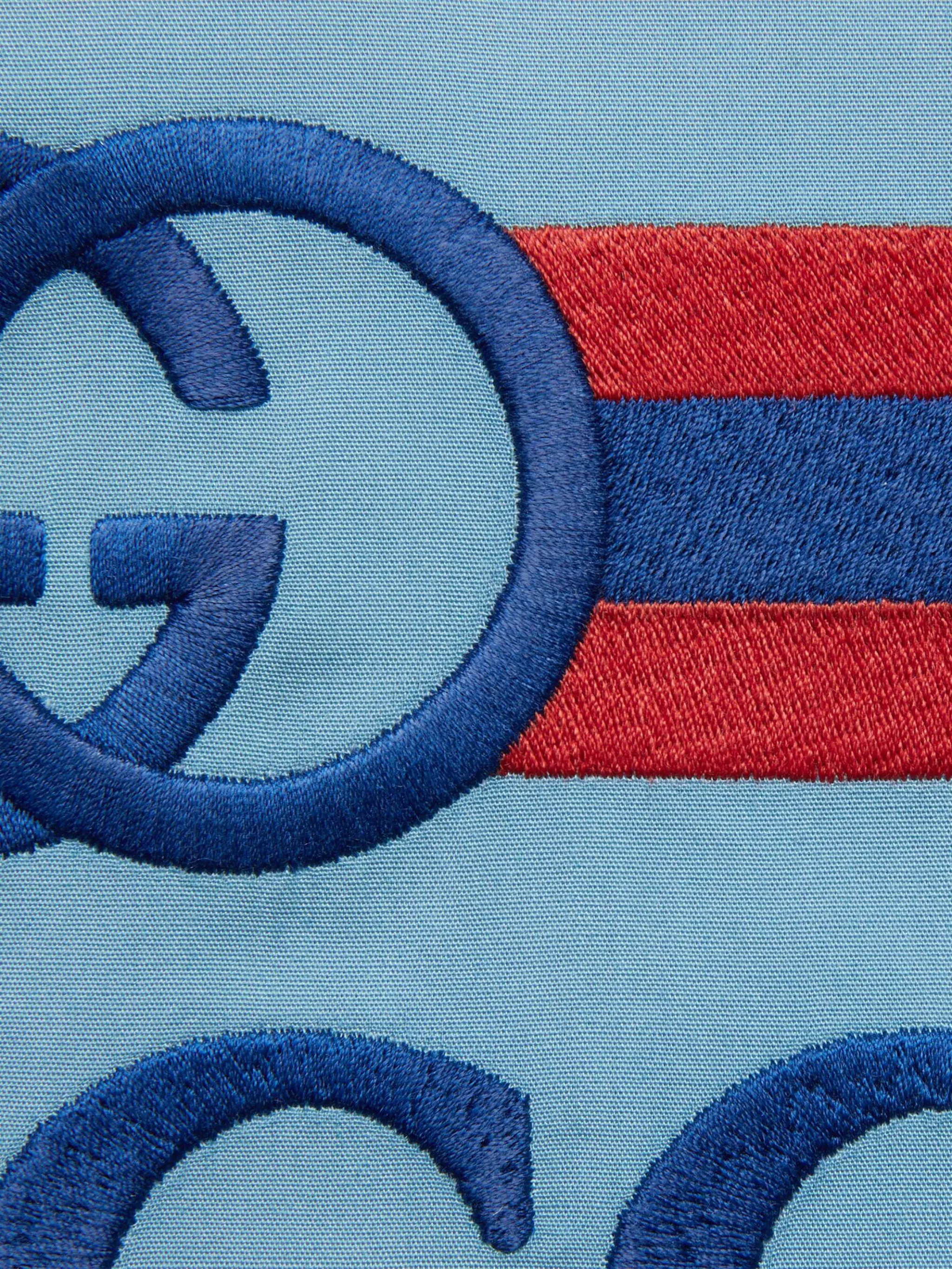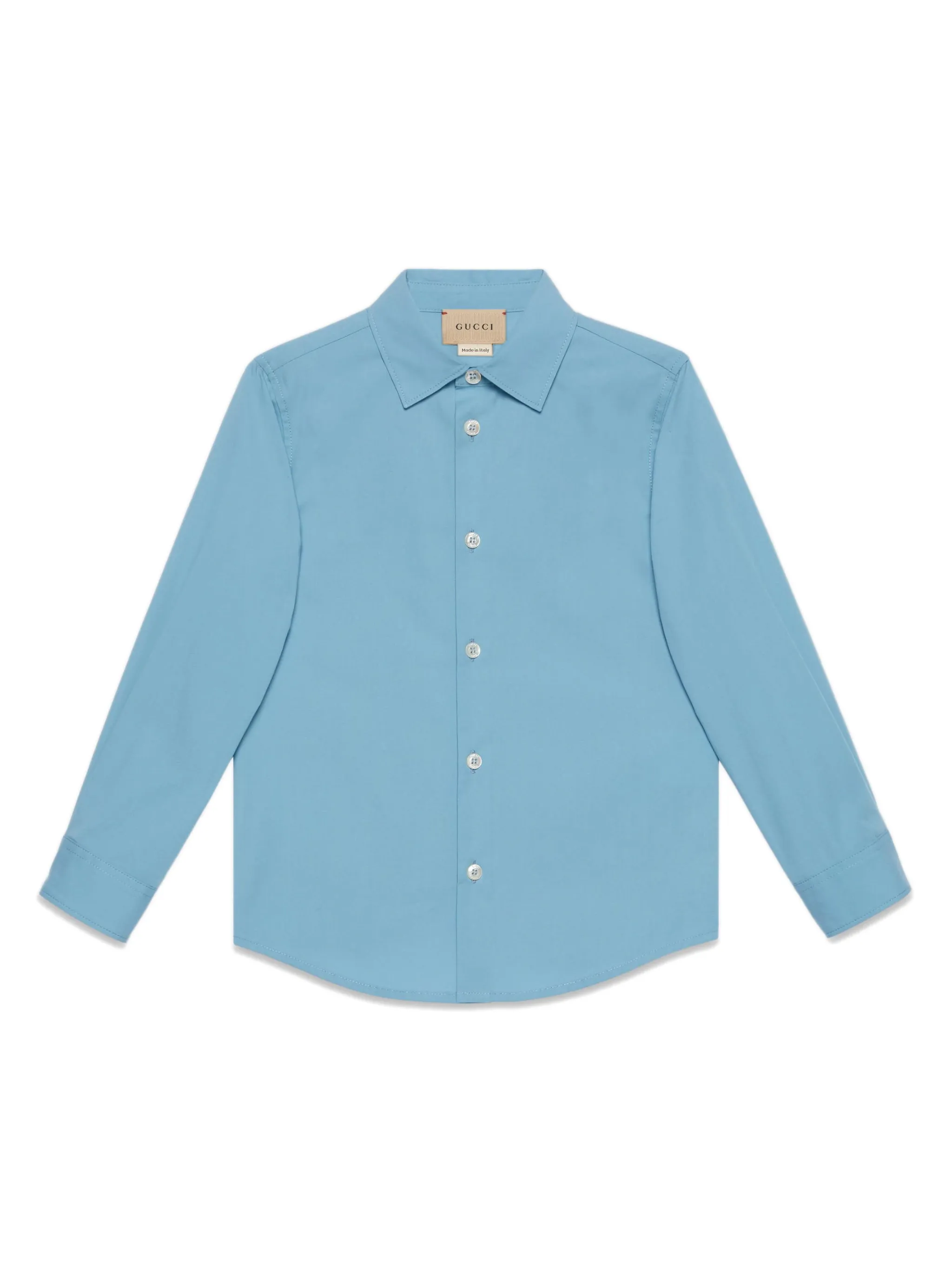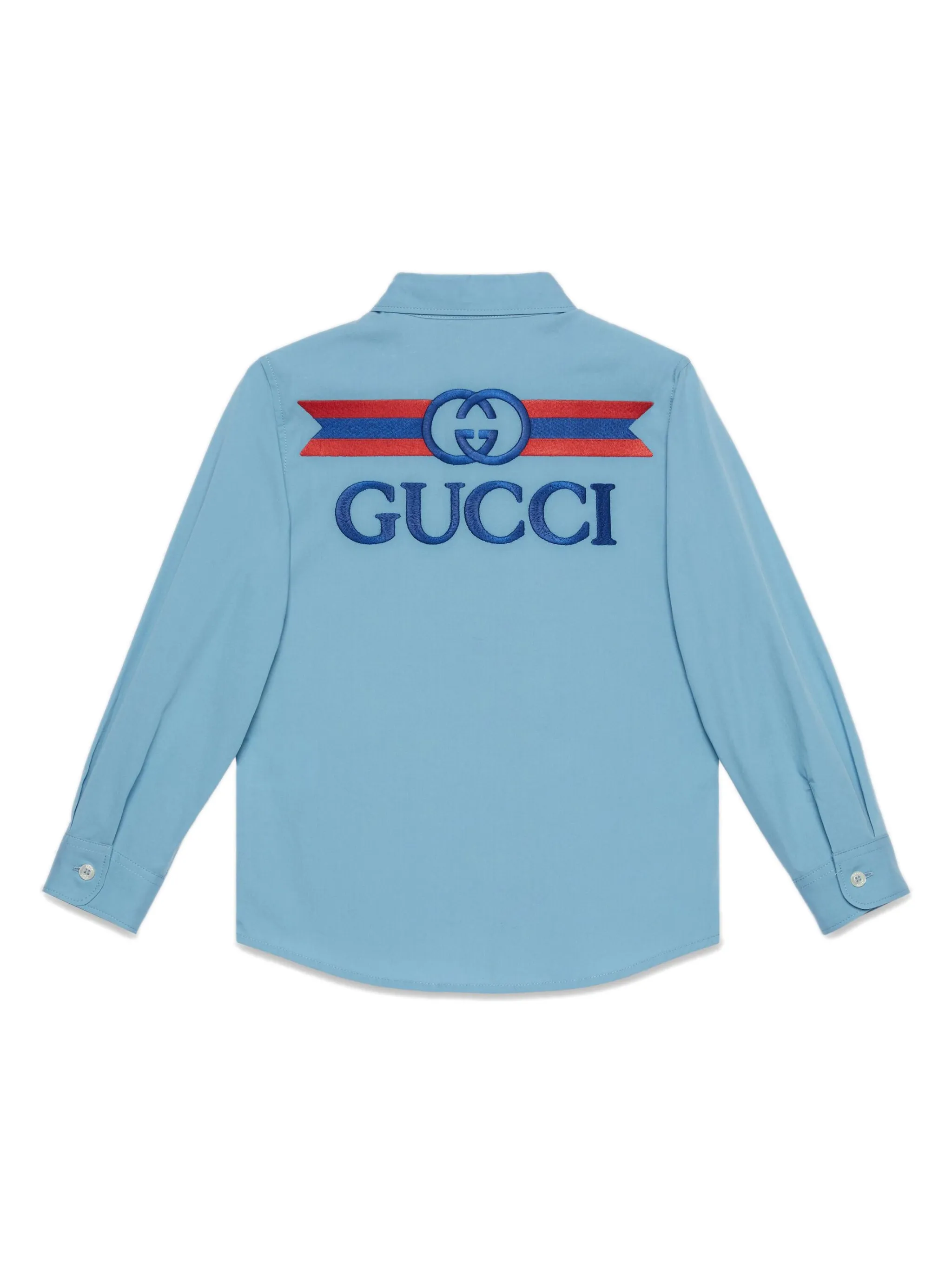 Пудрово-голубой, хлопок, логотип Interlocking G, вышитый логотип сзади, классический воротник, застежка на пуговицах спереди, длинные рукава, рукава с манжетами на пуговицах и закругленный подол.
