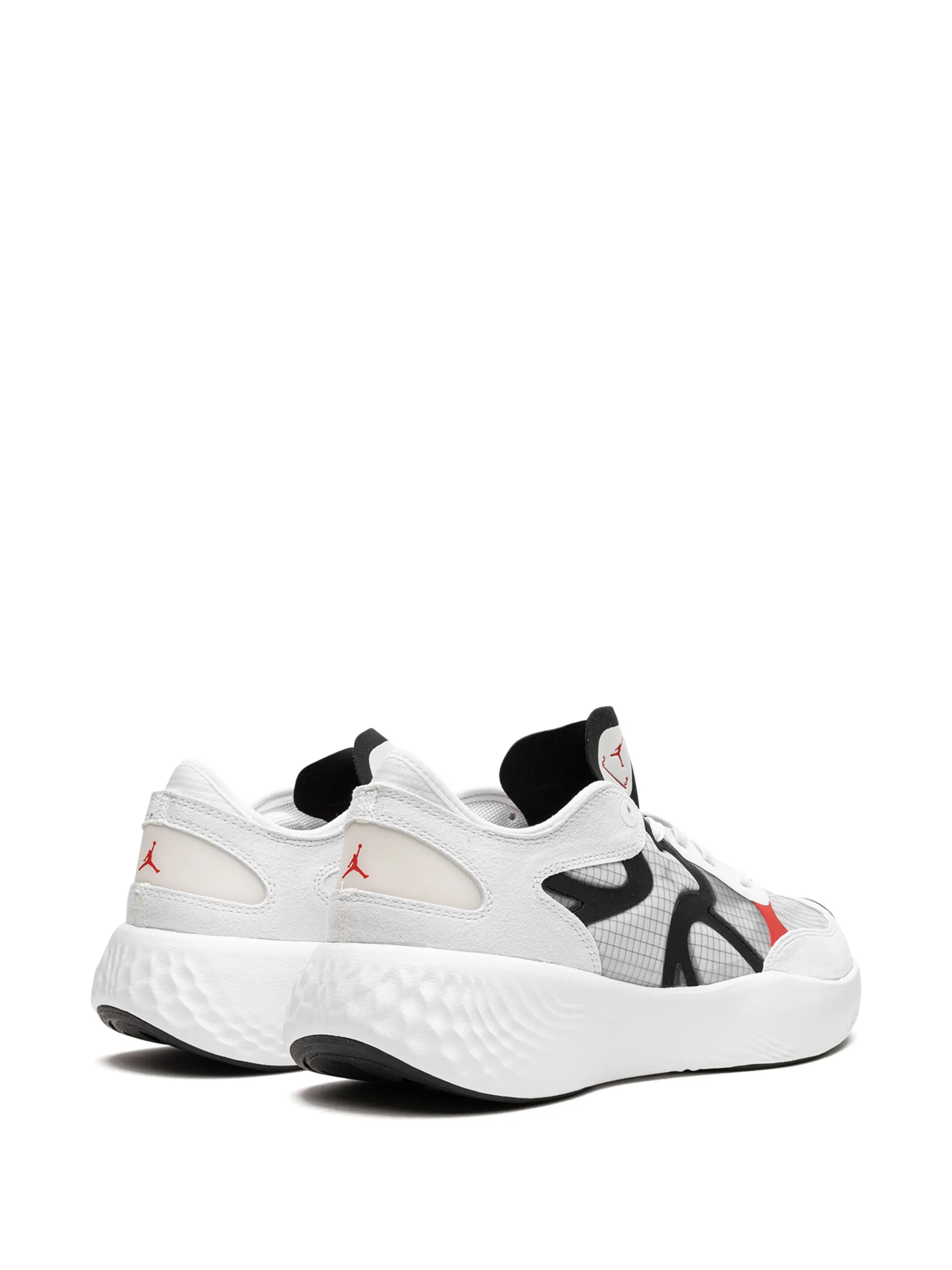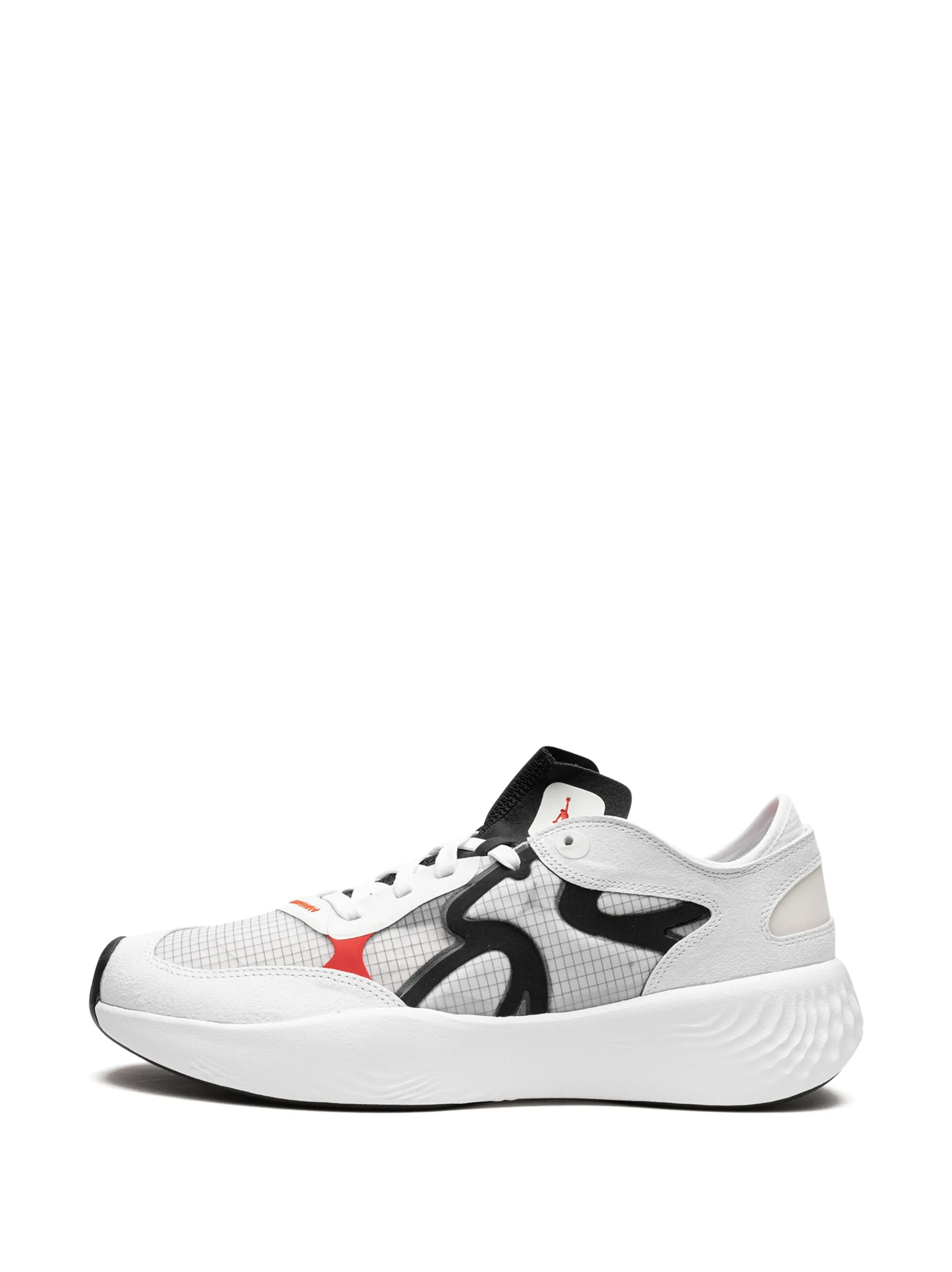 Белый, черный/красный, замшевые вставки, клетчатый узор, логотип Jumpman, закругленный носок, шнуровка спереди, стелька с логотипом и резиновая подошва.