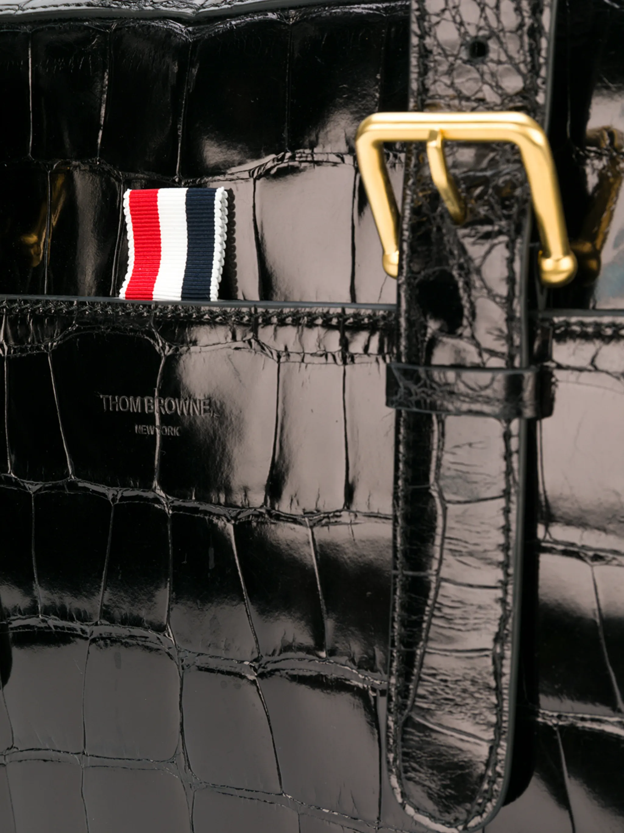 Сумка из кожи аллигатора от Thom Browne (Том Браун). Верхние ручки, ручки с пряжкой, застежка на молнии сверху, главный внутренний отдел, внутренний карман на молнии, внутренняя вставка с логотипом, передний накладной карман, задний прорезной карман и золотистая фурнитура.