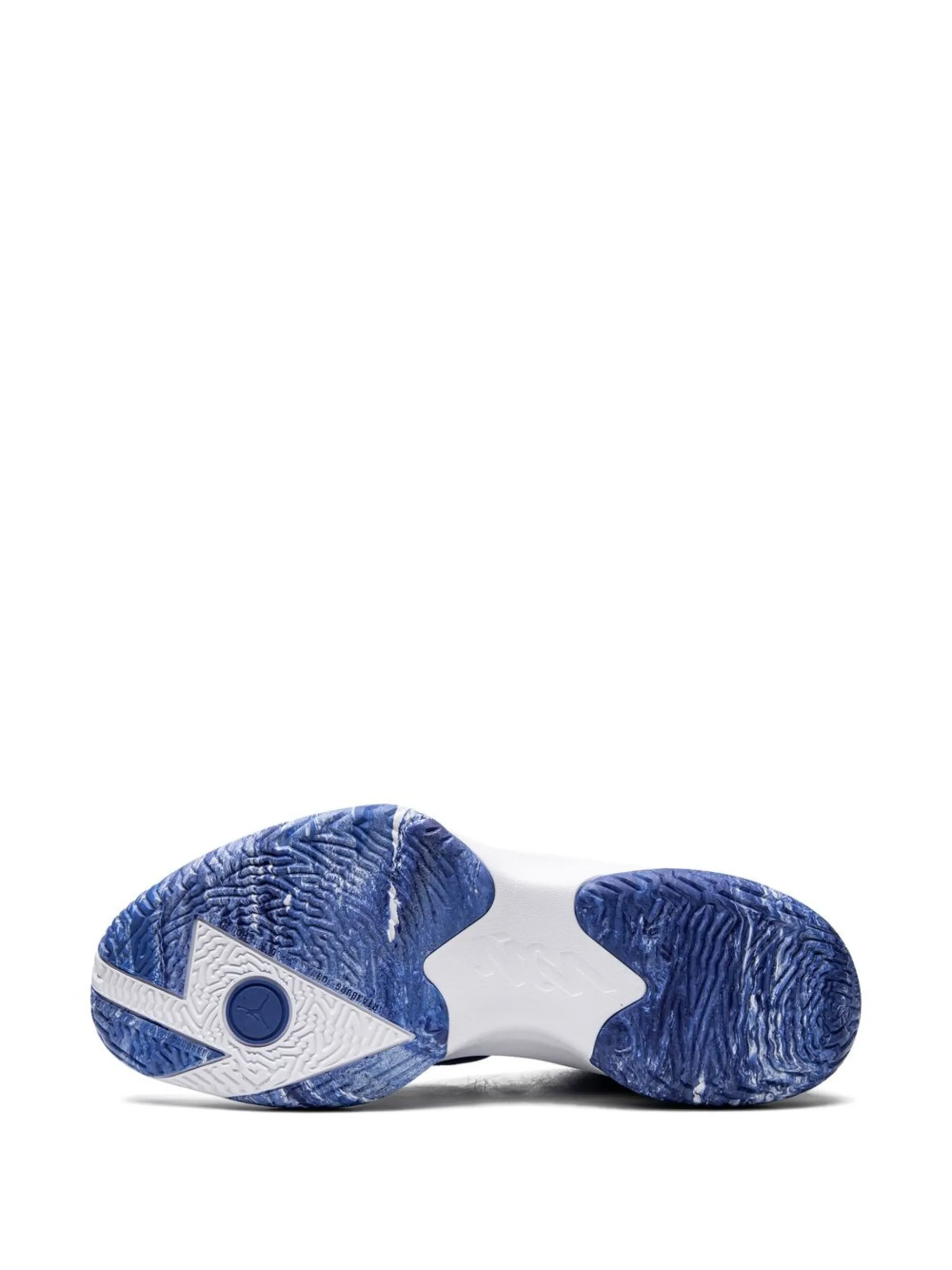 Синий, белый, логотип Jumpman, контрастные вставки, закругленный носок, шнуровка спереди, стелька с логотипом и резиновая подошва.