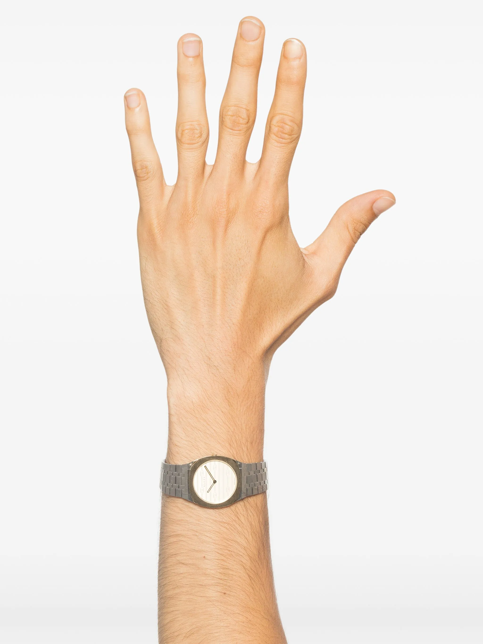 Круглый корпус, логотип GG, браслет из нержавеющей стали, водонепроницаемость до 30 метров/3 АТМ, сапфировое стекло, кварцевый механизм и антибликовое покрытие.