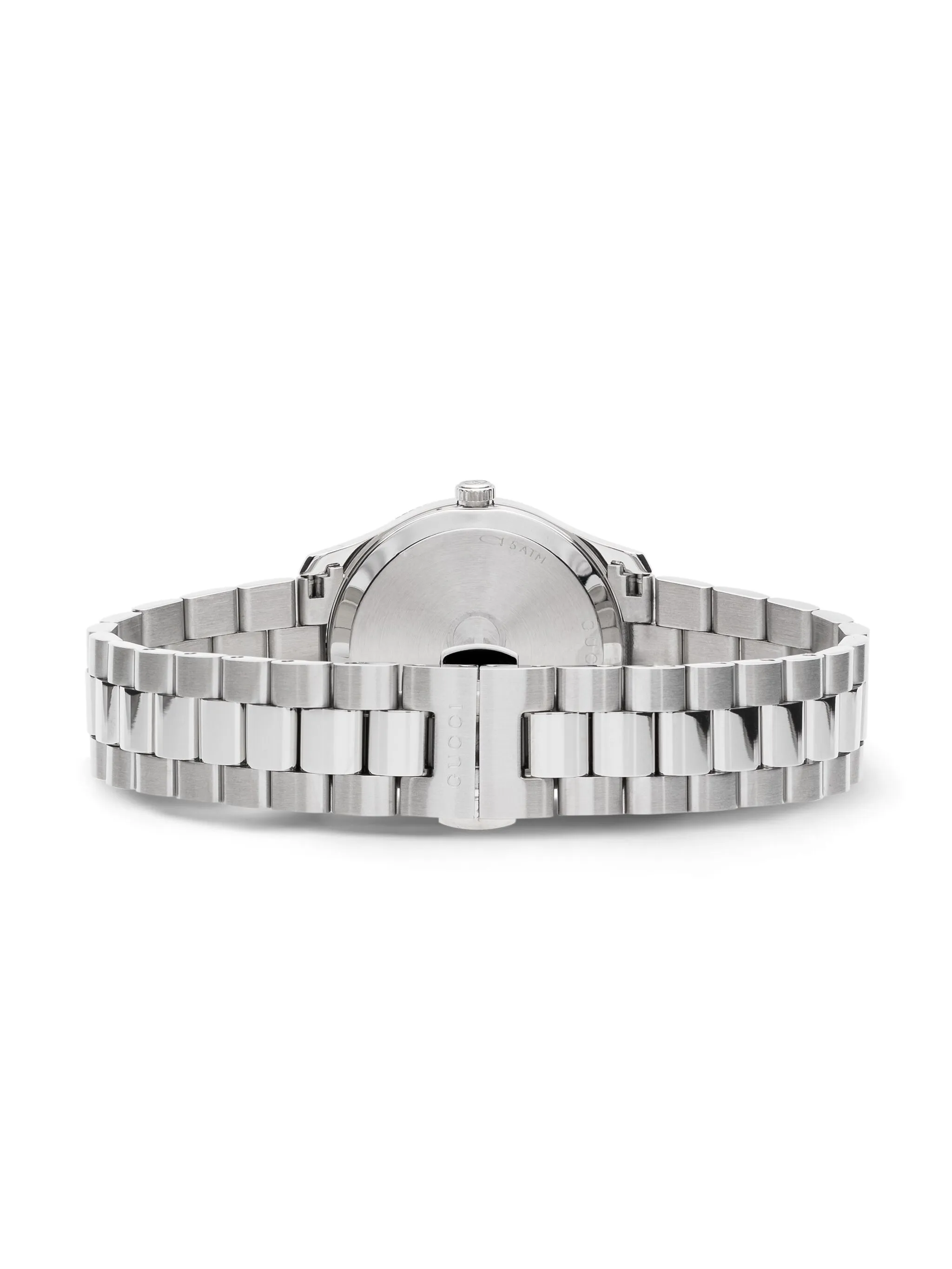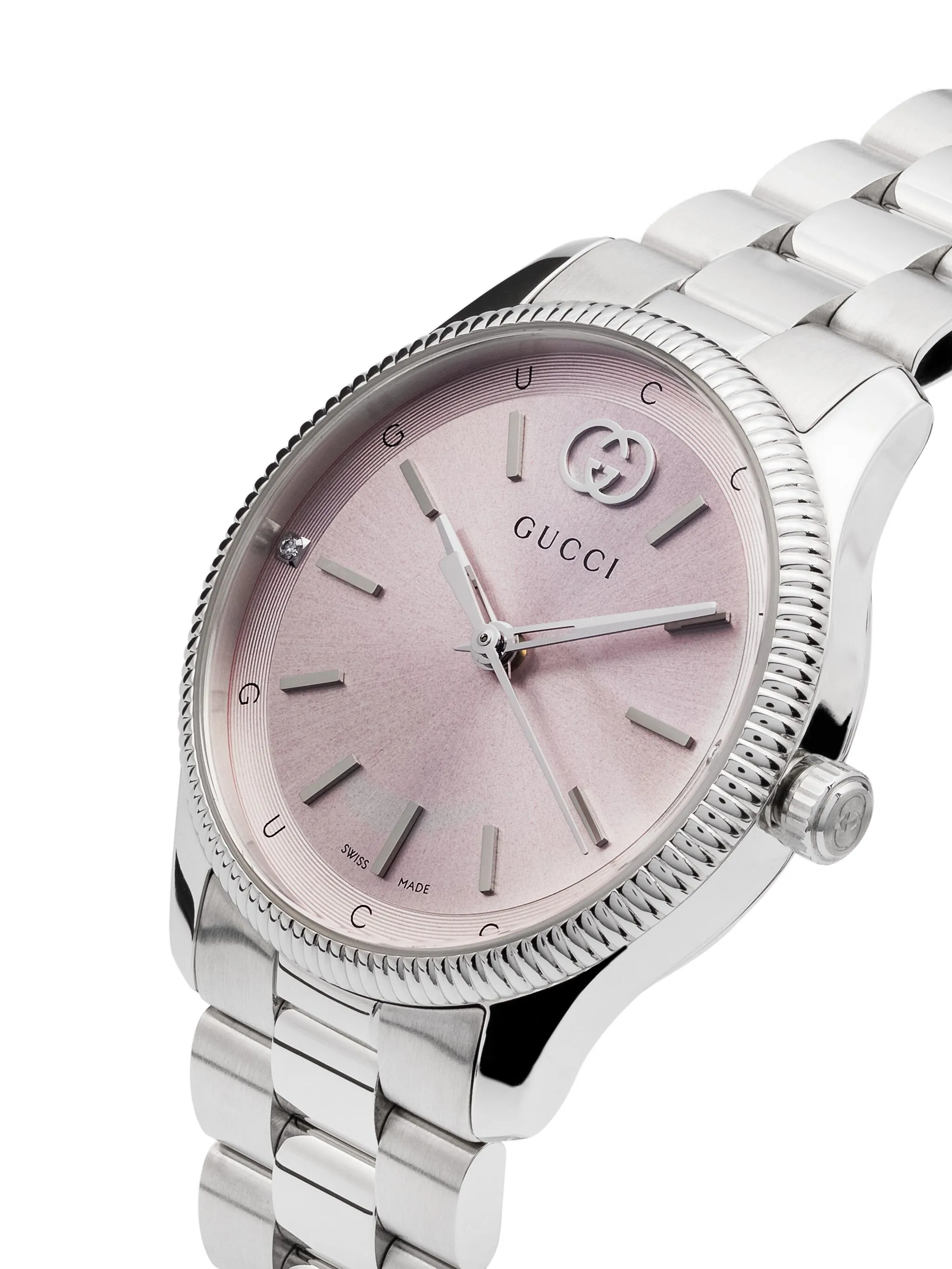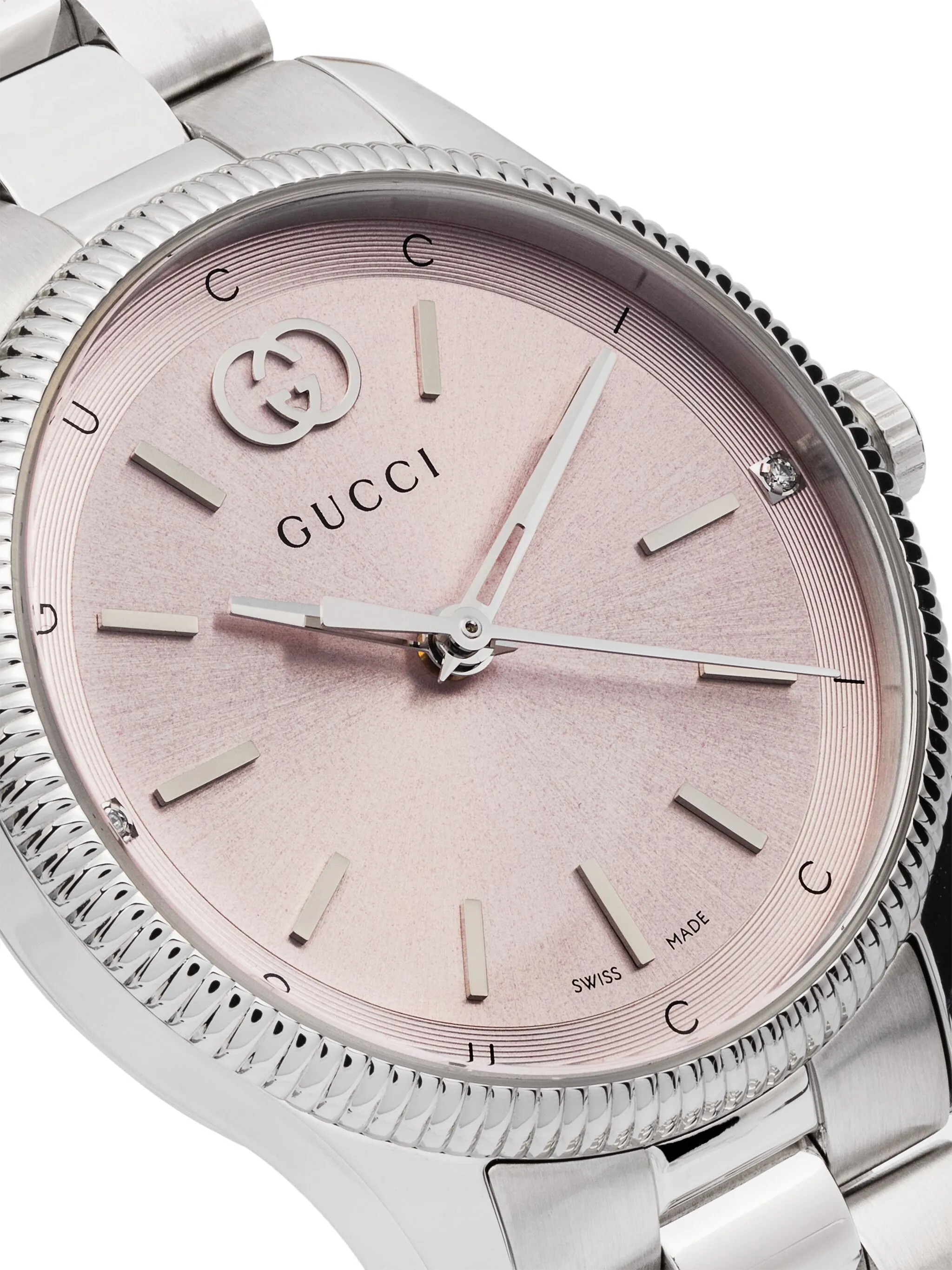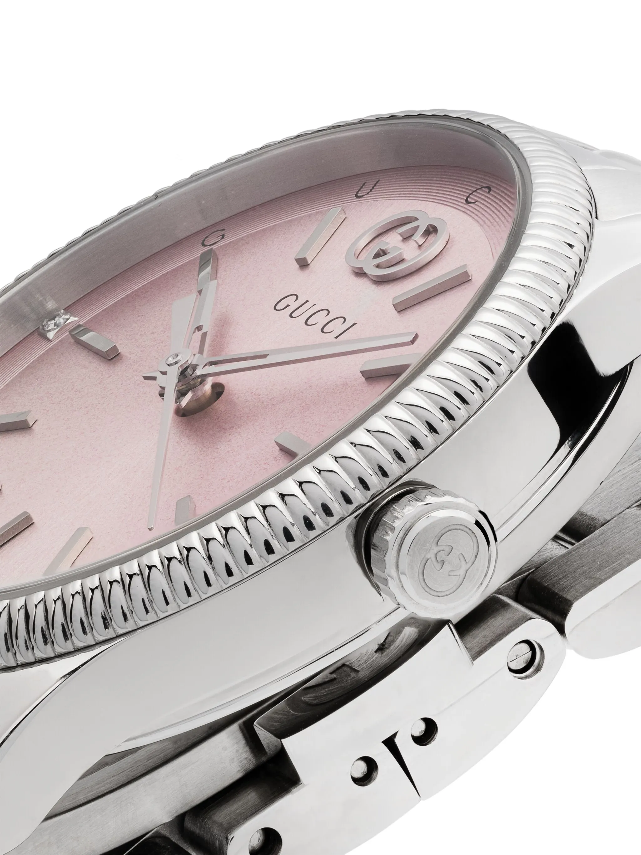 • Розовый циферблат с логотипом Interlocking G, логотипом-надписью и двумя бриллиантами