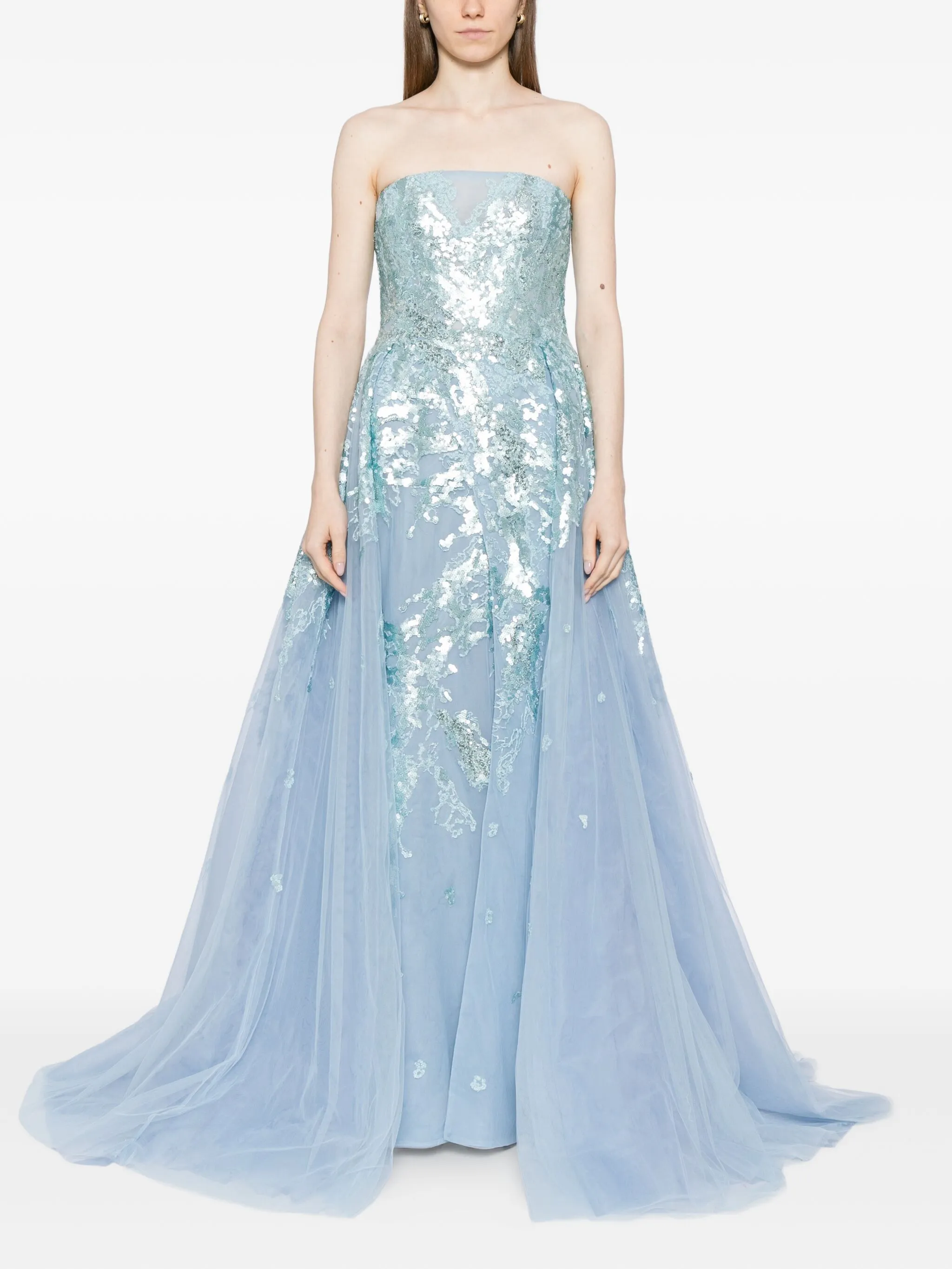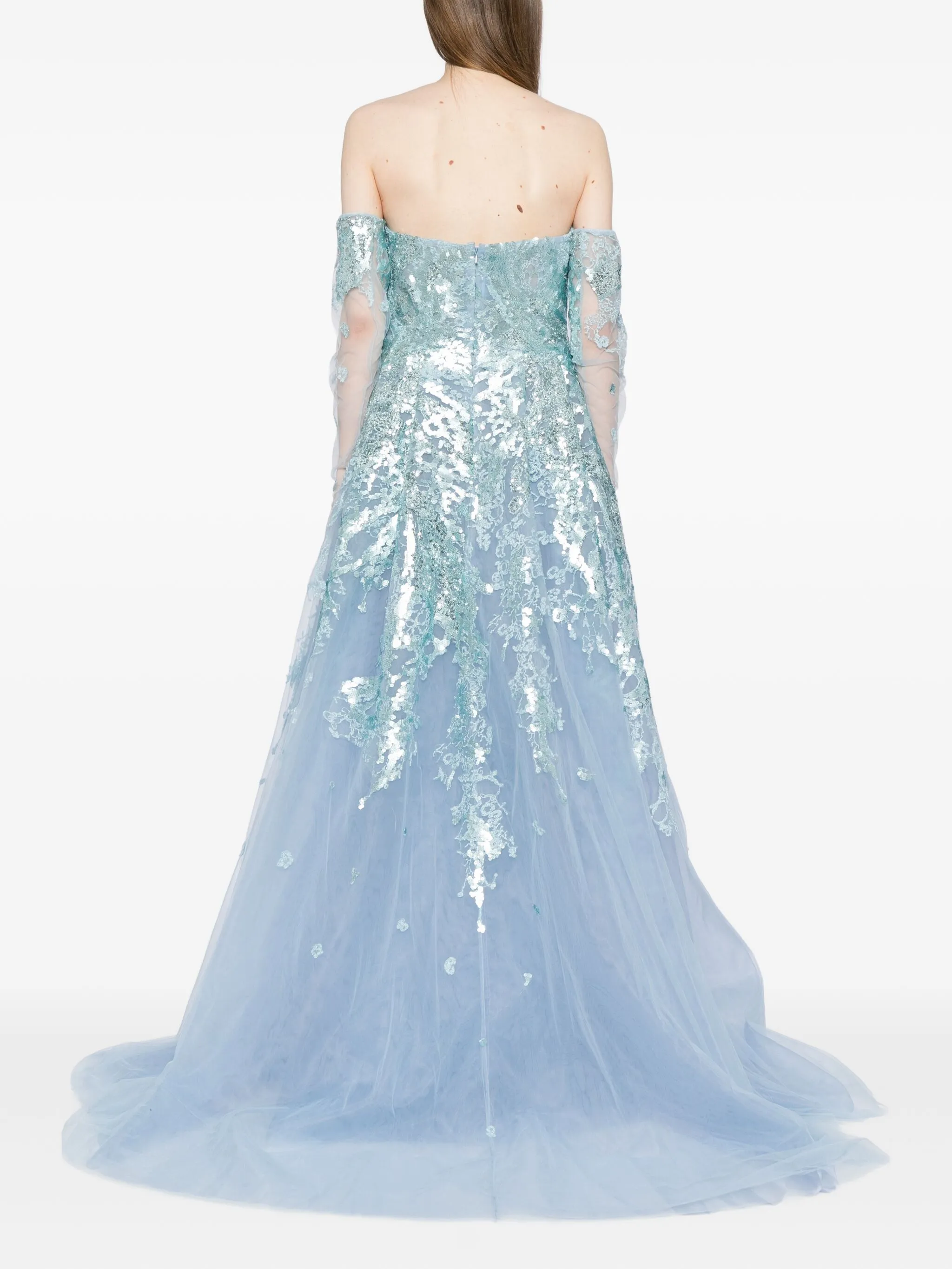 • Потайная застежка на крючках и молнии сзади